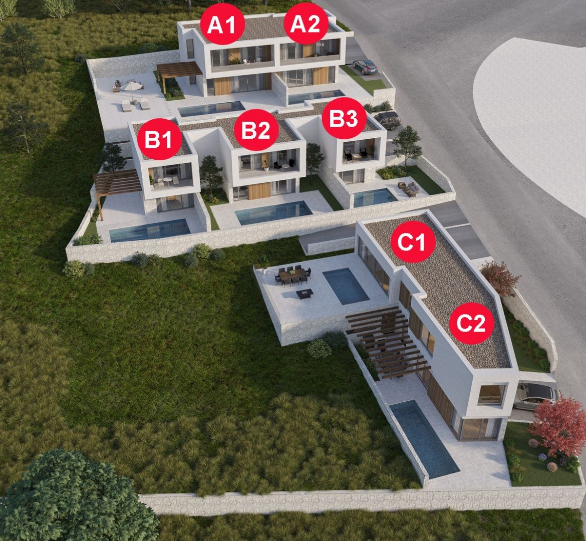 CRIKVENICA - Moderní vila s bazénem a panoramatickým výhledem Crikvenica je jedno z nejžádanějších pobřežních měst na severním Jadranu, známé svým příjemným klimatem, dobře udržovanými plážemi, dlouhou promenádou podél moře a dobrým dopravním spojením, což z něj činí ideální místo pro bydlení, dovolenou nebo dlouhodobou investici. V klidné a vyvýšené lokalitě se rozvíjí projekt moderních dvojdomků – celkem sedm jednotek – navržených s pečlivě promyšlenou architekturou, funkčním uspořádáním a důrazem na kvalitu života, s otevřeným výhledem na moře a město. Vyvýšená poloha navíc zajišťuje soukromí a klid, přičemž všechna klíčová zařízení Crikvenice zůstávají rychle dostupná. Vila A1 nabízí celkovou obytnou plochu 102,6 m² rozloženou na dvou podlažích. V přízemí se nachází prostorný obývací pokoj s kuchyní a jídelnou, jedna ložnice a koupelna, což je ideální jak pro rodinný život, tak pro hosty. V patře se nacházejí tři ložnice, hlavní s vlastní koupelnou, zatímco další dvě sdílejí další koupelnu, čímž se dosahuje vynikající rovnováhy mezi soukromím a praktičností. Venkovní prostor dále zvyšuje hodnotu nemovitosti: soukromá zahrada o rozloze 151 m² zahrnuje terasu, bazén a sluneční terasu, která vytváří dojem samostatně stojícího domu a je ideálním místem pro relaxaci a setkávání s výhledem na moře. Projekt je navržen jako dlouhodobé a kvalitní řešení s podlahovým vytápěním ve všech místnostech a kvalitními hliníkovými truhlářskými prvky, spolu s moderními povrchovými materiály. K dispozici je vinylová podlaha (LVT nebo SPC) s možností výběru dalších krytin dle přání kupujícího a ke každé jednotce patří také jedno parkovací místo. Kupujícím jsou nabízeny mimořádně výhodné podmínky koupě a financování, včetně slev na zálohy a možnosti platby ve fázích během výstavby, s jasně definovanými a transparentními podmínkami. Pro více informací o této nemovitosti a celém projektu kontaktujte agenturu DUX Nekretnine a zajistěte si svou příležitost včas - počet jednotek je omezený.