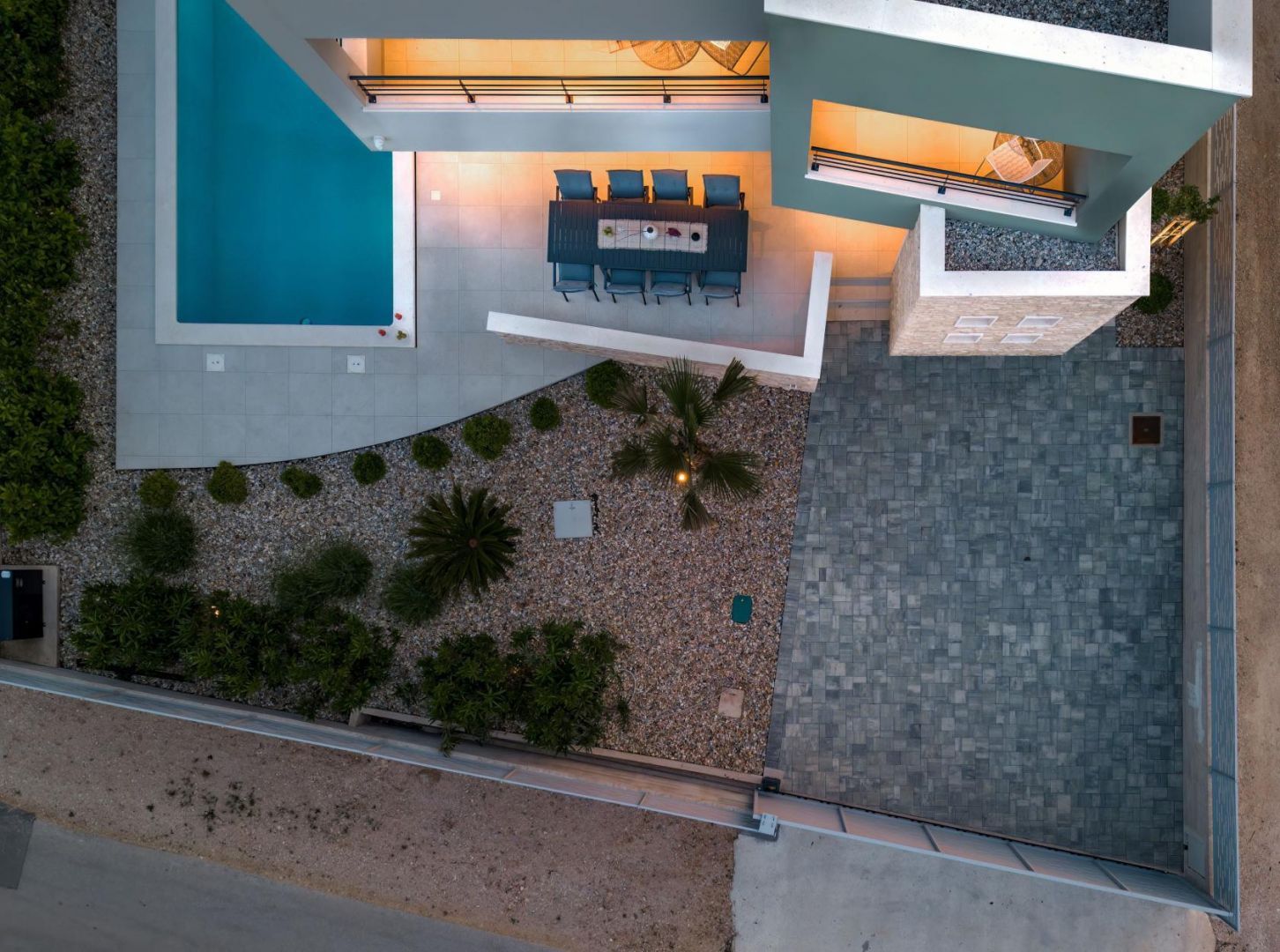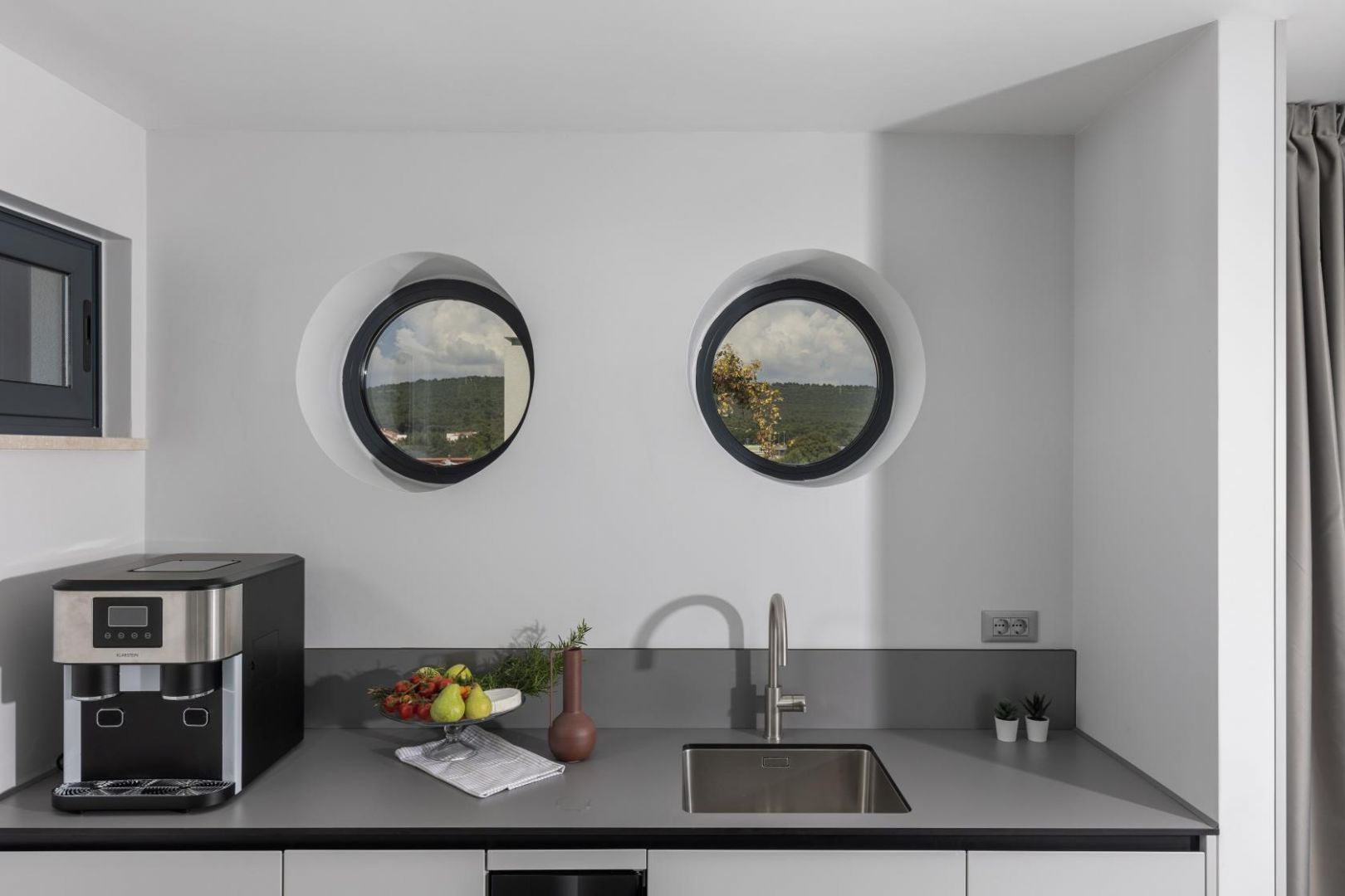 Vila byla pečlivě navržena a vyzdobena renomovanými chorvatskými architekty a designéry s důrazem na maximální využití prostoru a komfort bydlení. Každý detail byl pečlivě promyšlen tak, aby váš pobyt ve vile poskytoval úplný pocit pohodlí, relaxace a luxusu. V přízemí se nachází elegantně zařízená kuchyň s jídelním koutem, prostorný obývací pokoj s krbem a velkou rohovou pohovkou, šatní skříň, koupelna a další toaleta. Z obývacího pokoje je vstup na terasu s vyhřívaným bazénem, letní kuchyní s grilem a venkovním jídelním koutem, zatímco na druhé straně se nachází soukromá sauna pro úplnou relaxaci.