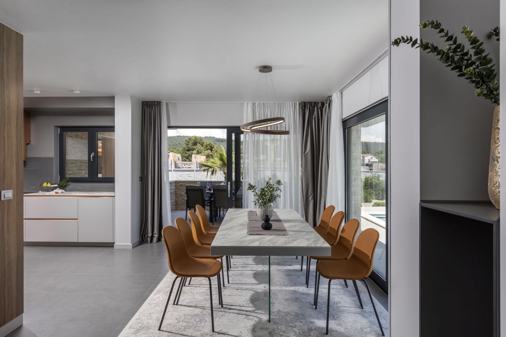 Tato krásná, moderně navržená vila se nachází na jedinečném místě v Bibinje, pouhých 350 metrů od moře a v bezprostřední blízkosti Mariny Dalmacija - největšího přístavu na Jadranu. Vila nabízí podmanivý výhled na les stožárů v přístavu a zelené kopce nad Bibinje, což dodává každému okamžiku vašeho pobytu zvláštní středomořskou atmosféru.