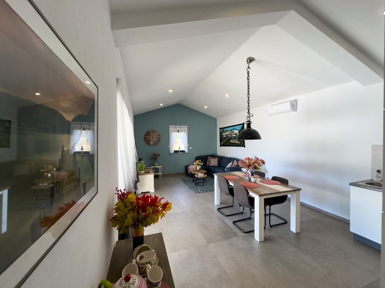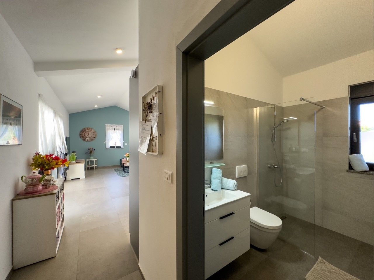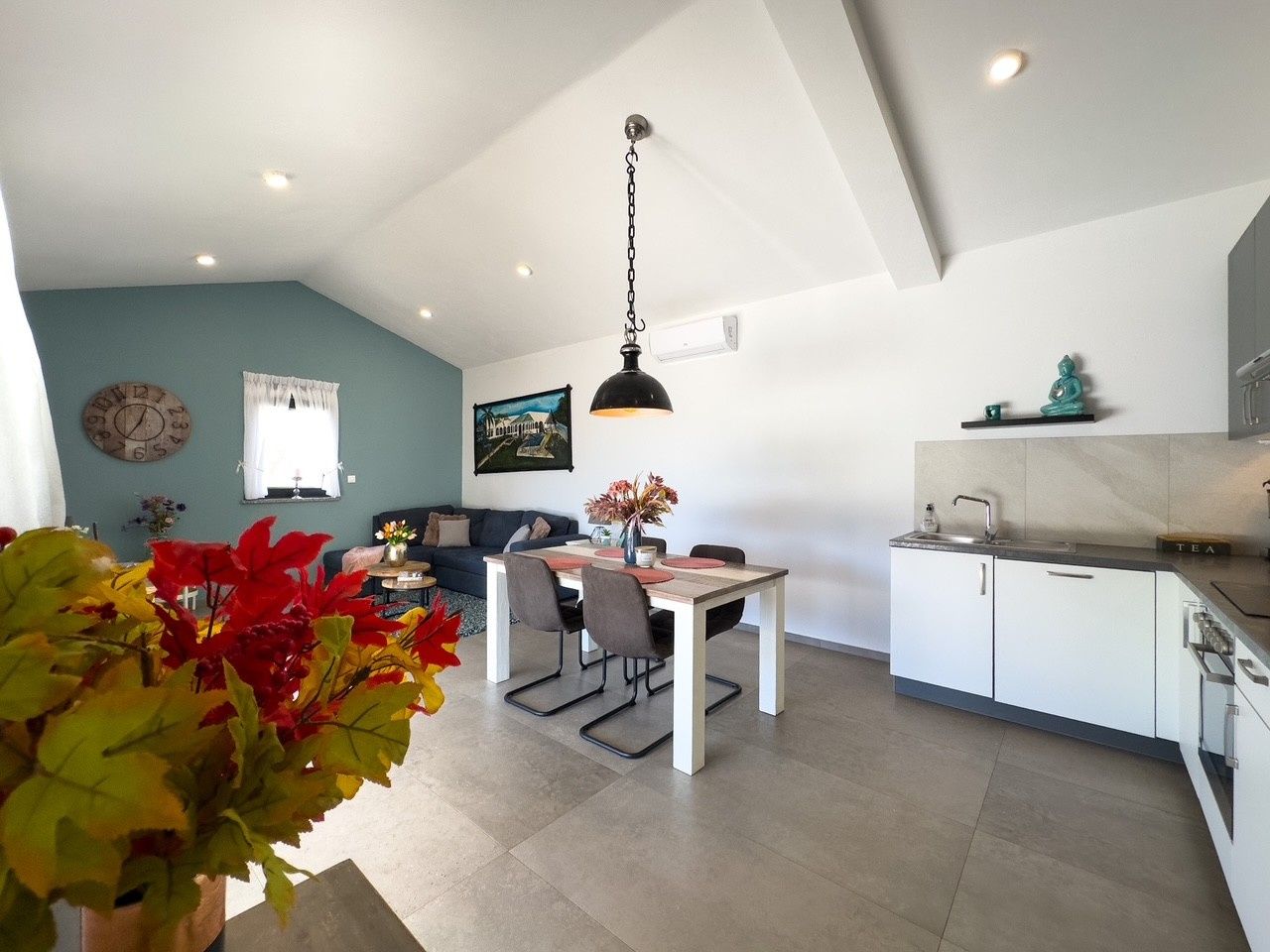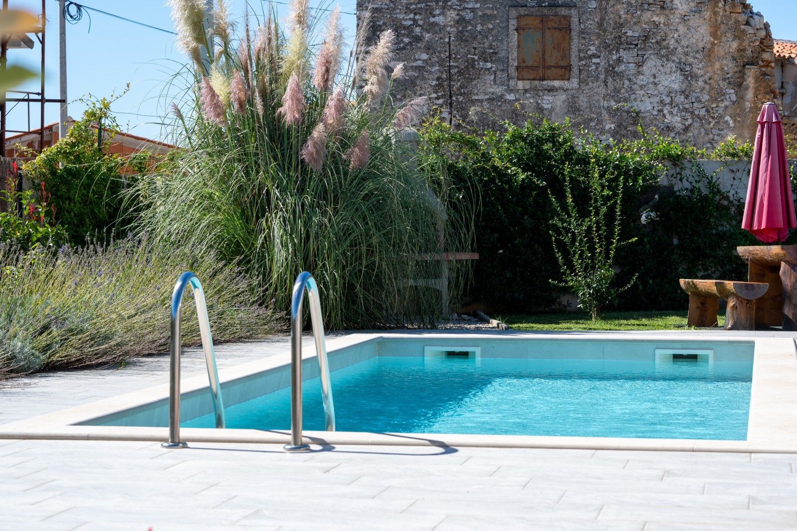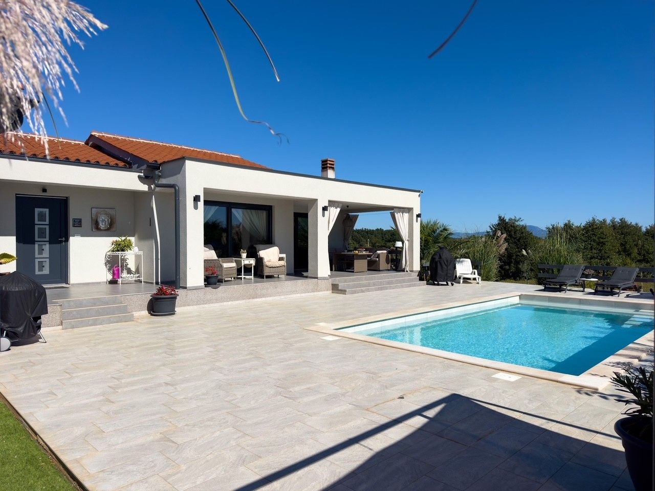 Prodáváme dvě spojené domy. Každý dům má vlastní bazén. Větší dům (120 m²) se skládá ze tří ložnic, jedna má vlastní koupelnu, zatímco další dvě sdílejí koupelnu. Kuchyň, jídelna a obývací pokoj, ze kterého je výhled na Učku a zeleň. Podlahové topení, trojité sklo, krb, klimatizace v každé místnosti. Bazén s elektrolýzou, parkování pro více vozidel. Menší dům (84 m²) se skládá ze dvou ložnic, koupelny, toalety, kuchyně, jídelny a obývacího pokoje, ze kterého se vychází na zahradu a bazén. Klimatizace v každé místnosti, parkování pro více vozidel s nabíječkou pro elektrická auta. Oba domy se prodávají kompletně vybavené a připravené k bydlení nebo turistickému pronájmu.