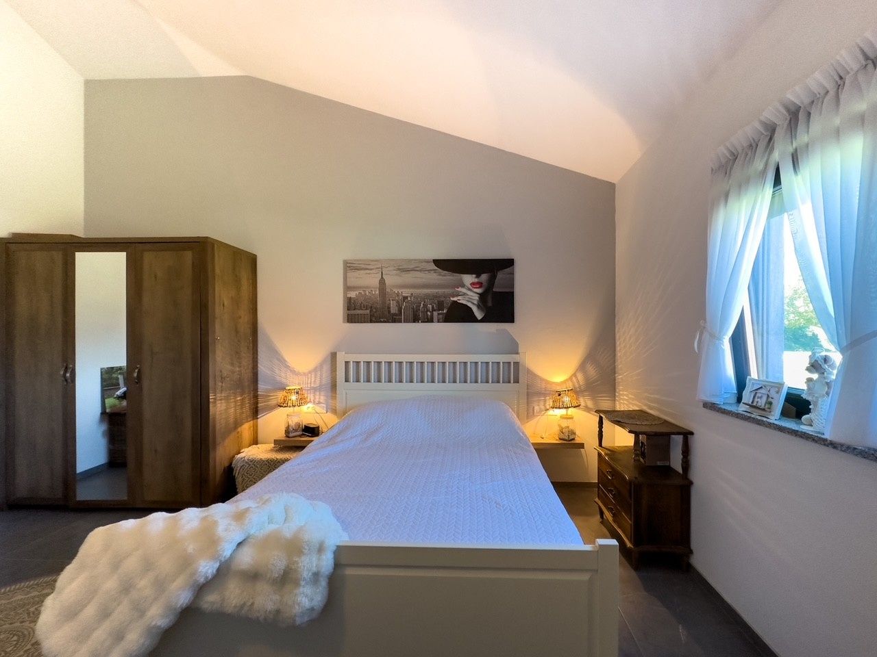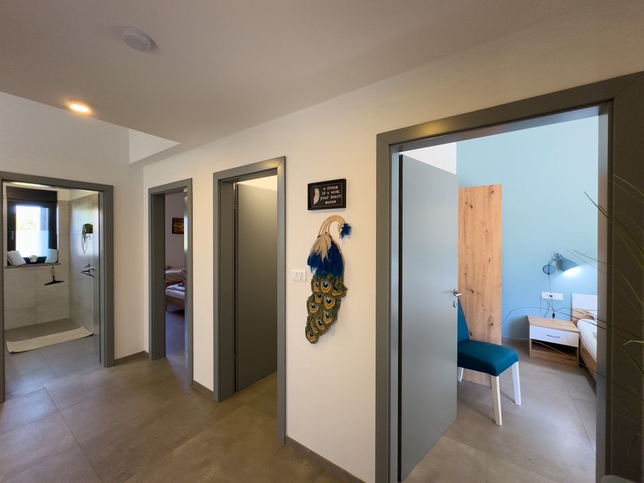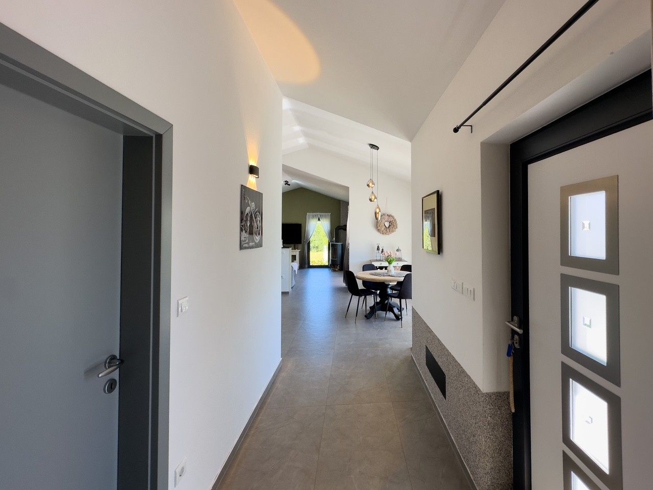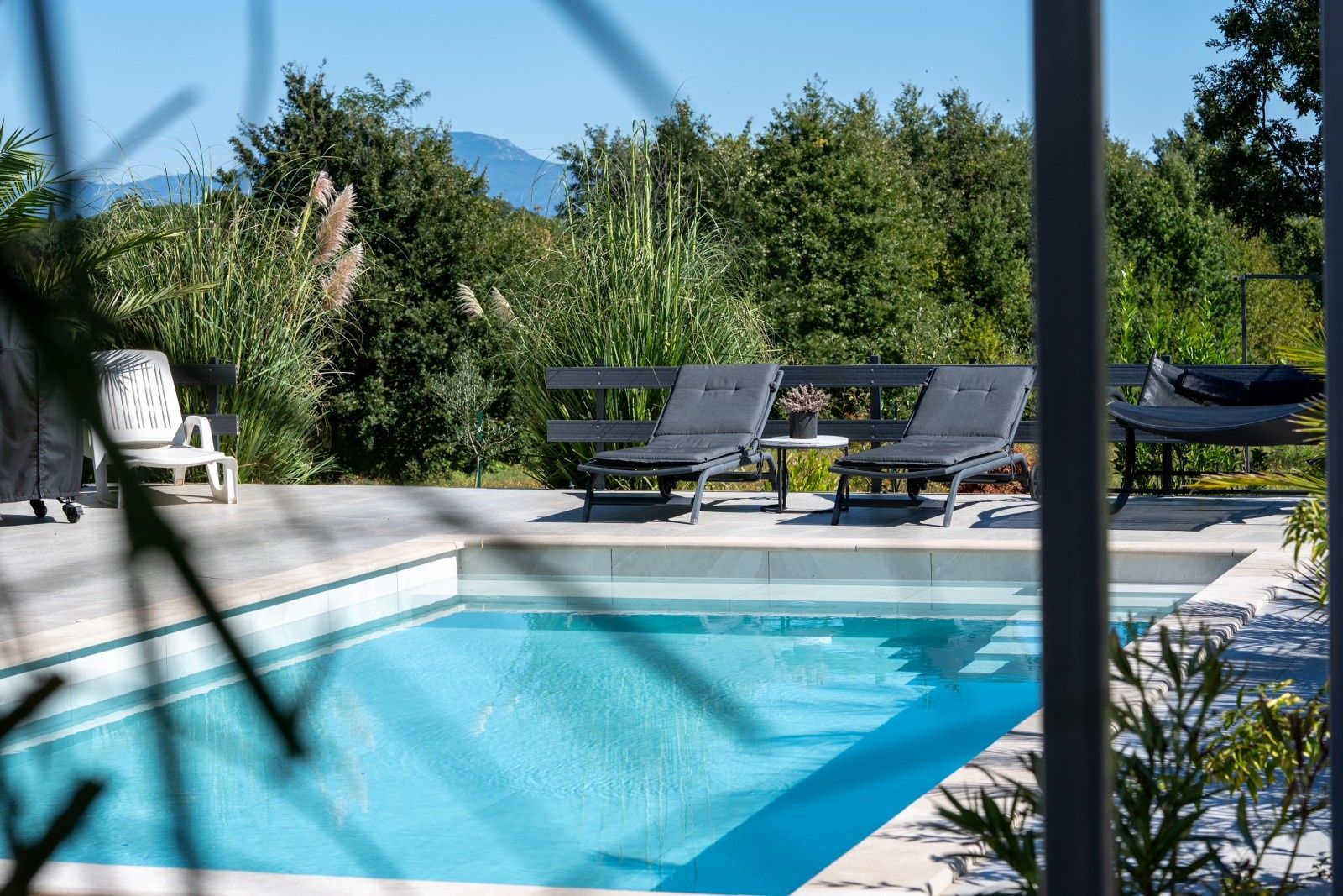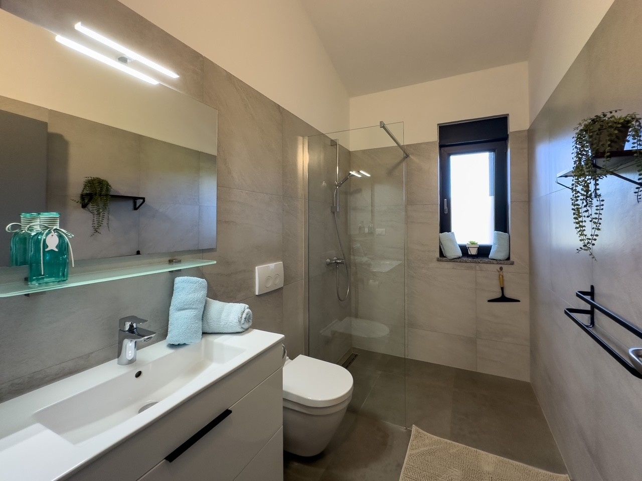 Prodáváme dvě spojené domy. Každý dům má vlastní bazén. Větší dům (120 m²) se skládá ze tří ložnic, jedna má vlastní koupelnu, zatímco další dvě sdílejí koupelnu. Kuchyň, jídelna a obývací pokoj, ze kterého je výhled na Učku a zeleň. Podlahové topení, trojité sklo, krb, klimatizace v každé místnosti. Bazén s elektrolýzou, parkování pro více vozidel. Menší dům (84 m²) se skládá ze dvou ložnic, koupelny, toalety, kuchyně, jídelny a obývacího pokoje, ze kterého se vychází na zahradu a bazén. Klimatizace v každé místnosti, parkování pro více vozidel s nabíječkou pro elektrická auta. Oba domy se prodávají kompletně vybavené a připravené k bydlení nebo turistickému pronájmu.