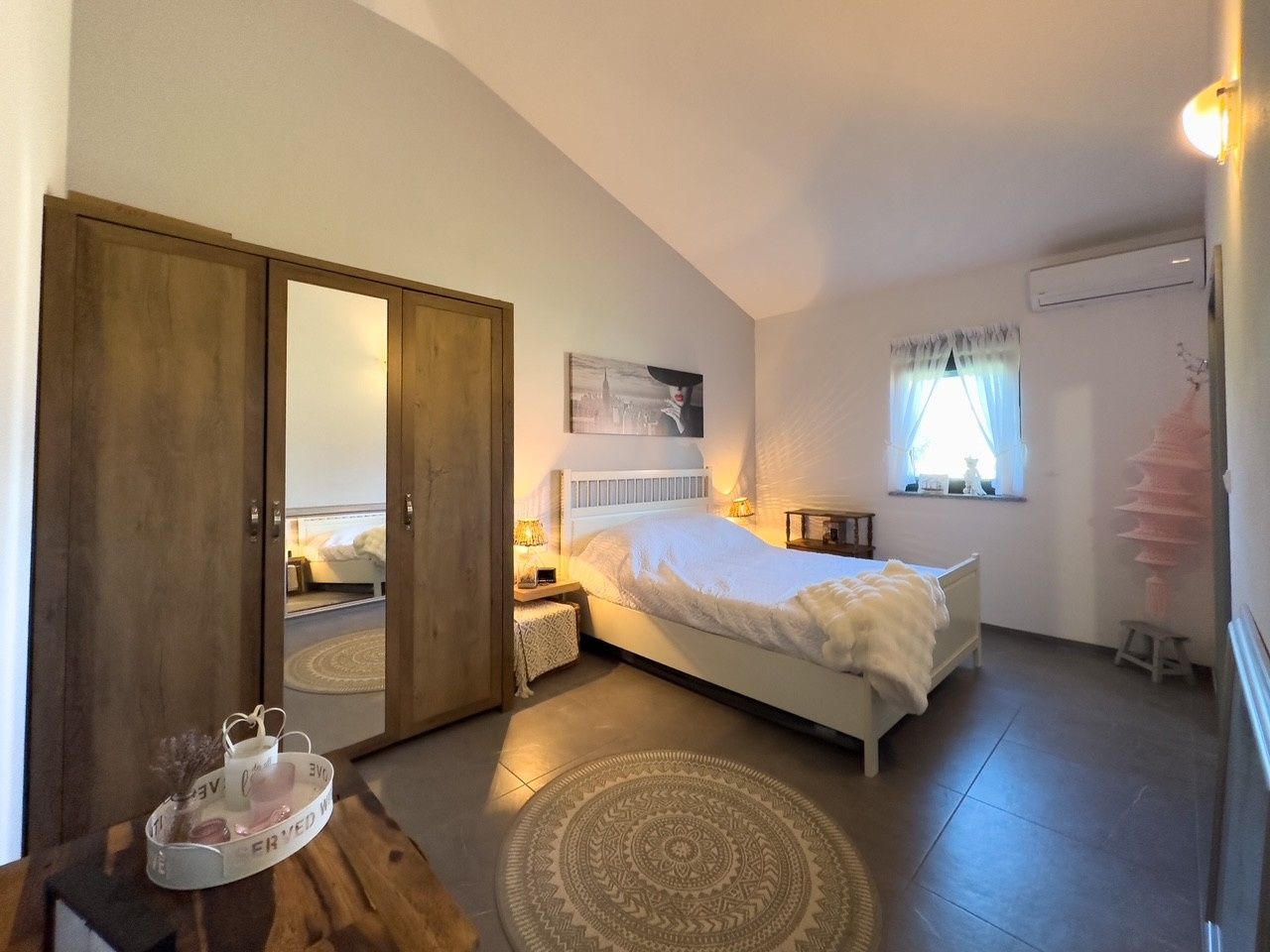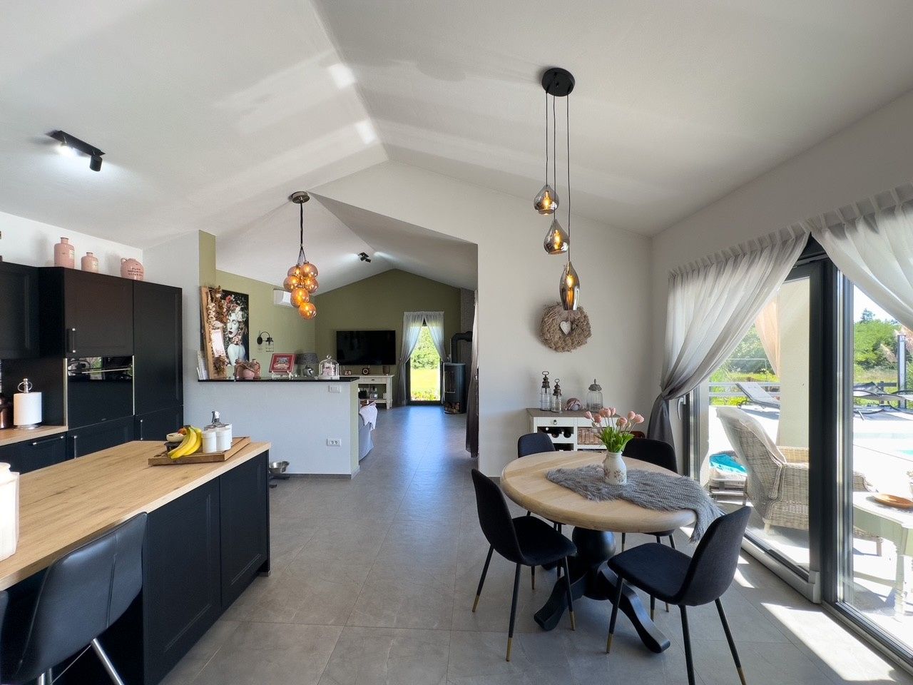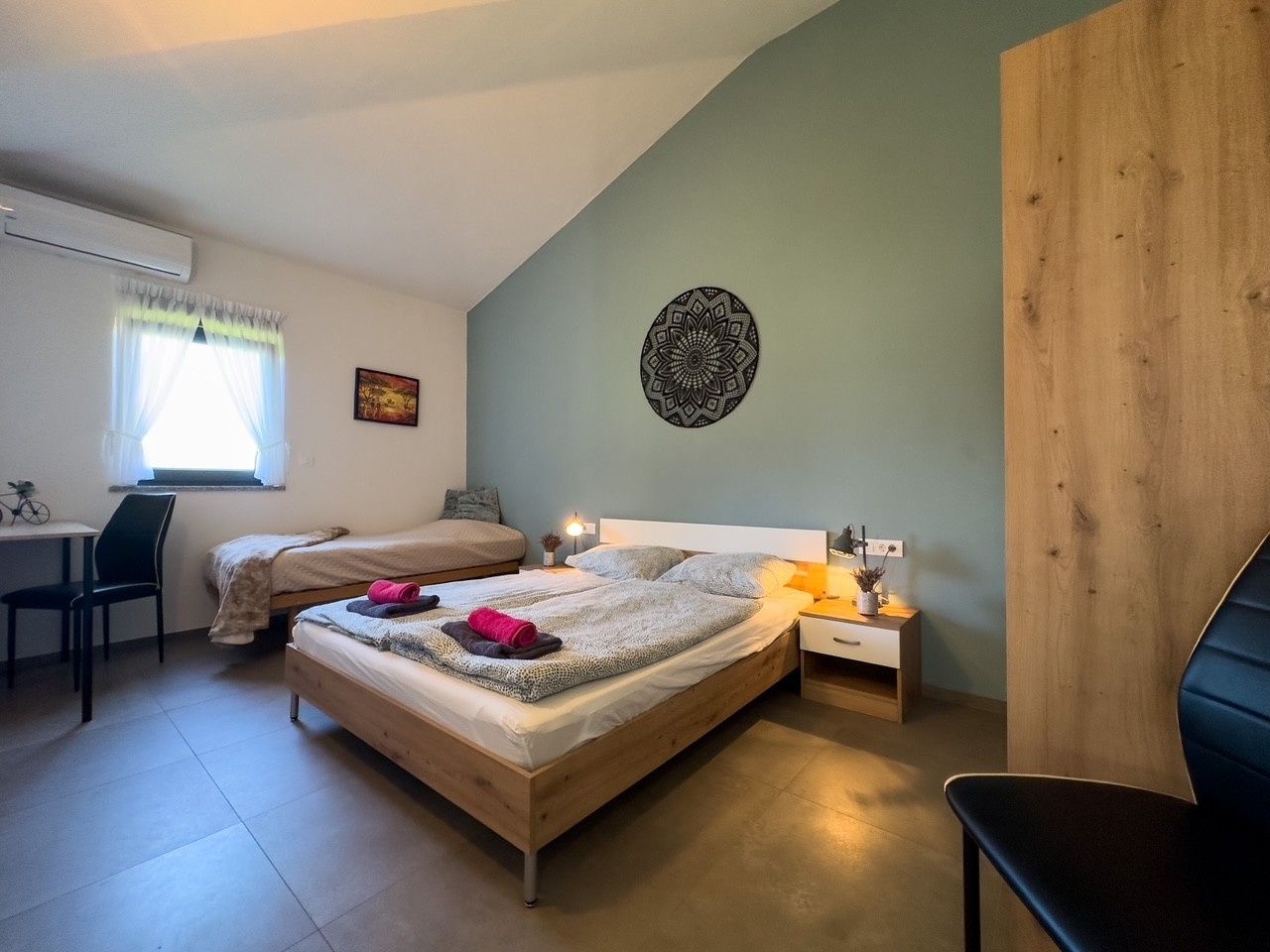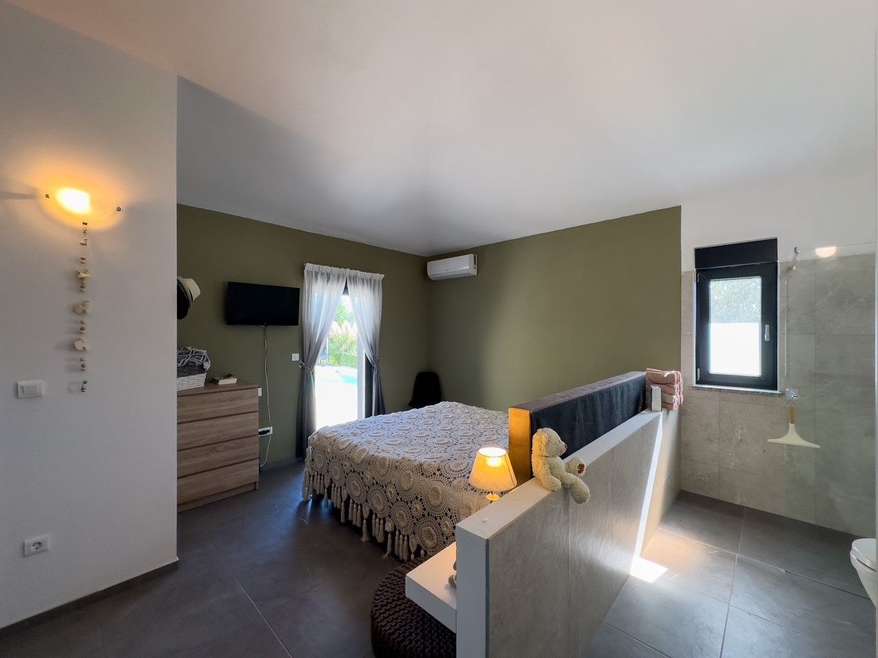 Prodáváme dvě spojené domy. Každý dům má vlastní bazén. Větší dům (120 m²) se skládá ze tří ložnic, jedna má vlastní koupelnu, zatímco další dvě sdílejí koupelnu. Kuchyň, jídelna a obývací pokoj, ze kterého je výhled na Učku a zeleň. Podlahové topení, trojité sklo, krb, klimatizace v každé místnosti. Bazén s elektrolýzou, parkování pro více vozidel. Menší dům (84 m²) se skládá ze dvou ložnic, koupelny, toalety, kuchyně, jídelny a obývacího pokoje, ze kterého se vychází na zahradu a bazén. Klimatizace v každé místnosti, parkování pro více vozidel s nabíječkou pro elektrická auta. Oba domy se prodávají kompletně vybavené a připravené k bydlení nebo turistickému pronájmu.