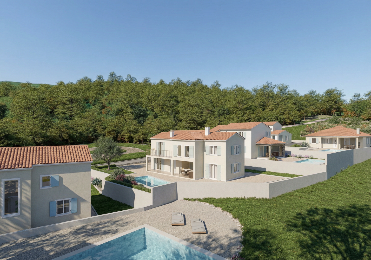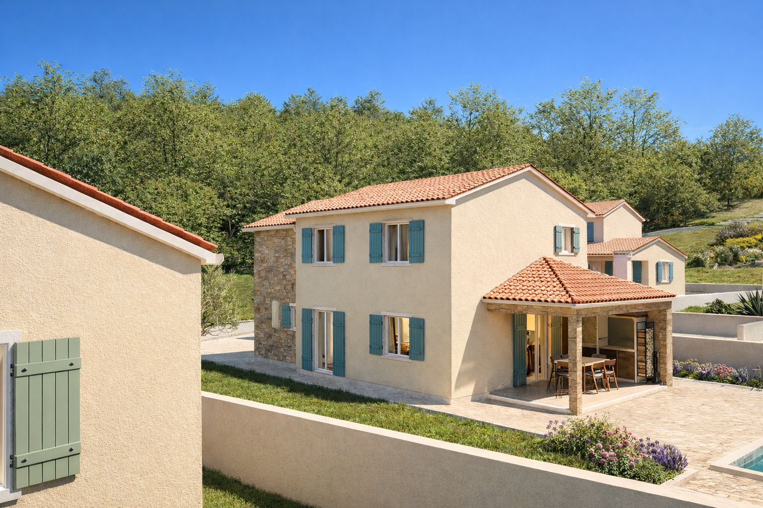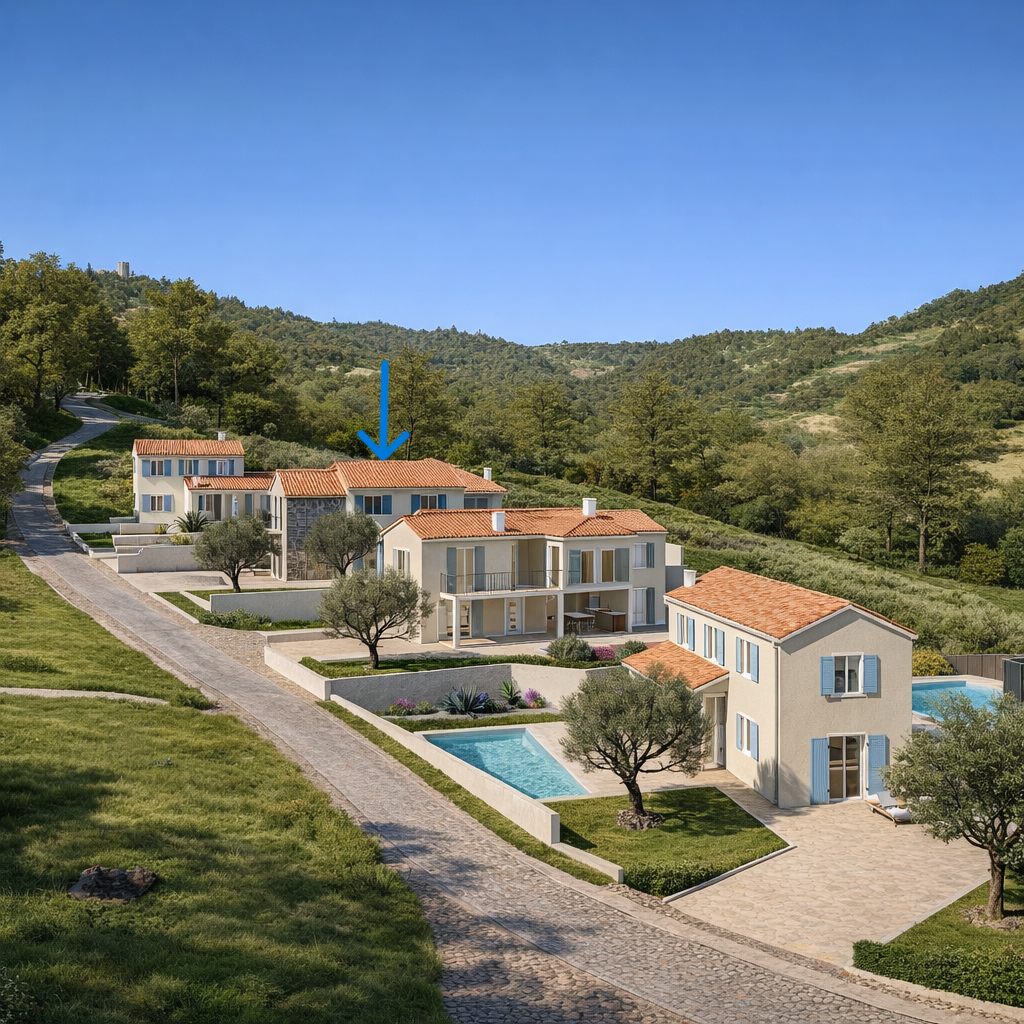 ISTRIE, PIĆAN - Nově postavená vila umístěná v klidném prostředí Pićan je staleté istrijské město s bohatým materiálním a kulturním dědictvím. Je to místo na kopci, ze kterého je ze všech stran neodolatelný výhled na okolní města, vinice, olivové háje a Učka. Pican je známý svými krásnými vyhlídkami a dobrým vínem a také mnoha slavnými legendami. Byla zde postavena zvonice, třetí největší na Istrii, vysoká 48 m. Známé jsou turistické stezky sv. Roka a sv. Šimuna a také krásný Sopotský vodopád. V mírném prostředí nedaleko samotného města se nachází tato rozestavěná moderní vila, která zahrnuje 108 m2 obytné plochy rozložené na dvou podlažích. Tato nemovitost je dokonalou kombinací současného designu a pohodlí a poskytuje ideální prostor pro rodiny nebo kohokoli, kdo hledá klidné útočiště v blízkosti přírody. Přízemí se svými 46,16 m2 nabízí prostornou kuchyň, jídelnu a obývací pokoj, které jsou dokonale propojeny v jeden otevřený prostor. Velká okna umožňují dostatek přirozeného světla a poskytují přímý přístup na krytou terasu, která je ideální pro užívání si čerstvého vzduchu se švitořením ptáků. Přízemí dále nabízí letní kuchyni, kde si můžete připravit své oblíbené pochoutky, koupelnu a další toaletu pro hosty. Tento prostor je dokonale navržen pro rodinný život a umožňuje vám cítit se pohodlně a uvolněně. Vnitřní schodiště vede do horního patra 49,91 m2, kde jsou dvě pohodlné ložnice, každá s vlastní koupelnou. Vila se nachází na pozemku o velikosti 316 m2, kde je prostor pro socializaci s rodinou a přáteli a krásný bazén pro teplé dny. Pro vaše plechové miláčky jsou k dispozici dvě parkovací místa. Pro bezstarostné hraní dětí bude naproti vile vybudován dětský park. Vila se nachází v prostředí, kde převládá příroda a zeleň a tím je zajištěn klid a mír. Nenechte si ujít příležitost stát se majitelem tohoto mimořádného prostoru, kde se každý den stává skutečným požitkem z přírody.