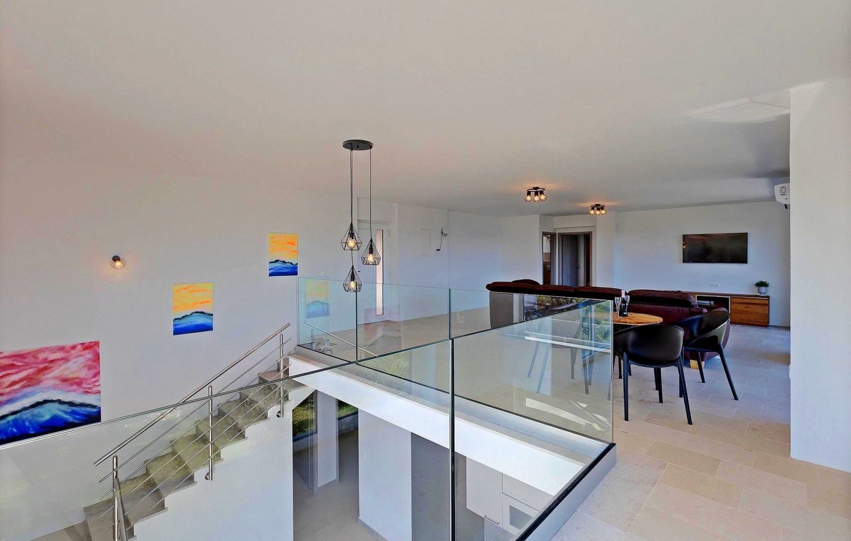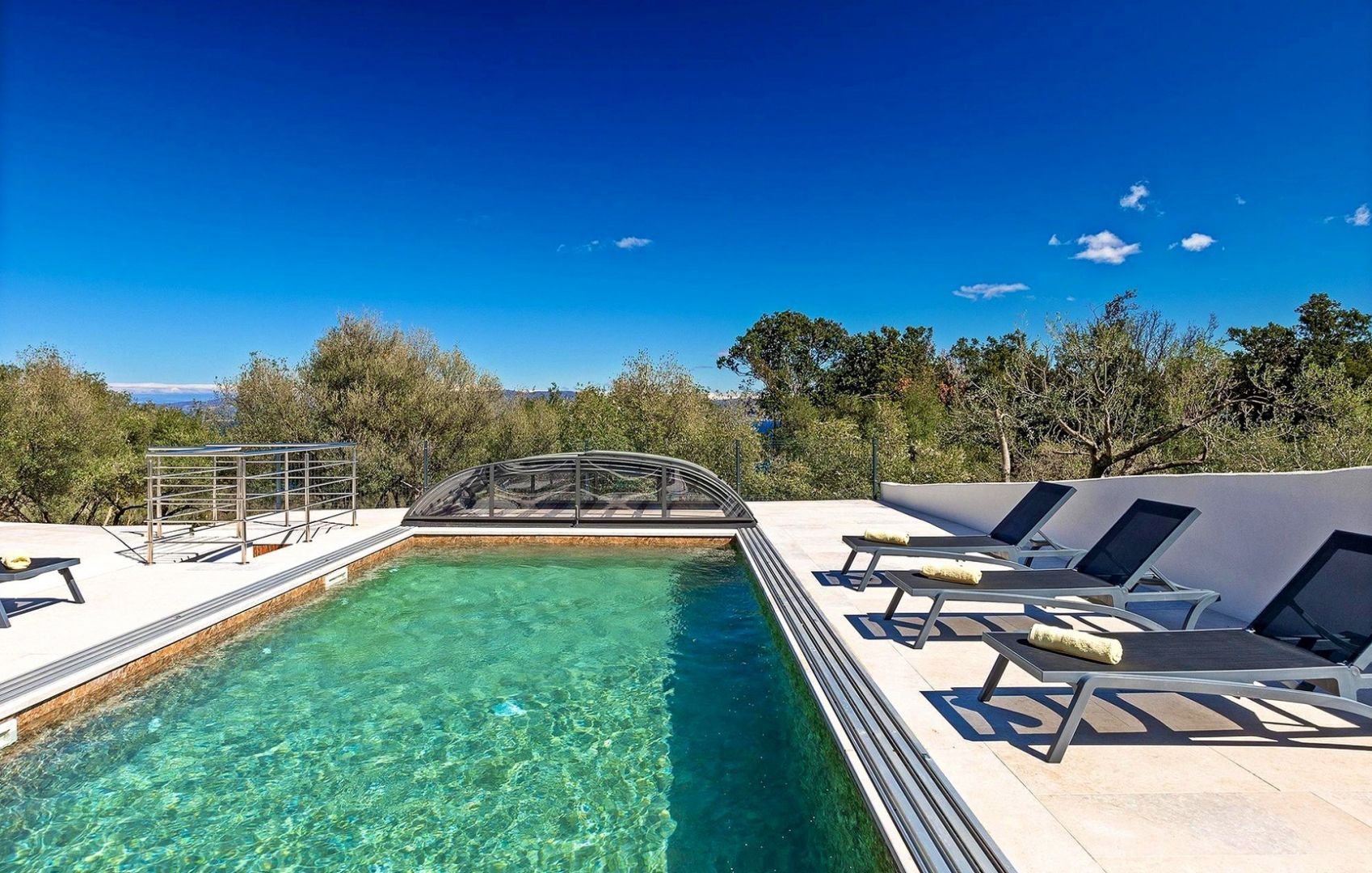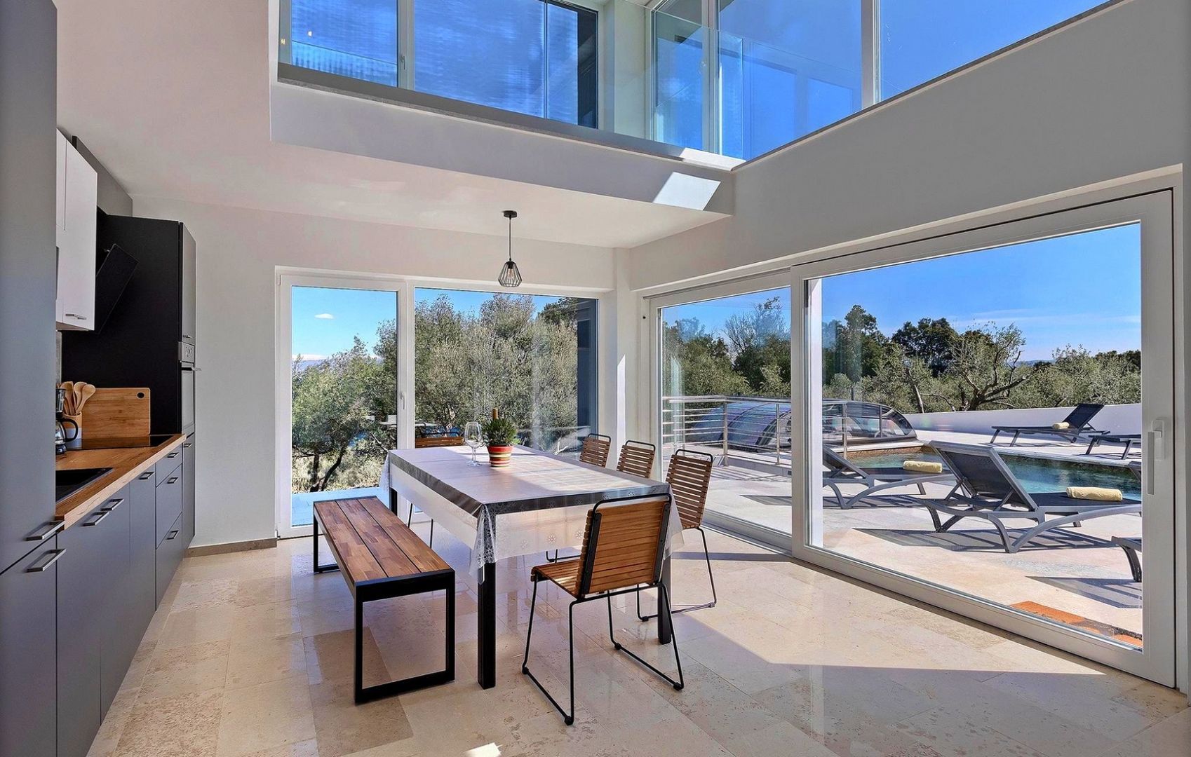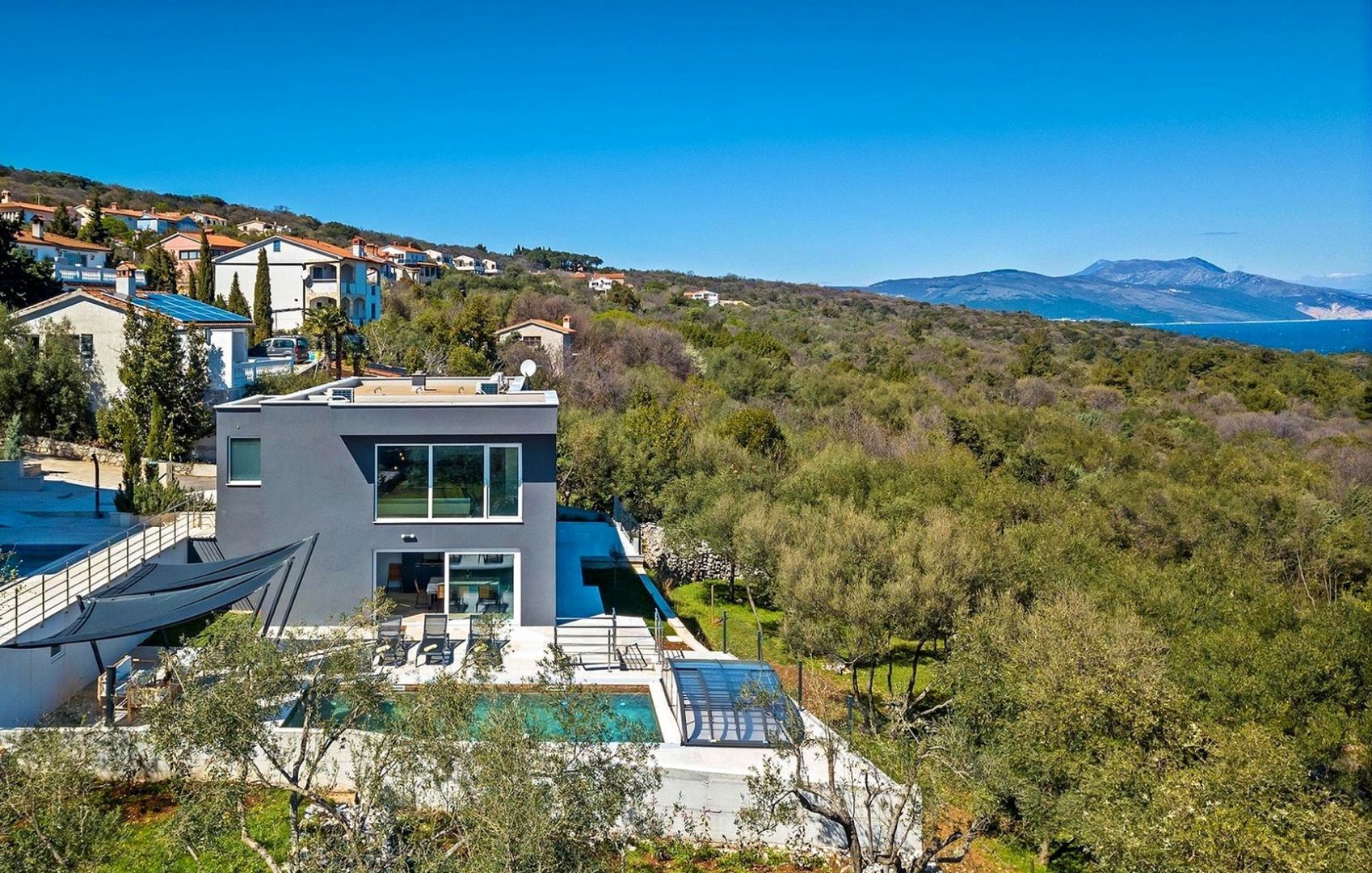 ISTRIA, RABAC - Vila s panoramatickým výhledem na moře Na jihovýchodním pobřeží Istrie, kde se zelené kopce setkávají s mořem, kde se snoubí příroda a dědictví, jsou dvě města podobné velikosti s různými, ale vzájemně se doplňujícími charaktery - Labin a Rabac, vzdálené od sebe pouhé čtyři kilometry. Rabac je díky svým bílým oblázkovým plážím, bohaté středomořské vegetaci a křišťálově čistému moři nazýván perlou Kvarneru. Kdysi malá rybářská vesnička je dnes Rabac atraktivní turistickou destinací, která v síti barevných uliček ukrývá bohaté kulturní akce. Zelené okolí Rabacu a malebné vnitrozemí zvou k dobrodružství, výzkumu a rekreaci po celý rok. Nedaleko Rabacu a Labinu v malé osadě u moře je na prodej vila s panoramatickým výhledem na moře. Nachází se v klidné čtvrti s výhledem, který zahrnuje Učku, město Rijeka, Kvarnerské ostrovy a křišťálově čisté Jaderské moře, a poloha této nemovitosti nabízí přesně ten okouzlující a jedinečný výhled. Vyznačuje se moderním designem a při jeho konstrukci byly použity špičkové stavební materiály podle nejvyšších standardů pro bytovou výstavbu. Minimalistický moderní interiér klade důraz na otevřený prostor s prosklenými stěnami, které umožňují spoustu přirozeného světla a panoramatický výhled na moře. Je definován jako jedna bytová jednotka, jejíž plocha je rozložena do dvou podlaží; přízemí a první patro. Přízemí se skládá z kuchyně s jídelnou, tří ložnic, tří koupelen a toalety pro hosty. V prvním patře je prostorný obývací pokoj, ložnice, koupelna a toaleta pro hosty. Dvůr je upravený a zahradnicky upravený a oplocený a úplnou harmonii zajišťuje vyhřívaný bazén 38 m² se sluneční terasou. Poloha, struktura a komfort dělají z této nemovitosti ideální příležitost pro klidný rodinný život i investici za účelem turistického pronájmu.