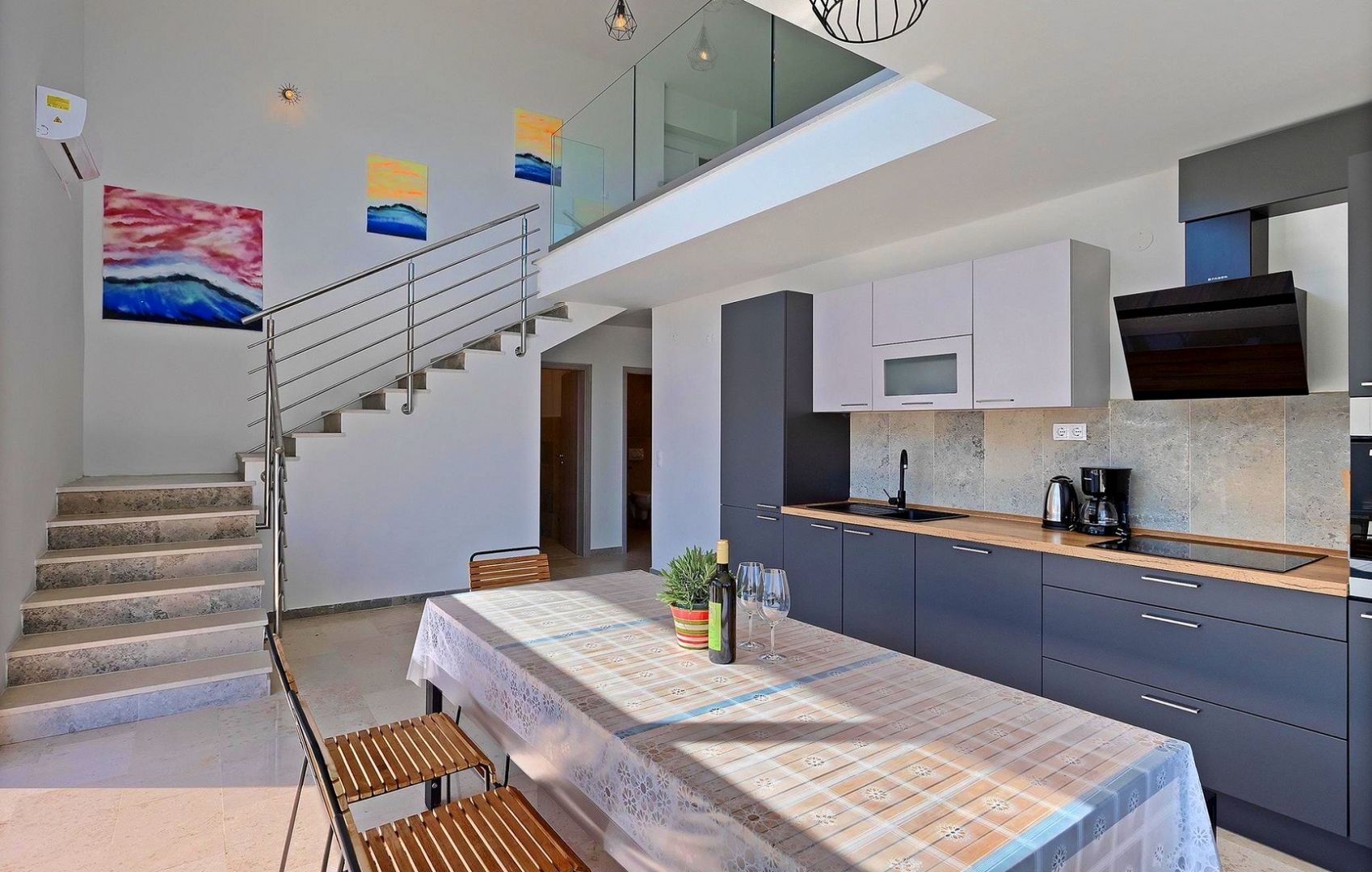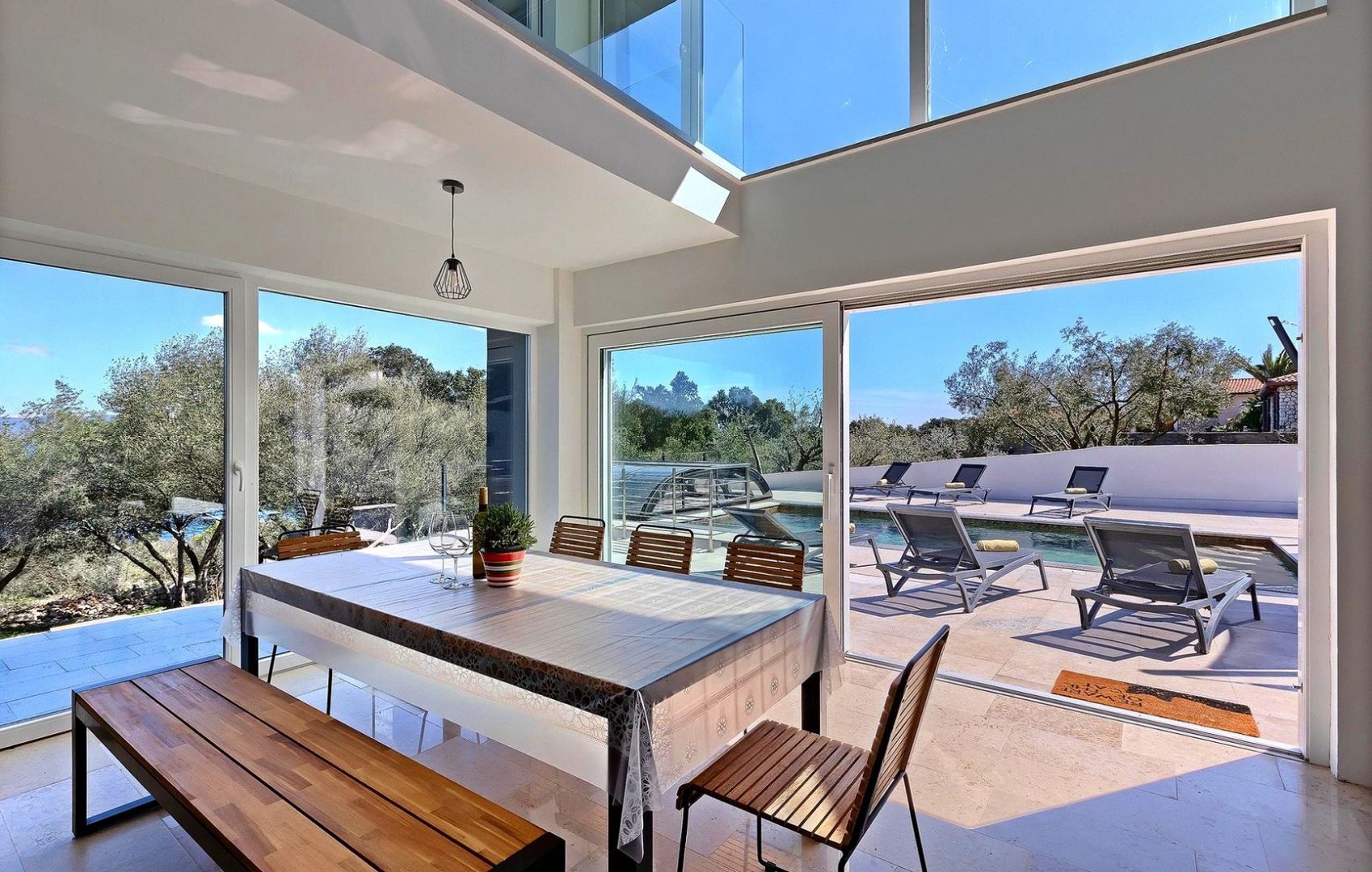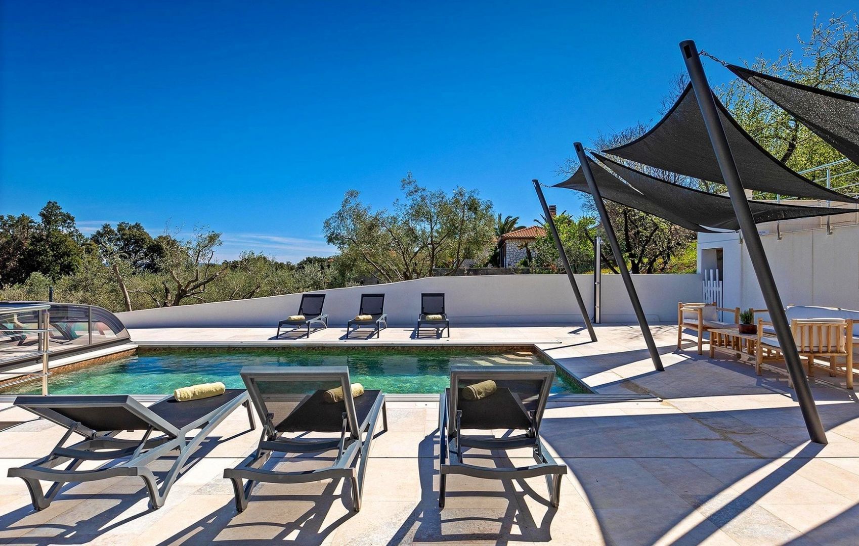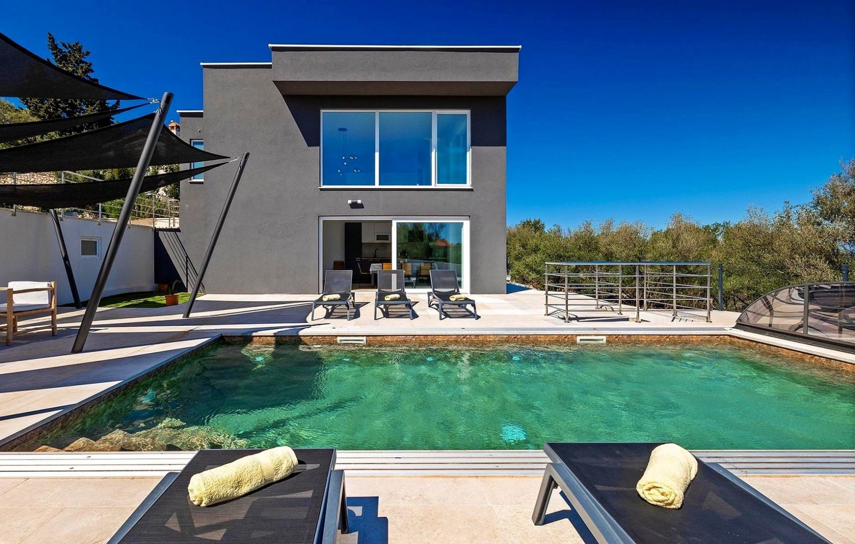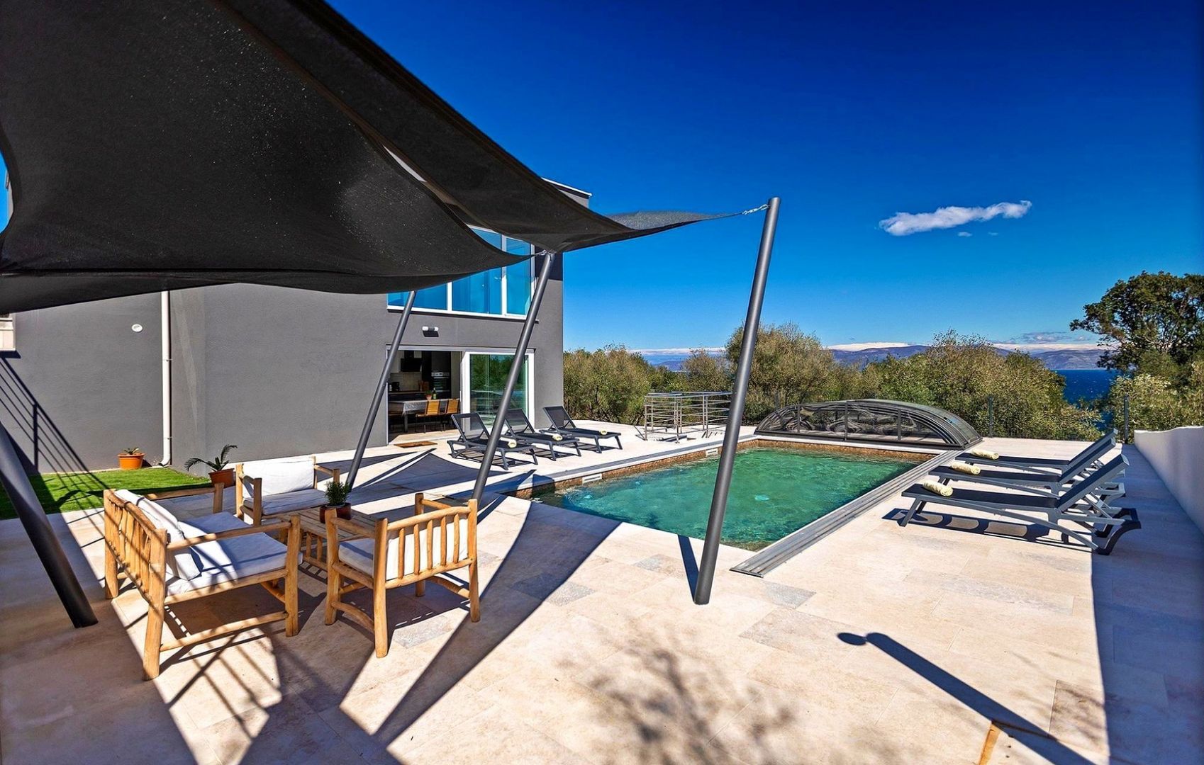 ISTRIA, RABAC - Vila s panoramatickým výhledem na moře Na jihovýchodním pobřeží Istrie, kde se zelené kopce setkávají s mořem, kde se snoubí příroda a dědictví, jsou dvě města podobné velikosti s různými, ale vzájemně se doplňujícími charaktery - Labin a Rabac, vzdálené od sebe pouhé čtyři kilometry. Rabac je díky svým bílým oblázkovým plážím, bohaté středomořské vegetaci a křišťálově čistému moři nazýván perlou Kvarneru. Kdysi malá rybářská vesnička je dnes Rabac atraktivní turistickou destinací, která v síti barevných uliček ukrývá bohaté kulturní akce. Zelené okolí Rabacu a malebné vnitrozemí zvou k dobrodružství, výzkumu a rekreaci po celý rok. Nedaleko Rabacu a Labinu v malé osadě u moře je na prodej vila s panoramatickým výhledem na moře. Nachází se v klidné čtvrti s výhledem, který zahrnuje Učku, město Rijeka, Kvarnerské ostrovy a křišťálově čisté Jaderské moře, a poloha této nemovitosti nabízí přesně ten okouzlující a jedinečný výhled. Vyznačuje se moderním designem a při jeho konstrukci byly použity špičkové stavební materiály podle nejvyšších standardů pro bytovou výstavbu. Minimalistický moderní interiér klade důraz na otevřený prostor s prosklenými stěnami, které umožňují spoustu přirozeného světla a panoramatický výhled na moře. Je definován jako jedna bytová jednotka, jejíž plocha je rozložena do dvou podlaží; přízemí a první patro. Přízemí se skládá z kuchyně s jídelnou, tří ložnic, tří koupelen a toalety pro hosty. V prvním patře je prostorný obývací pokoj, ložnice, koupelna a toaleta pro hosty. Dvůr je upravený a zahradnicky upravený a oplocený a úplnou harmonii zajišťuje vyhřívaný bazén 38 m² se sluneční terasou. Poloha, struktura a komfort dělají z této nemovitosti ideální příležitost pro klidný rodinný život i investici za účelem turistického pronájmu.