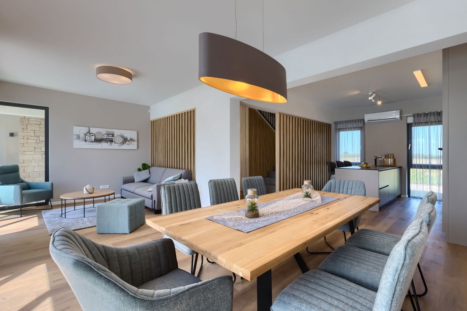 ISTRIE, BRTONIGLA – Dvě luxusní vily s bazény v klidném prostředí Brtonigla je malebné istrijské městečko ležící v zeleném vnitrozemí západní Istrie, známé svými kvalitními víny, olivovými oleji a zachovalou přírodou. Kombinace tradičního istrijského kouzla a vynikajícího dopravního spojení s mořem, Novigradem, Umagem a dalšími istrijskými centry dělá z Brtonigly mimořádně žádané místo pro bydlení, dovolenou a investice do nemovitostí. V klidné a přírodou obklopené vesnici se nachází tato unikátní nemovitost, která se skládá ze dvou samostatných luxusních vil, jedné o rozloze 264 m2 a druhé 274 m2 – navržených s důrazem na soukromí, pohodlí a vysokou kvalitu. Každá vila se rozkládá na dvou podlažích a nabízí prostorný a moderně zařízený interiér. V přízemí se nachází vstupní hala, prostorný obývací pokoj s otevřeným prostorem propojený s moderně vybavenou kuchyní a jídelnou, úložný prostor, technická místnost, toaleta pro hosty s prádelnou a jedna ložnice s vlastní koupelnou a přímým přístupem na terasu a k bazénu. V patře se nacházejí tři ložnice, každá s vlastní koupelnou a přístupem na soukromou terasu. Obě vily jsou vybaveny moderními technickými řešeními – solárními panely, podlahovým vytápěním, klimatizací ve všech místnostech a kompletní infrastrukturou pro energeticky úsporné a ekonomické využití nemovitosti. Každá vila se nachází v prostorné a pečlivě upravené zahradě. Venkovní prostor každé vily zahrnuje velký vyhřívaný bazén s plážovou plochou 40 m², vířivku, prostor na opalování, odpočinkovou zónu a krytou letní kuchyň s grilem, ideální pro společenské akce a trávení času venku. Tato nemovitost představuje na trhu mimořádně vzácnou příležitost, protože kombinuje prvotřídní polohu, luxusní konstrukci, funkční uspořádání a osvědčený investiční potenciál. Již nyní se úspěšně věnuje turistickému pronájmu s vynikajícími recenzemi a zavedeným podnikáním, což budoucímu majiteli umožňuje okamžitou návratnost investice. Ať už hledáte bezpečnou investici, luxusní soukromý statek nebo kombinaci osobního užívání a turistického pronájmu, tato nemovitost v srdci Istrie nabízí vše – a ještě více.
