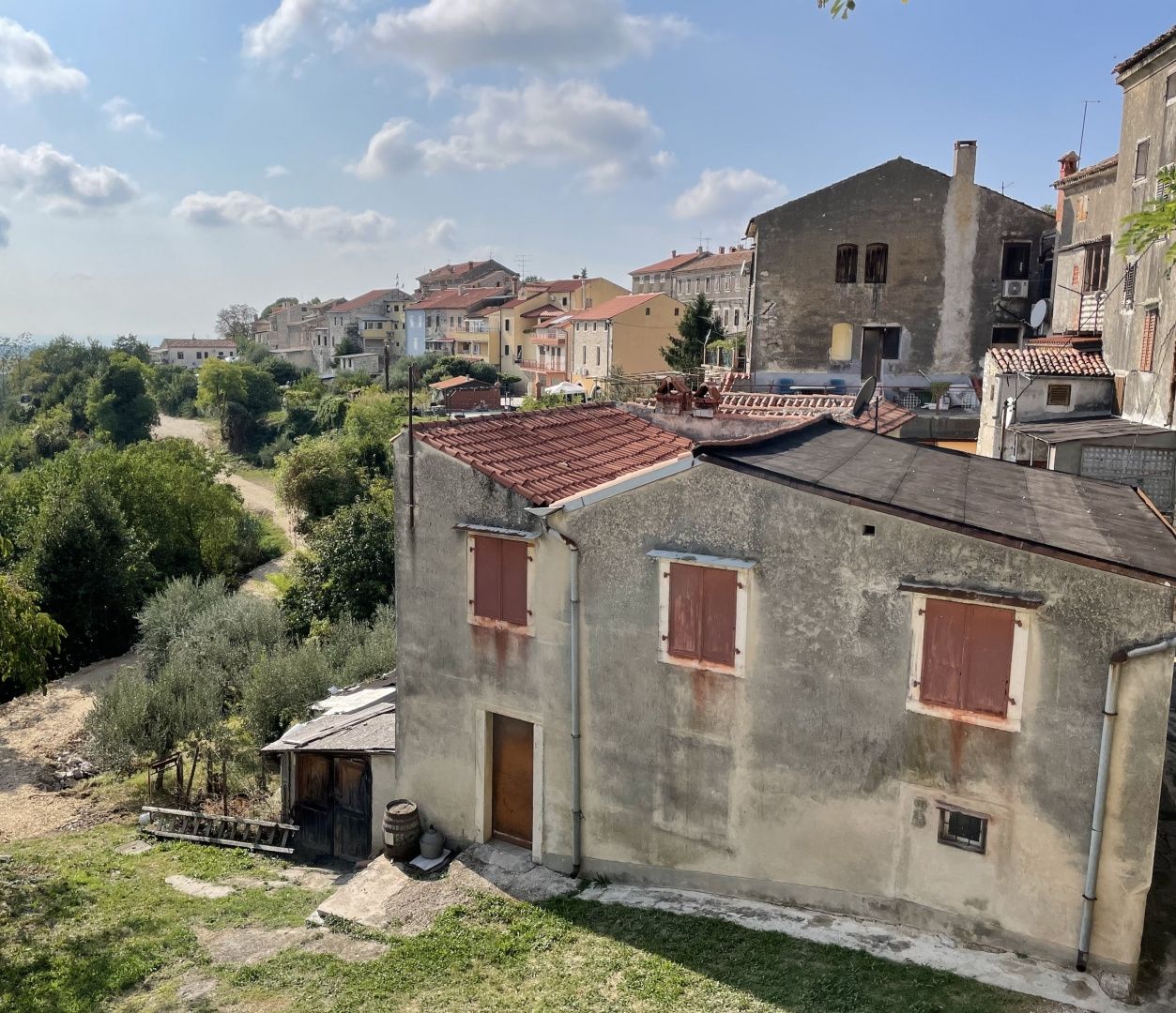 ISTRIE, BUJE - Dům na jedinečném místě s panoramatickým výhledem Středověké město Buje se nachází v severozápadní části Istrijského poloostrova a nachází se na vrcholu kopce s nádherným výhledem na moře, kopce, vinice a olivové háje, kterými je tento region známý. Blízkost moře, vliv středozemního a mírného kontinentálního klimatu, tradice zemědělské výroby, lovu a turistiky, kopcovitá krajina a zachovalá a neznečištěná příroda činí z oblasti města Buje jednu z nejatraktivnějších oblastí Istrijského poloostrova. Na prodej jsou dva propojené kamenné domy umístěné v samém centru Buje, s krásným panoramatickým výhledem na moře, olivové háje, vinice a nedotčenou istrijskou přírodu. Tato nemovitost o celkové ploše cca. 200 m² se skládá ze dvou dvojdomů, které se prodávají jako celek a tvoří tak jedinečný celek. První dům má celkovou plochu cca. 120 m2. Přízemí tvoří chodba-vstup do domu, jeden velký a jeden menší pokoj, koupelna. První patro tohoto domu se skládá z kuchyně, jednoho pokoje a koupelny. Z přízemí a prvního patra je nádherný výhled. Druhý dům má celkovou plochu cca. 80 m2. Přízemí tvoří jeden velký pokoj a v prvním patře je kuchyně, jeden pokoj, malá předsíň-vstup do domu a koupelna. Stejně jako u prvního domu, i tento dům nabízí nádherné výhledy na moře, olivové háje, vinice a obecně krásnou přírodu. Oba domy vyžadují rekonstrukci, což dává budoucím majitelům možnost úpravy dle vlastních představ. Je zde také možnost spojit domy do jednoho celku spojeného jednou střechou, čímž by vznikl prostorný a jedinečný obytný prostor. Jednou ze zvláštností této nemovitosti je možnost otevírání nových okenních otvorů v místech, kde byly dříve, což může dále zvýšit prosvětlení a vzdušnost prostoru. Poloha této nemovitosti je jedinečná. Domy se nacházejí u historických hradeb Buj, což jim dodává zvláštní kouzlo a umožňuje budoucímu majiteli být součástí historie města. Přestože se domy nacházejí pod historickými hradbami Buja, užívají si svého soukromí a intimity, zejména ve spodní části domu, kde se rozprostírá zeleň a přírodní okolí a vytváří tak klidné prostředí. Díky nerušenému výhledu si budoucí majitelé užijí, že jsou v docházkové vzdálenosti od veškeré občanské vybavenosti města, zatímco moře a krásné pláže jsou odtud jen deset minut jízdy. Výhled z domu nabízí nezapomenutelné scenérie nedaleké oblasti Santa Lucia, která je známá svými vinicemi, a také městečka Brtonigla, které je vzdálené pouhých 5 km. Tento panoramatický výhled na přírodu a vinice vytváří zvláštní atmosféru, díky které je tato nemovitost skutečně jedinečná. Další pozemky: Kromě domů je zde i stavební pozemek o velikosti 226 m², který otevírá řadu možností pro další výstavbu nebo vytvoření zahradní plochy. Tato nemovitost je perfektní volbou pro každého, kdo chce spojit historii, přírodu a blízkost moře v jedinečné nabídce.