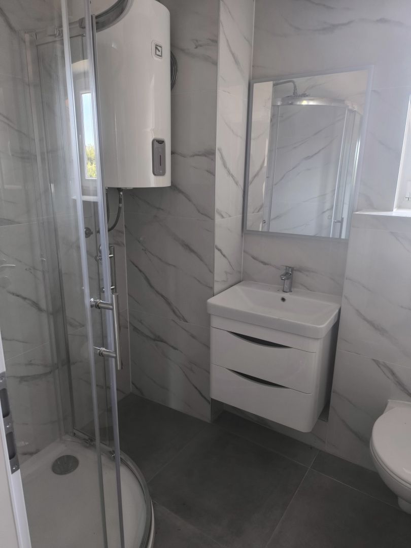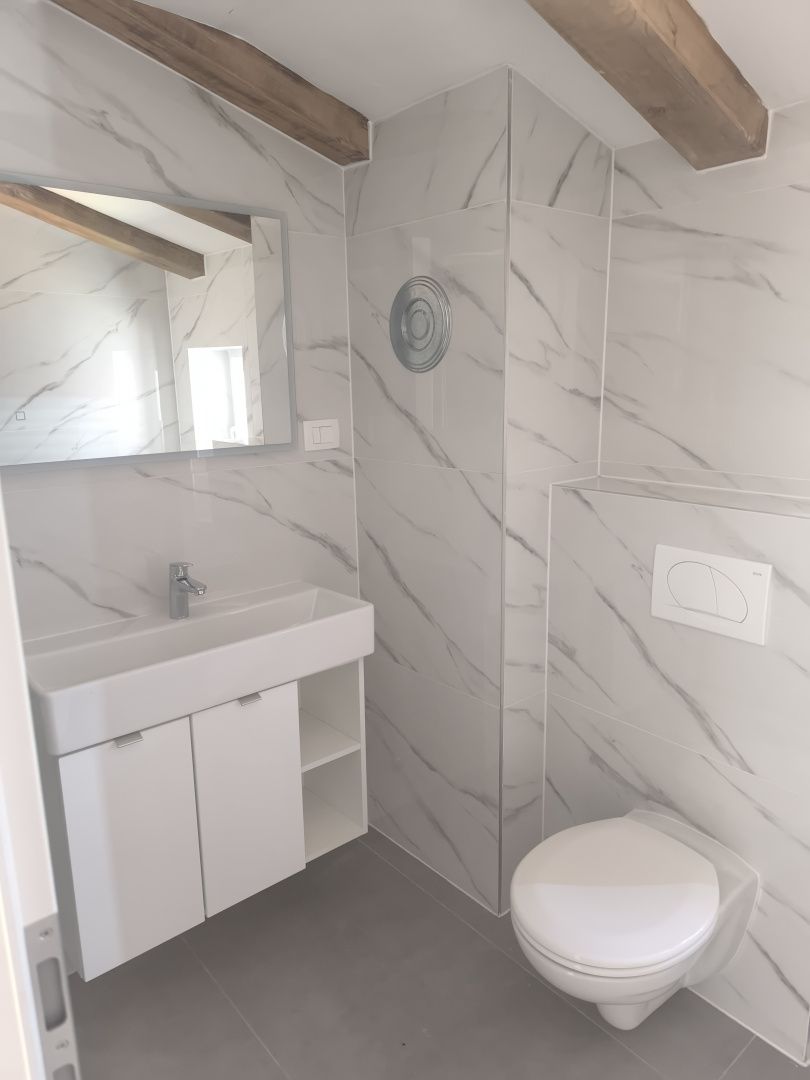 ISTRIE, JURŠIĆI - Kamenný řadový dům s bazénem + apartmán, NA KLÍČ V centru vesnice Juršići, v klidné slepé ulici, se nachází tento nový projekt třípatrového kamenného domu s bazénem, pomocnou budovou a skladem. Předmětná nemovitost se nachází na pozemku o celkové výměře 301 m2. O celkové čisté obytné ploše 79 m2 se dům skládá ze 4 ložnic, 2 koupelen s toaletou a další toalety, rozdělených do 3 nadzemních podlaží: V přízemí domu se nachází obývací pokoj, kuchyně, jídelna a malá toaleta pro hosty V přízemí je také výstup na terasu s přístupem k bazénu. Vnitřní schodiště vede do druhého patra, kde jsou 2 ložnice a koupelna s toaletou. V horním patře jsou také další 2 ložnice a koupelna s toaletou. Komunikace s dvorem je přes přízemí, které nabízí průchod do prostoru pro slunění, bazénu a doprovodného zázemí. Na pozemku se dále nachází vedlejší stavba, řešená jako byt, s čistou obytnou plochou 26 m2. Skládá se z jednoho pokoje a koupelny s WC. K bytu náleží také úložná plocha 13 m2. Další informace: *Bazén má rozměr 6x3 m, celková plocha 18 m2. *Topení je na dřevo. *Možnost instalace solárních panelů. *Budoucí kupující má možnost výběru vybavení a nábytku dle přání. Poznámka: Uvedená cena platí pro kompletně dokončený dům na klíč. Dokončení prací na konci roku 2024. Ideální nemovitost pro začátek klidného rodinného života nebo pro účely turistického pronájmu.