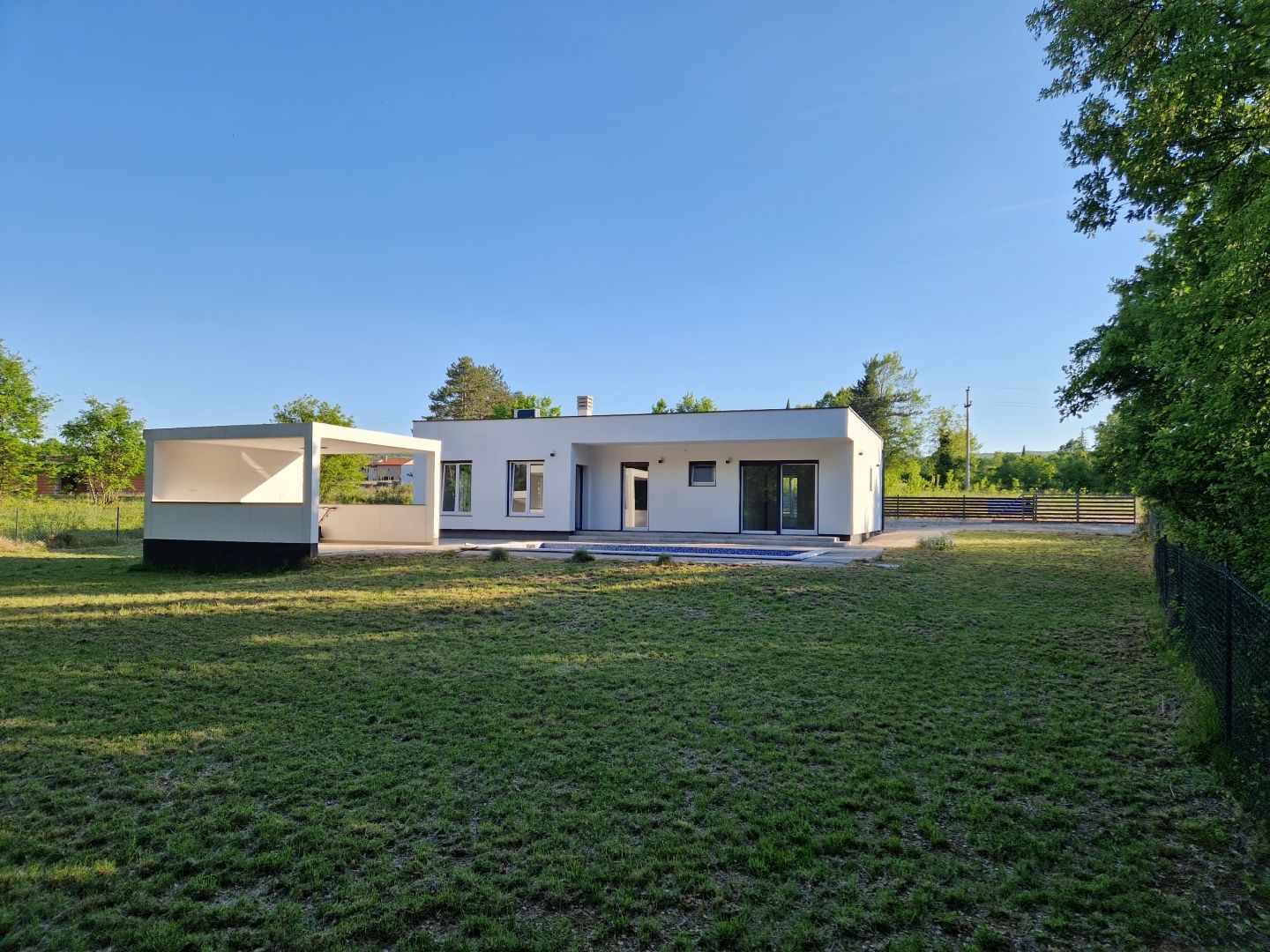 ISTRIE, KRŠAN - Moderní přízemní dům s bazénem v přírodě 111 m2. Tento krásný moderní přízemní dům se nachází v srdci Istrie. Pro ty, kteří hledají odlehlé místo, kde si mohou nerušeně odpočinout a užívat si výhod středomořského klimatu obklopeného krásnou přírodou. Nedaleko od moře a prvních pláží, a přesto daleko od letního hluku a davů těchto oblastí. Přízemní dům se nachází na pozemku o rozloze 1453 m2. Skládá se ze 3 ložnic, každá s vlastní koupelnou, obývacího pokoje s kuchyní a jídelnou v jednom otevřeném prostoru, chodby, toalety pro hosty, úložné místnosti/prádelny a terasy, která vede na dvůr o celkové čisté ploše 111 m2. Bazén má obývací pokoj s kuchyní a dvě ložnice. Vedle bazénu (8x3,75) se nachází také letní kuchyně o rozloze 20 m2, terasa na opalování a zahrada. Nemovitost se prodává nezařízená. 2 zajištěná parkovací místa v prostorném dvoře. Klimatizace, podlahové vytápění v koupelnách. Nemovitost je slunná a připravená pro nového majitele, který si může finální detaily úpravy doladit dle svého přání a vkusu. Dokončení prací říjen 2023.