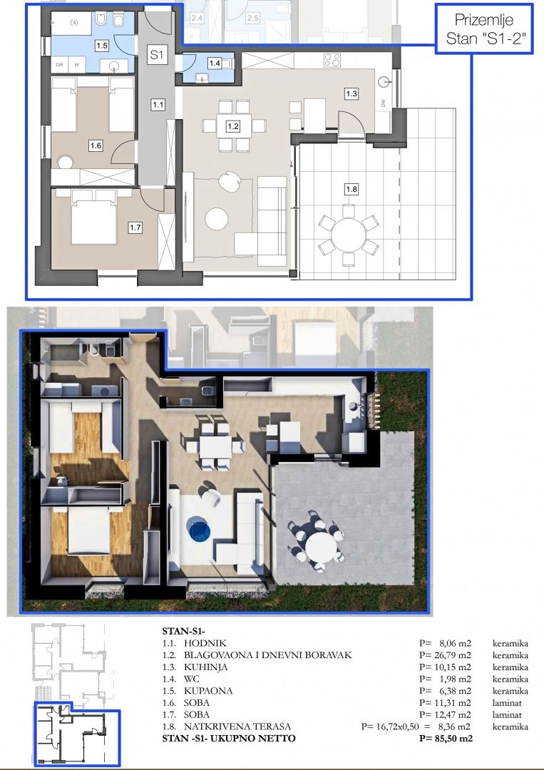 ISTRIE, LABIN - Byt v přízemí moderní novostavby Na jihovýchodním pobřeží Istrie, kde se zelené kopce setkávají s mořem, kde se spojuje příroda a dědictví, se nacházejí dvě města podobné velikosti s odlišným, ale vzájemně se doplňujícím charakterem - Labin a Rabac. Malebné městečko Labin se tyčí na 320 metrů vysokém kopci, pouhé čtyři kilometry od bílých oblázkových pláží Rabacu. Labin, který byl krátce vyhlášen nezávislou republikou, je protkaný bohatou historií a hornictvím, které tuto oblast poznamenalo, a dnes je fascinujícím městem rozporů; starého a nového, historie a současnosti, cestovního ruchu a umění. Nedaleko centra Labinu se staví moderní budova, která se rozkládá v přízemí a dvou patrech a obsahuje celkem 8 bytových jednotek. Při stavbě jsou použity odolné a spolehlivé materiály, které zaručují dlouhodobou spokojenost a bezpečnost bydlení, přičemž plánování prostoru každého patra bylo provedeno do detailu, což vede k vysoce kvalitnímu uspořádání místností. Předmětem prodeje je byt nacházející se v přízemí budovy. Skládá se ze dvou ložnic, koupelny, toalety pro hosty, chodby a otevřeného prostoru, který spojuje obývací pokoj, jídelnu a kuchyň s přístupem na krytou terasu. Možnost zakoupení zahrady s úpravou ceny. Parkovací místa se kupují samostatně dle odpovídajícího kalkulačního koeficientu. Tento byt v novostavbě v docházkové vzdálenosti od nákupních, kulturních, vzdělávacích a rekreačních zařízení je ideální příležitostí pro příjemný rodinný život i pro investici za účelem turistického pronájmu. Uvedená cena nemovitosti se vztahuje k konečnému stupni dokončení bez nábytku, což umožňuje finální uspořádání dle vlastních přání a preferencí. Prodávající předmětné nemovitosti je právnická osoba a DPH je zahrnuta v uvedené ceně.