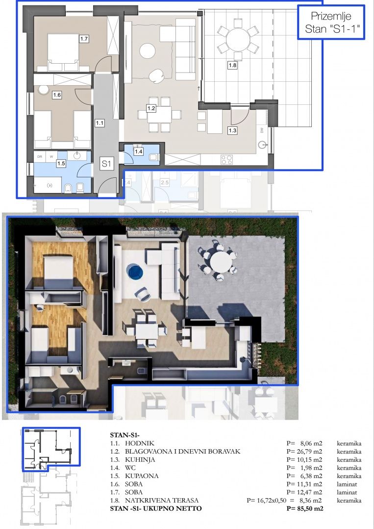 ISTRIE, LABIN - Byt v přízemí moderní novostavby Na jihovýchodním pobřeží Istrie, kde se zelené kopce setkávají s mořem, kde se spojuje příroda a dědictví, se nacházejí dvě města podobné velikosti s odlišným, ale vzájemně se doplňujícím charakterem - Labin a Rabac. Malebné městečko Labin se tyčí na 320 metrů vysokém kopci, pouhé čtyři kilometry od bílých oblázkových pláží Rabacu. Labin, který byl krátce vyhlášen nezávislou republikou, je protkaný bohatou historií a hornictvím, které tuto oblast poznamenalo, a dnes je fascinujícím městem rozporů; starého a nového, historie a současnosti, cestovního ruchu a umění. Nedaleko centra Labinu se staví moderní budova, která se rozkládá v přízemí a dvou patrech a obsahuje celkem 8 bytových jednotek. Při stavbě jsou použity odolné a spolehlivé materiály, které zaručují dlouhodobou spokojenost a bezpečnost bydlení, přičemž plánování prostoru každého patra bylo provedeno do detailu, což vede k vysoce kvalitnímu uspořádání místností. Předmětem prodeje je byt nacházející se v přízemí budovy. Skládá se ze dvou ložnic, koupelny, toalety pro hosty, chodby a otevřeného prostoru, který spojuje obývací pokoj, jídelnu a kuchyň s přístupem na krytou terasu. Možnost zakoupení zahrady s úpravou ceny. Parkovací místa se kupují samostatně dle odpovídajícího kalkulačního koeficientu. Tento byt v novostavbě v docházkové vzdálenosti od nákupních, kulturních, vzdělávacích a rekreačních zařízení je ideální příležitostí pro příjemný rodinný život i pro investici za účelem turistického pronájmu. Uvedená cena nemovitosti se vztahuje k konečnému stupni dokončení bez nábytku, což umožňuje finální uspořádání dle vlastních přání a preferencí. Prodávající předmětné nemovitosti je právnická osoba a DPH je zahrnuta v uvedené ceně.