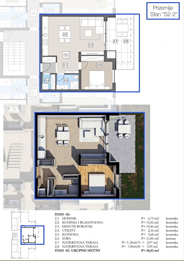 ISTRIE, LABIN - Apartmán v přízemí novostavby Na jihovýchodním pobřeží Istrie, kde se zelené kopce setkávají s mořem, kde se spojuje příroda a dědictví, se nacházejí dvě města podobné velikosti s odlišným, ale vzájemně se doplňujícím charakterem - Labin a Rabac. Malebné městečko Labin se tyčí na 320 metrů vysokém kopci, pouhé čtyři kilometry od bílých oblázkových pláží Rabacu. Labin, který byl krátce vyhlášen nezávislou republikou, je protkaný bohatou historií a hornictvím, které tuto oblast poznamenaly, a dnes je fascinujícím městem rozporů; starého a nového, historie a současnosti, cestovního ruchu a umění. Nedaleko centra Labinu se staví moderní budova, která se rozkládá v přízemí a dvou patrech a obsahuje celkem 8 bytových jednotek. Při stavbě jsou použity odolné a spolehlivé materiály, které zaručují dlouhodobou spokojenost a bezpečnost bydlení, přičemž plánování prostoru každého patra bylo provedeno do detailu, což vede k vysoce kvalitní dispozici. Předmětem prodeje je apartmán nacházející se v přízemí budovy. Skládá se z jedné ložnice, koupelny, toalety pro hosty, chodby a otevřeného prostoru, který spojuje obývací pokoj, jídelnu a kuchyň s přístupem na krytou terasu. Možnost zakoupení zahrady s úpravou ceny. Parkovací místa se kupují samostatně dle odpovídajícího kalkulačního koeficientu. Tento byt v novostavbě v docházkové vzdálenosti od nákupních, kulturních, vzdělávacích a rekreačních zařízení je ideální příležitostí pro příjemný rodinný život i pro investici za účelem turistického pronájmu. Uvedená cena nemovitosti se vztahuje k konečnému stupni dokončení bez nábytku, což umožňuje finální uspořádání dle vlastních přání a preferencí. Prodávající předmětné nemovitosti je právnická osoba a DPH je zahrnuta v uvedené ceně.