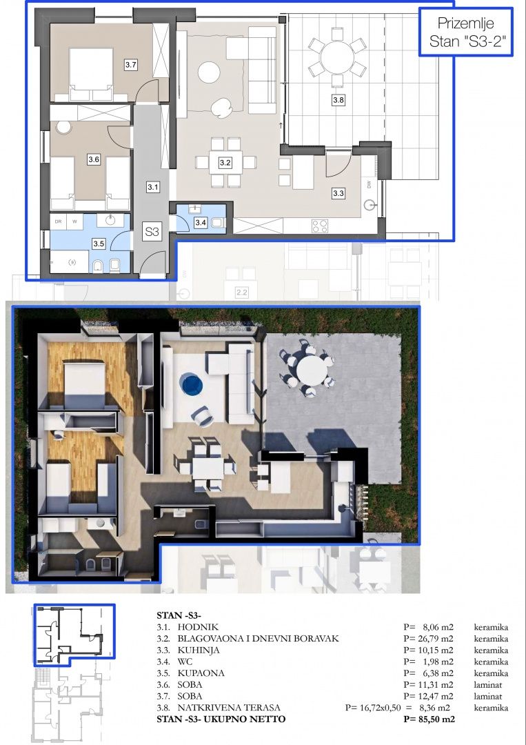 ISTRIE, LABIN - Dvoupokojový apartmán v přízemí novostavby Na jihovýchodním pobřeží Istrie, kde se zelené kopce setkávají s mořem, kde se příroda a dědictví spojují, se nacházejí dvě města podobné velikosti s odlišným, ale vzájemně se doplňujícím charakterem - Labin a Rabac. Malebné městečko Labin se tyčí na 320 metrů vysokém kopci, pouhé čtyři kilometry od bílých oblázkových pláží Rabacu. Labin, který byl krátce vyhlášen nezávislou republikou, protkaný bohatou historií a hornictvím, které tuto oblast poznamenaly, je dnes fascinujícím městem rozporů; starého a nového, historie a současnosti, cestovního ruchu a umění. Nedaleko centra Labinu se staví moderní budova, která se rozkládá v přízemí a dvou patrech a obsahuje celkem 8 bytových jednotek. Při stavbě jsou použity odolné a spolehlivé materiály, které zaručují dlouhodobou spokojenost a bezpečnost bydlení, přičemž plánování prostoru každého patra bylo provedeno do detailu, což vede k vysoce kvalitnímu uspořádání místností. Předmětem prodeje je apartmán nacházející se v přízemí budovy. Skládá se ze dvou ložnic, koupelny, toalety pro hosty, chodby a otevřeného prostoru, který spojuje obývací pokoj, jídelnu a kuchyň s přístupem na krytou terasu. Možnost zakoupení zahrady s úpravou ceny. Parkovací místa se kupují samostatně dle odpovídajícího kalkulačního koeficientu. Tento byt v novostavbě v docházkové vzdálenosti od nákupních, kulturních, vzdělávacích a rekreačních zařízení je ideální příležitostí pro příjemný rodinný život i pro investici za účelem turistického pronájmu. Uvedená cena nemovitosti se vztahuje k konečnému stupni dokončení bez nábytku, což umožňuje finální uspořádání dle vlastních přání a preferencí. Prodávající předmětné nemovitosti je právnická osoba a DPH je zahrnuta v uvedené ceně.