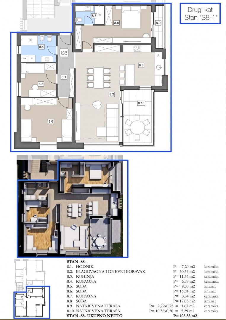ISTRIE, LABIN - Komfortní byt v moderní novostavbě Na jihovýchodním pobřeží Istrie, kde se zelené kopce setkávají s mořem, kde se příroda a dědictví spojují, se nacházejí dvě města podobné velikosti s odlišným, ale vzájemně se doplňujícím charakterem - Labin a Rabac. Malebné městečko Labin se tyčí na 320 metrů vysokém kopci, pouhé čtyři kilometry od bílých oblázkových pláží Rabacu. Labin, který byl krátce vyhlášen nezávislou republikou, protkaný bohatou historií a hornictvím, které tuto oblast poznamenaly, je dnes fascinujícím městem rozporů; starého a nového, historie a současnosti, cestovního ruchu a umění. Nedaleko centra Labinu se staví moderní budova, která se rozkládá v přízemí a dvou patrech a obsahuje celkem 8 bytových jednotek. Při stavbě jsou použity odolné a spolehlivé materiály, které zaručují dlouhodobou spokojenost a bezpečnost bydlení, přičemž plánování prostoru každého patra bylo provedeno do detailu, což vede k vysoce kvalitní dispozici. Předmětem prodeje je byt nacházející se ve druhém patře budovy. Skládá se z otevřeného prostoru, který spojuje obývací pokoj, jídelnu a kuchyň, tří ložnic, dvou koupelen, chodby a dvou krytých teras. Tento byt v novostavbě v docházkové vzdálenosti od nákupních, kulturních, vzdělávacích a rekreačních zařízení je ideální příležitostí pro příjemný rodinný život, ale i pro investici za účelem turistického pronájmu. Parkovací místa se kupují samostatně dle odpovídajícího kalkulačního koeficientu. Uvedená cena nemovitosti se vztahuje k konečnému stupni dokončení bez nábytku, což umožňuje finální uspořádání dle vlastních přání a preferencí. Prodejce dané nemovitosti je právnickou osobou a DPH je zahrnuta v uvedené ceně.