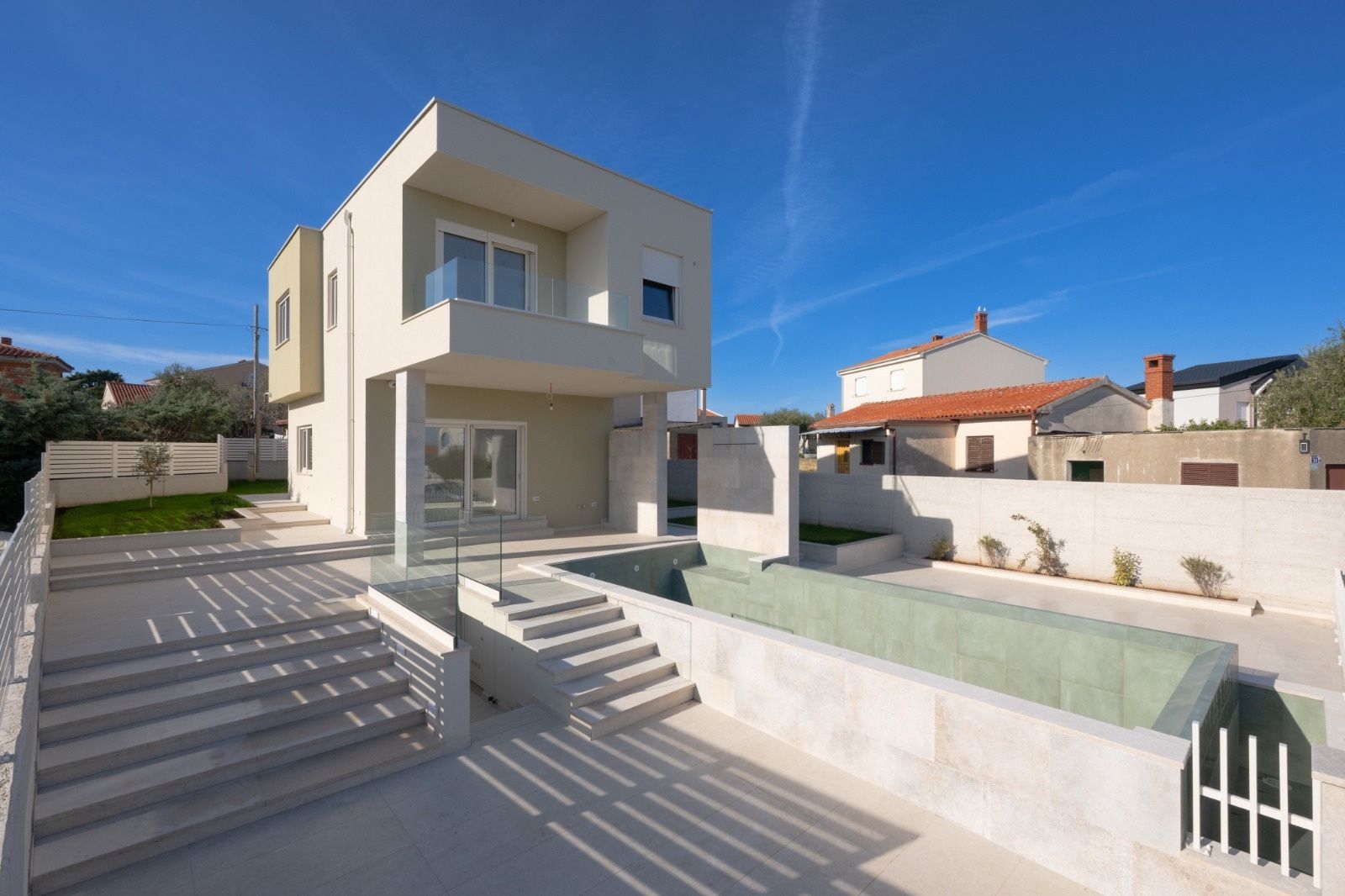 ISTRIE, LIŽNJAN - Nová vila s krásným výhledem na moře! DUX reality nabízí krásnou novou vilu s panoramatickým výhledem na moře! Projekt se nachází 1,5 km vzdušnou čarou od první pláže (3 minuty autem). Obchody, restaurace a lékárna jsou v docházkové vzdálenosti. Tato luxusní vila s bazénem a výhledem na moře se nachází na pozemku o rozloze 495 m² a nabízí neuvěřitelný výhled na okolí a moře. Vila se rozkládá na dvou podlažích o celkové ploše 177 m². Přízemí se skládá z prostorné chodby, toalety, úložné místnosti a otevřeného obývacího pokoje s kuchyní a jídelnou. Tento světlý a vzdušný prostor je díky velkým proskleným stěnám vedoucím na terasu a k bazénu plný přirozeného světla. Z obývacího pokoje je přímá komunikace s venkovním prostorem přes prosklenou stěnu. V prvním patře se nachází chodba a dvě prostorné ložnice, každá s vlastní luxusní koupelnou a terasou. Terasa nabízí krásný výhled na moře a je jistě jednou z nejatraktivnějších oblastí v daném projektu. Na zahradě se nachází přelivový bazén a parkovací místo. TECHNICKÁ ČÁST: Bazén se jedním kliknutím promění ve velkou vířivku se 4 gejzíry. Pro vytápění a chlazení jsou instalovány klimatizace a v celém domě je zavedeno elektrické podlahové vytápění. Je provedena příprava na solární panely. Skleněné stěny mají elektrické rolety. - stavební povolení - probíhá získání povolení k užívání - čisté vlastnictví bez věcných břemen - prodávající je soukromá osoba