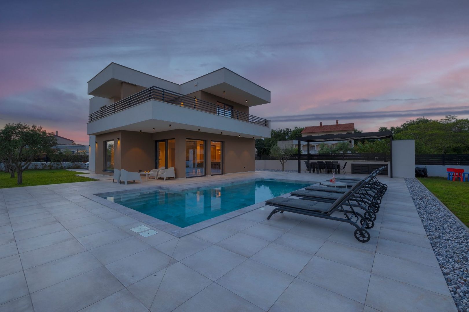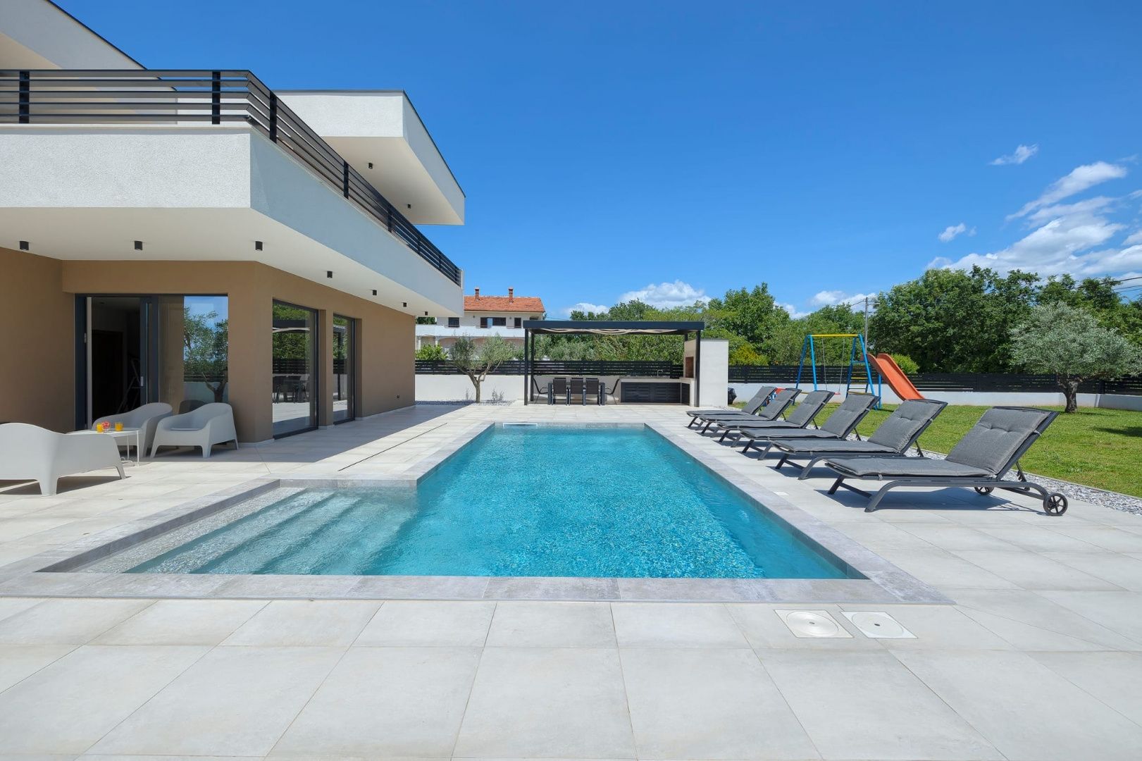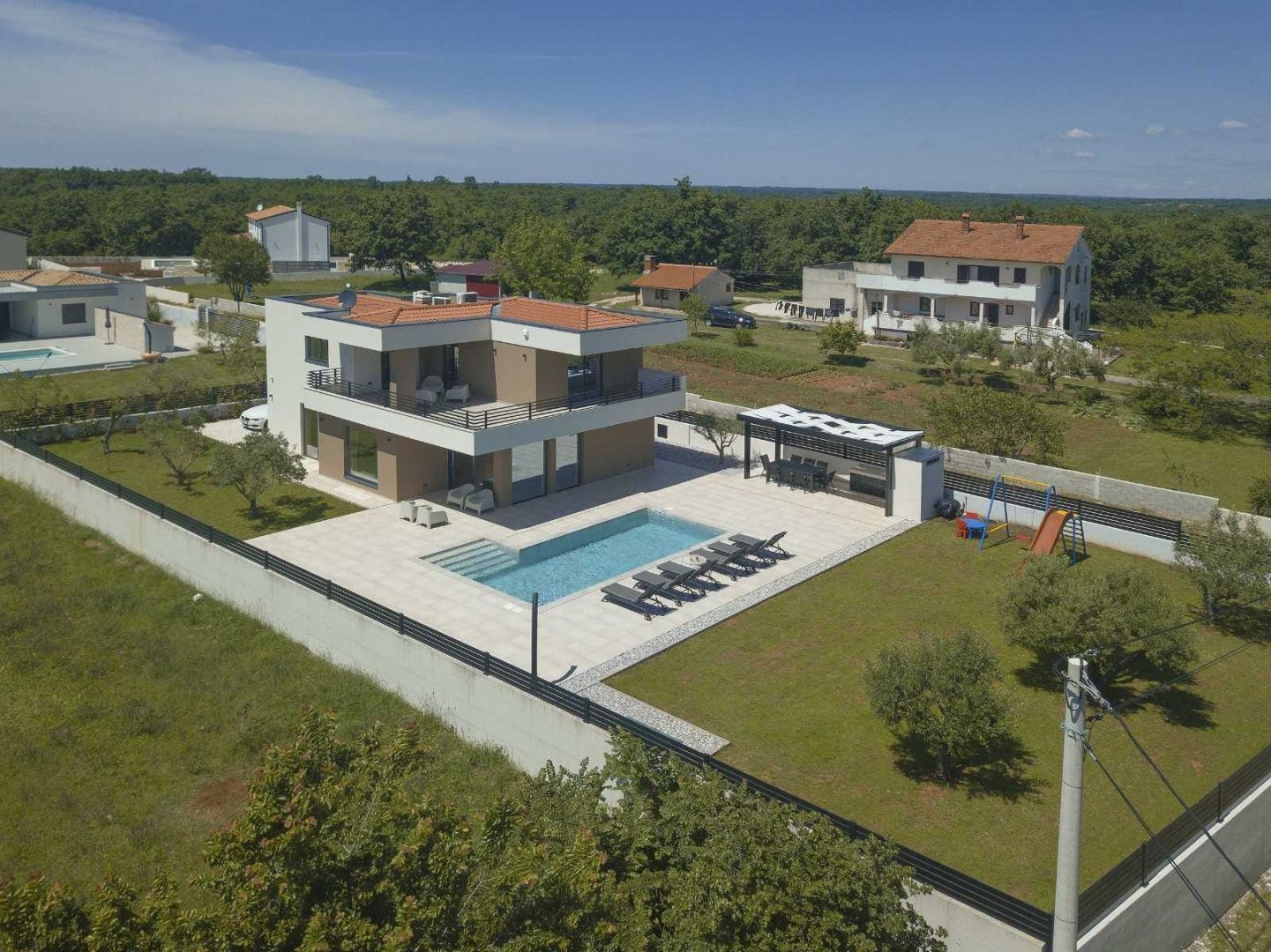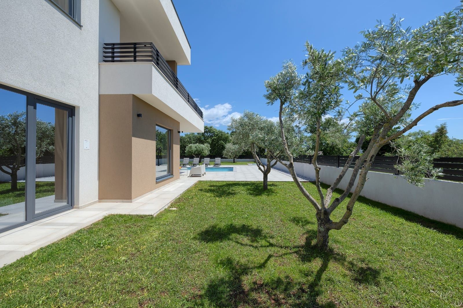 ISTRIE, MARČANA – Nová moderní vila s bazénem v klidném prostředí Obec Marčana se nachází v jihovýchodní části Istrie, známé svým klidným okolím, autentickou istrijskou atmosférou a dobrým dopravním spojením do Puly a na pobřeží. Oblast nabízí ideální rovnováhu mezi soukromím, přírodou a dostupností všech klíčových zařízení. Právě v takovém prostředí, v osadě Orbanići, se nachází tato moderní samostatně stojící vila, která kombinuje moderní styl výstavby a funkčnost přizpůsobenou každodennímu životu nebo turistickému pronájmu. Celková čistá obytná plocha je 170 m², rozložená do dvou podlaží – přízemí a první patro. Přízemí je navrženo jako otevřený prostor, který zahrnuje kuchyň, jídelnu a obývací pokoj s přístupem na krytou terasu (22,44 m²). Na stejném patře se nachází další ložnice, koupelna, prádelna a technická místnost. V patře se nacházejí dvě ložnice, každá s vlastní šatnou a koupelnou, s přístupem na prostornou částečně krytou terasu o rozloze 46 m². Budova byla postavena v roce 2025 s použitím kvalitních materiálů a moderních řešení: • tepelná izolace (15 cm polystyren) • hliníkové truhlářské práce • velké prosklené stěny pro maximální přirozené osvětlení • bezpečnostní dveře • kvalitní keramická podlaha (Marazzi) • invertorové klimatizace ve všech místnostech • nábytek na míru Vila se nachází na pozemku o rozloze 851 m². Zahrada je kompletně upravená a oplocená a zahrnuje: • 34 m² bazén se sluneční terasou • letní kuchyň s krbem a pergolou • dětské hřiště • několik parkovacích míst • automatizovaný hliníkový plot Nemovitost představuje kvalitní řešení pro klidný rodinný život nebo jako investici k turistickému pronájmu, s již potvrzenou dobrou obsazeností a funkčním uspořádáním prostoru.