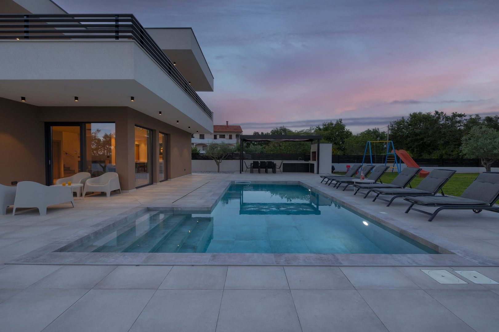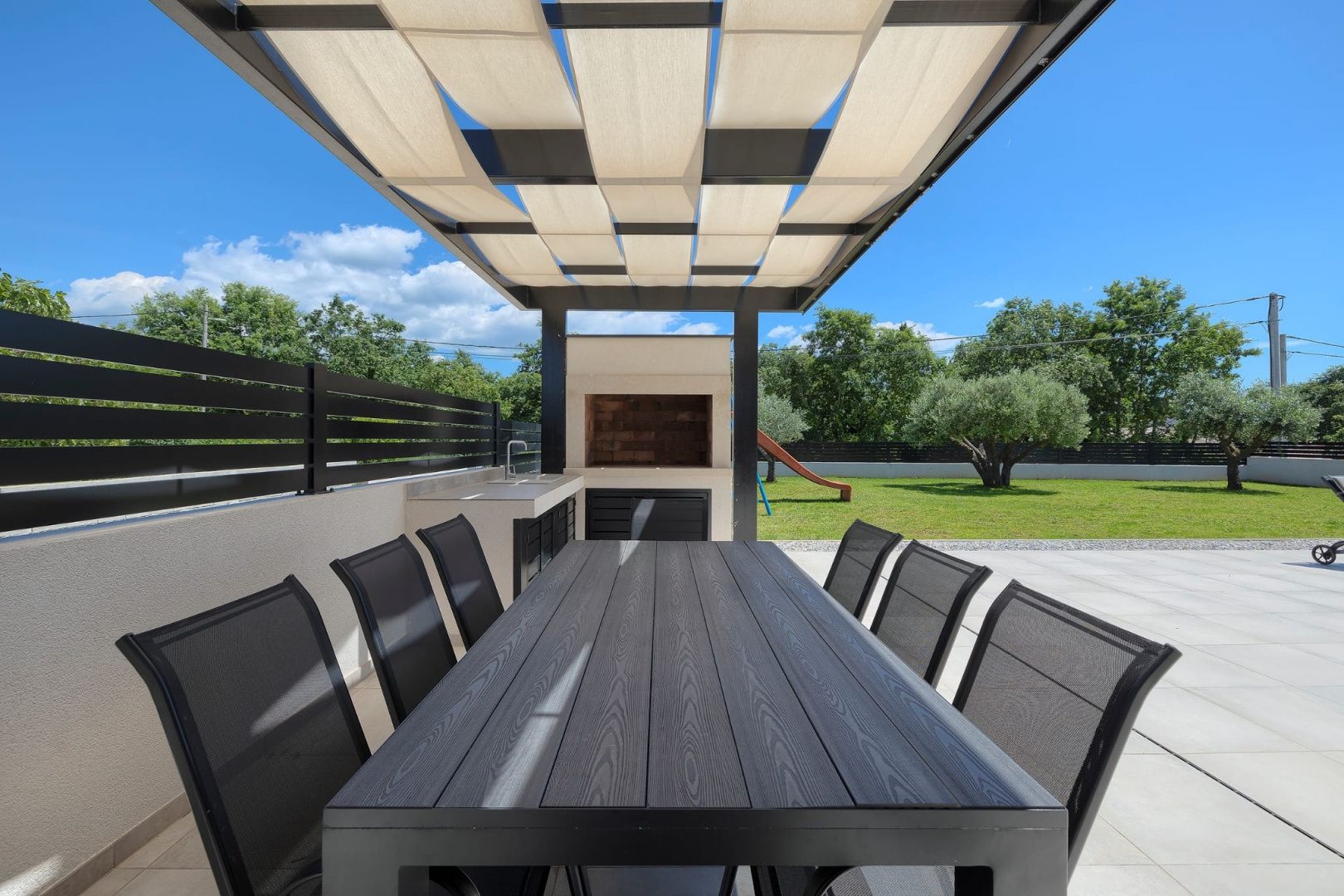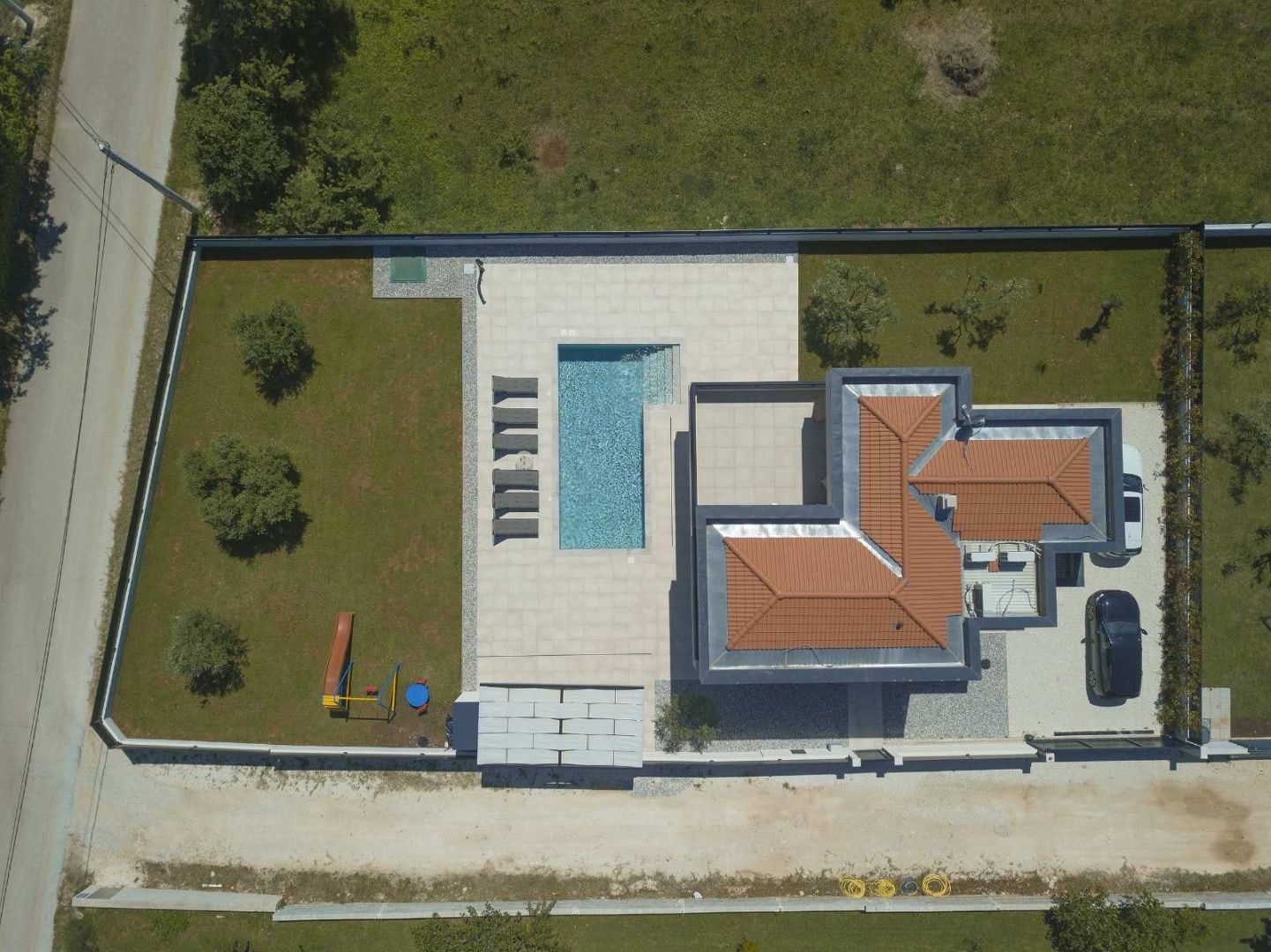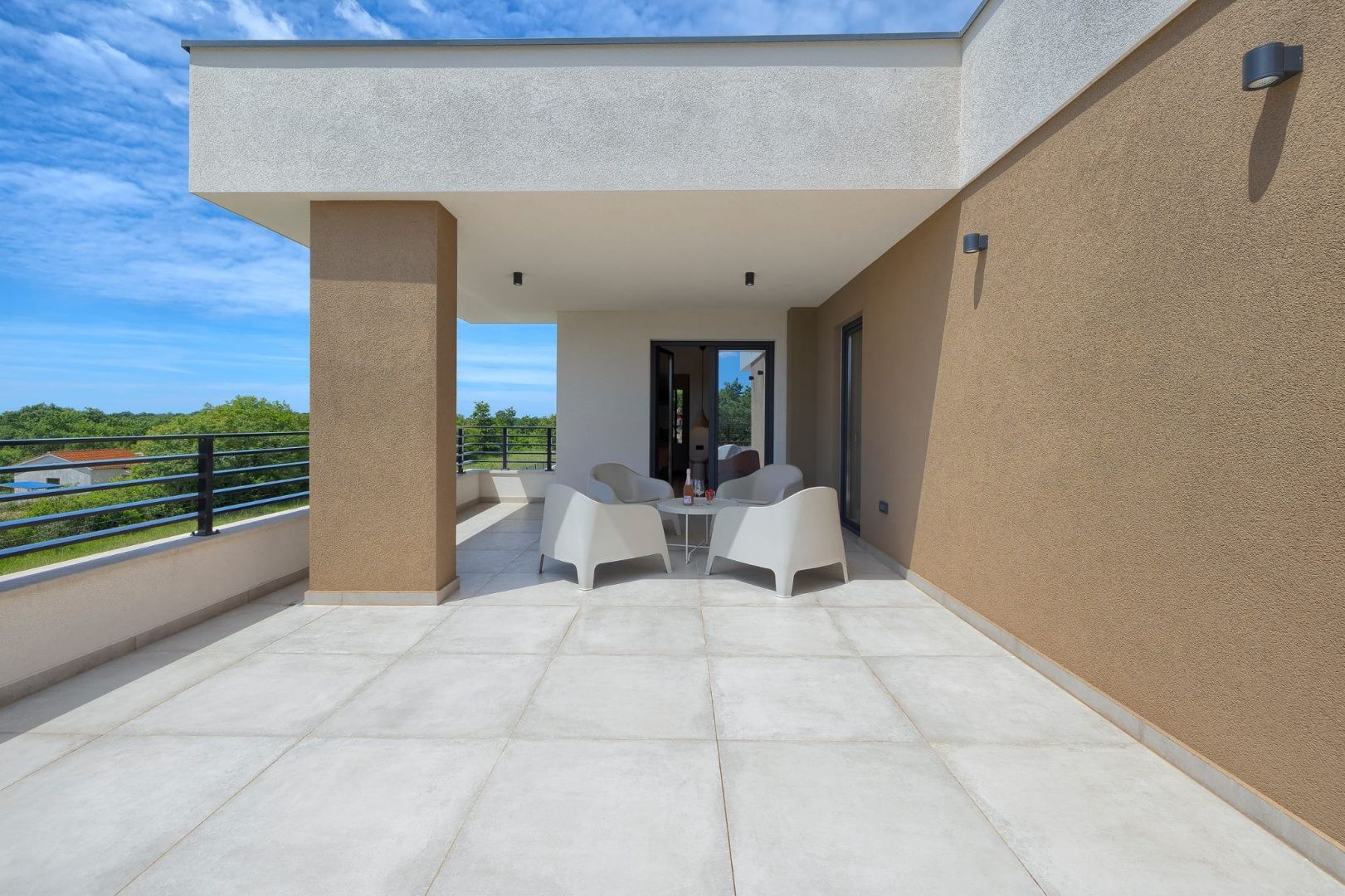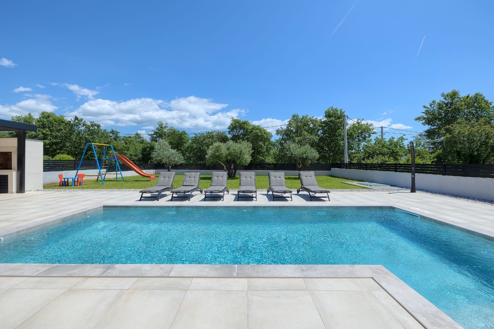 ISTRIE, MARČANA – Nová moderní vila s bazénem v klidném prostředí Obec Marčana se nachází v jihovýchodní části Istrie, známé svým klidným okolím, autentickou istrijskou atmosférou a dobrým dopravním spojením do Puly a na pobřeží. Oblast nabízí ideální rovnováhu mezi soukromím, přírodou a dostupností všech klíčových zařízení. Právě v takovém prostředí, v osadě Orbanići, se nachází tato moderní samostatně stojící vila, která kombinuje moderní styl výstavby a funkčnost přizpůsobenou každodennímu životu nebo turistickému pronájmu. Celková čistá obytná plocha je 170 m², rozložená do dvou podlaží – přízemí a první patro. Přízemí je navrženo jako otevřený prostor, který zahrnuje kuchyň, jídelnu a obývací pokoj s přístupem na krytou terasu (22,44 m²). Na stejném patře se nachází další ložnice, koupelna, prádelna a technická místnost. V patře se nacházejí dvě ložnice, každá s vlastní šatnou a koupelnou, s přístupem na prostornou částečně krytou terasu o rozloze 46 m². Budova byla postavena v roce 2025 s použitím kvalitních materiálů a moderních řešení: • tepelná izolace (15 cm polystyren) • hliníkové truhlářské práce • velké prosklené stěny pro maximální přirozené osvětlení • bezpečnostní dveře • kvalitní keramická podlaha (Marazzi) • invertorové klimatizace ve všech místnostech • nábytek na míru Vila se nachází na pozemku o rozloze 851 m². Zahrada je kompletně upravená a oplocená a zahrnuje: • 34 m² bazén se sluneční terasou • letní kuchyň s krbem a pergolou • dětské hřiště • několik parkovacích míst • automatizovaný hliníkový plot Nemovitost představuje kvalitní řešení pro klidný rodinný život nebo jako investici k turistickému pronájmu, s již potvrzenou dobrou obsazeností a funkčním uspořádáním prostoru.