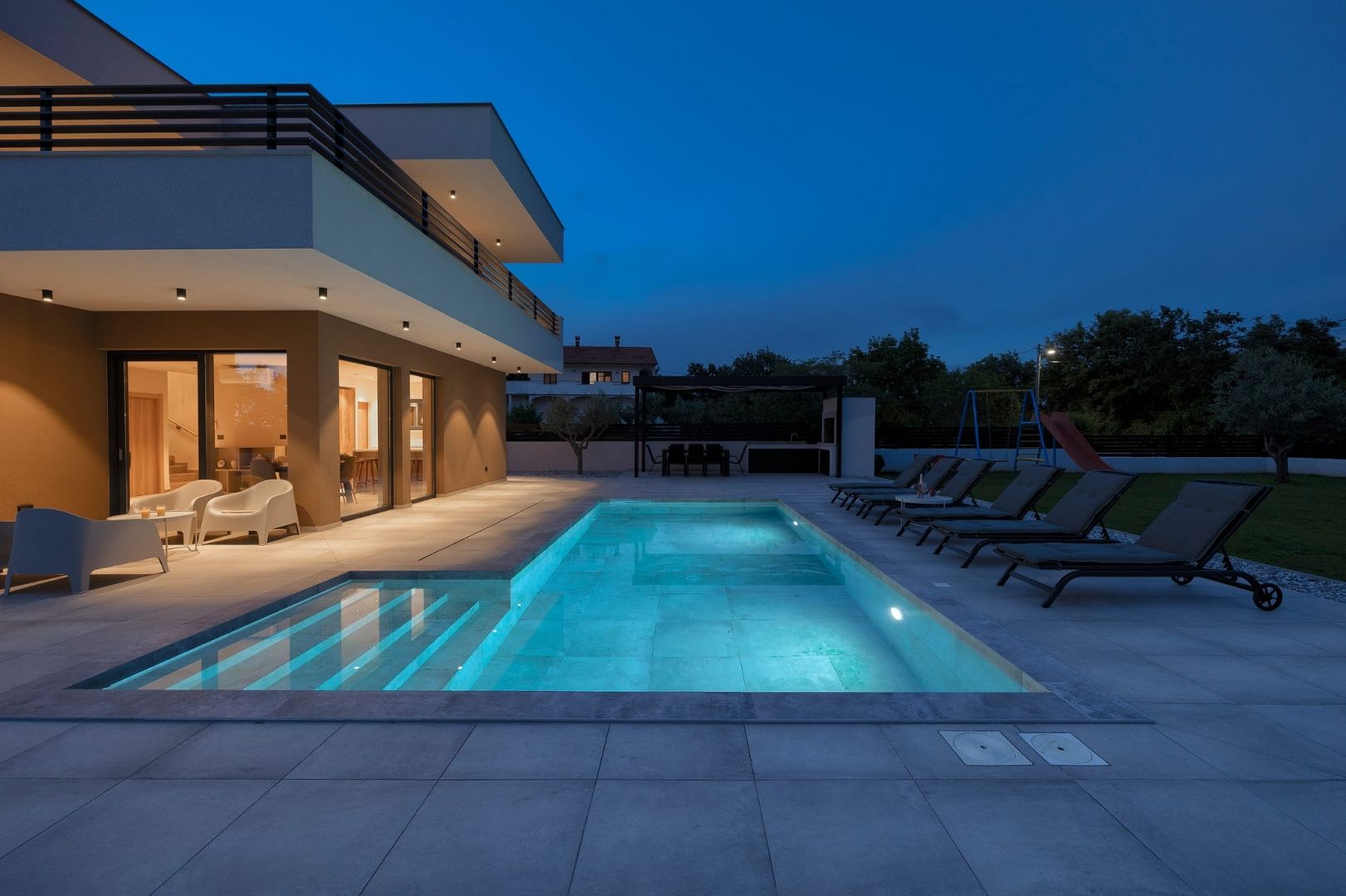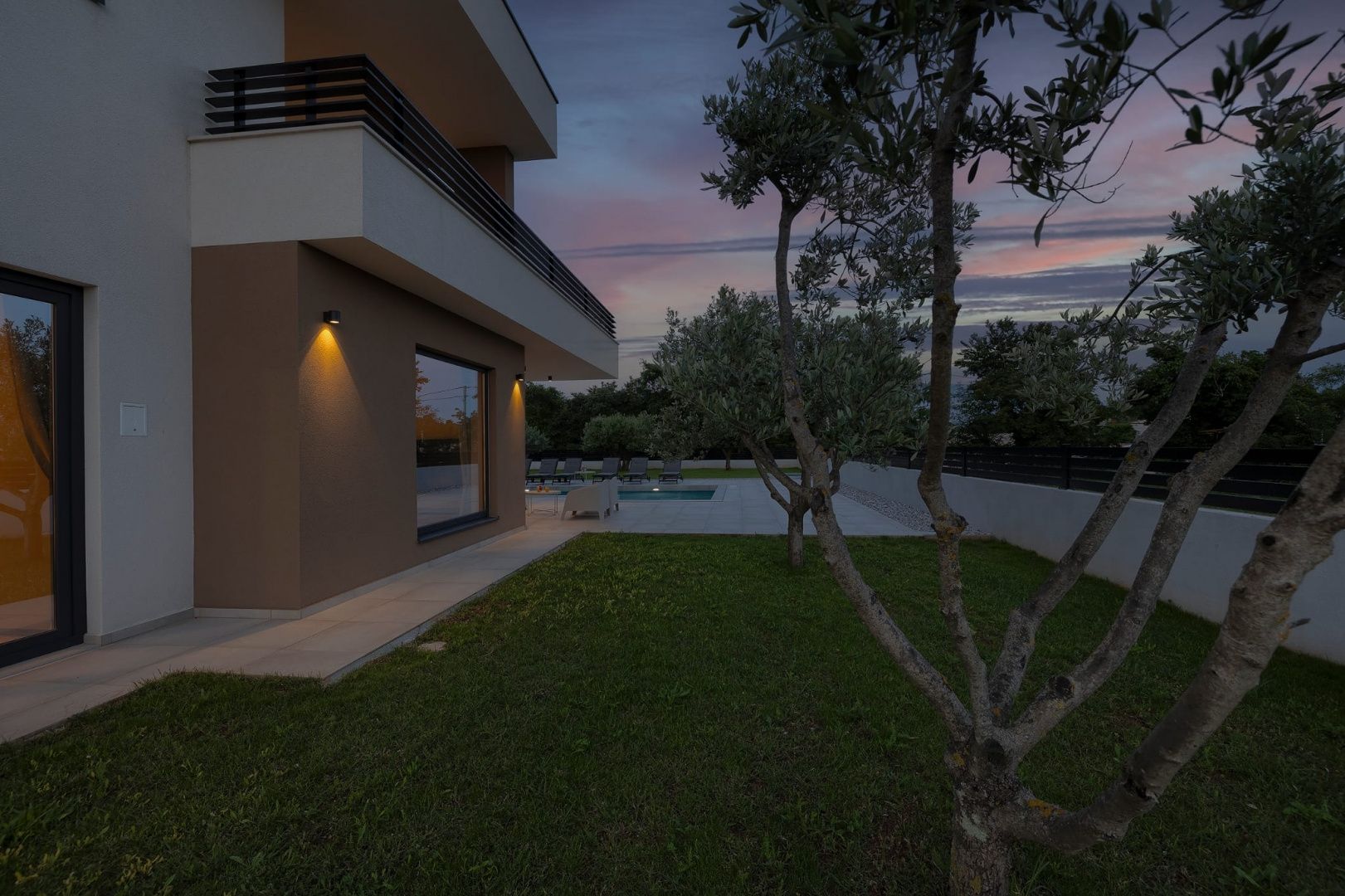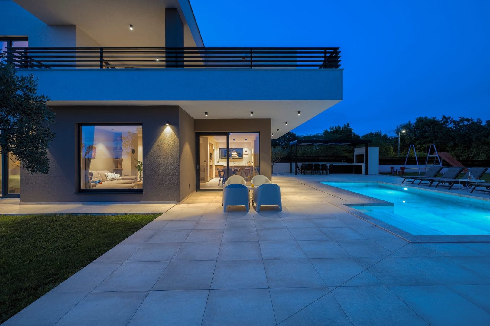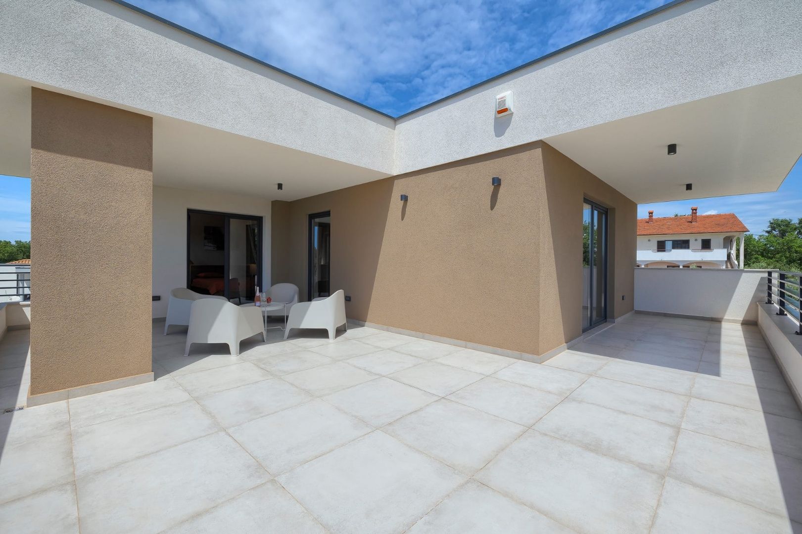 ISTRIE, MARČANA – Nová moderní vila s bazénem v klidném prostředí Obec Marčana se nachází v jihovýchodní části Istrie, známé svým klidným okolím, autentickou istrijskou atmosférou a dobrým dopravním spojením do Puly a na pobřeží. Oblast nabízí ideální rovnováhu mezi soukromím, přírodou a dostupností všech klíčových zařízení. Právě v takovém prostředí, v osadě Orbanići, se nachází tato moderní samostatně stojící vila, která kombinuje moderní styl výstavby a funkčnost přizpůsobenou každodennímu životu nebo turistickému pronájmu. Celková čistá obytná plocha je 170 m², rozložená do dvou podlaží – přízemí a první patro. Přízemí je navrženo jako otevřený prostor, který zahrnuje kuchyň, jídelnu a obývací pokoj s přístupem na krytou terasu (22,44 m²). Na stejném patře se nachází další ložnice, koupelna, prádelna a technická místnost. V patře se nacházejí dvě ložnice, každá s vlastní šatnou a koupelnou, s přístupem na prostornou částečně krytou terasu o rozloze 46 m². Budova byla postavena v roce 2025 s použitím kvalitních materiálů a moderních řešení: • tepelná izolace (15 cm polystyren) • hliníkové truhlářské práce • velké prosklené stěny pro maximální přirozené osvětlení • bezpečnostní dveře • kvalitní keramická podlaha (Marazzi) • invertorové klimatizace ve všech místnostech • nábytek na míru Vila se nachází na pozemku o rozloze 851 m². Zahrada je kompletně upravená a oplocená a zahrnuje: • 34 m² bazén se sluneční terasou • letní kuchyň s krbem a pergolou • dětské hřiště • několik parkovacích míst • automatizovaný hliníkový plot Nemovitost představuje kvalitní řešení pro klidný rodinný život nebo jako investici k turistickému pronájmu, s již potvrzenou dobrou obsazeností a funkčním uspořádáním prostoru.