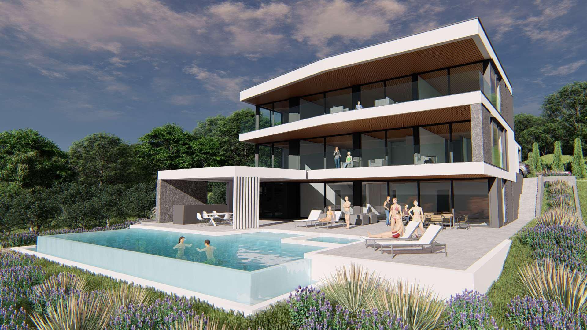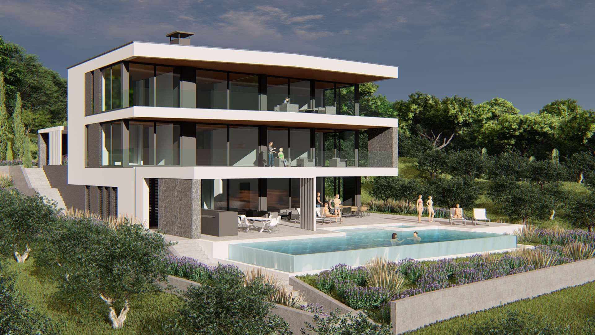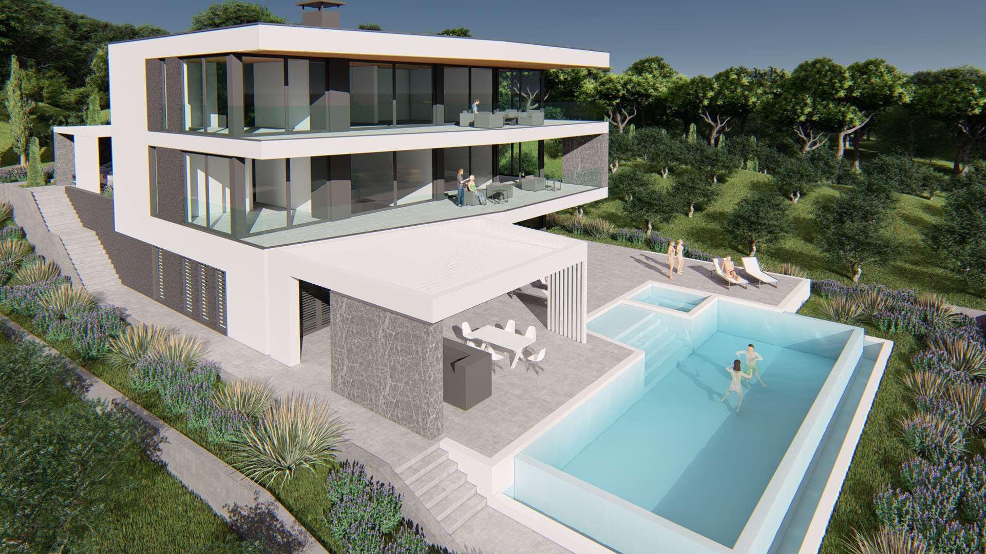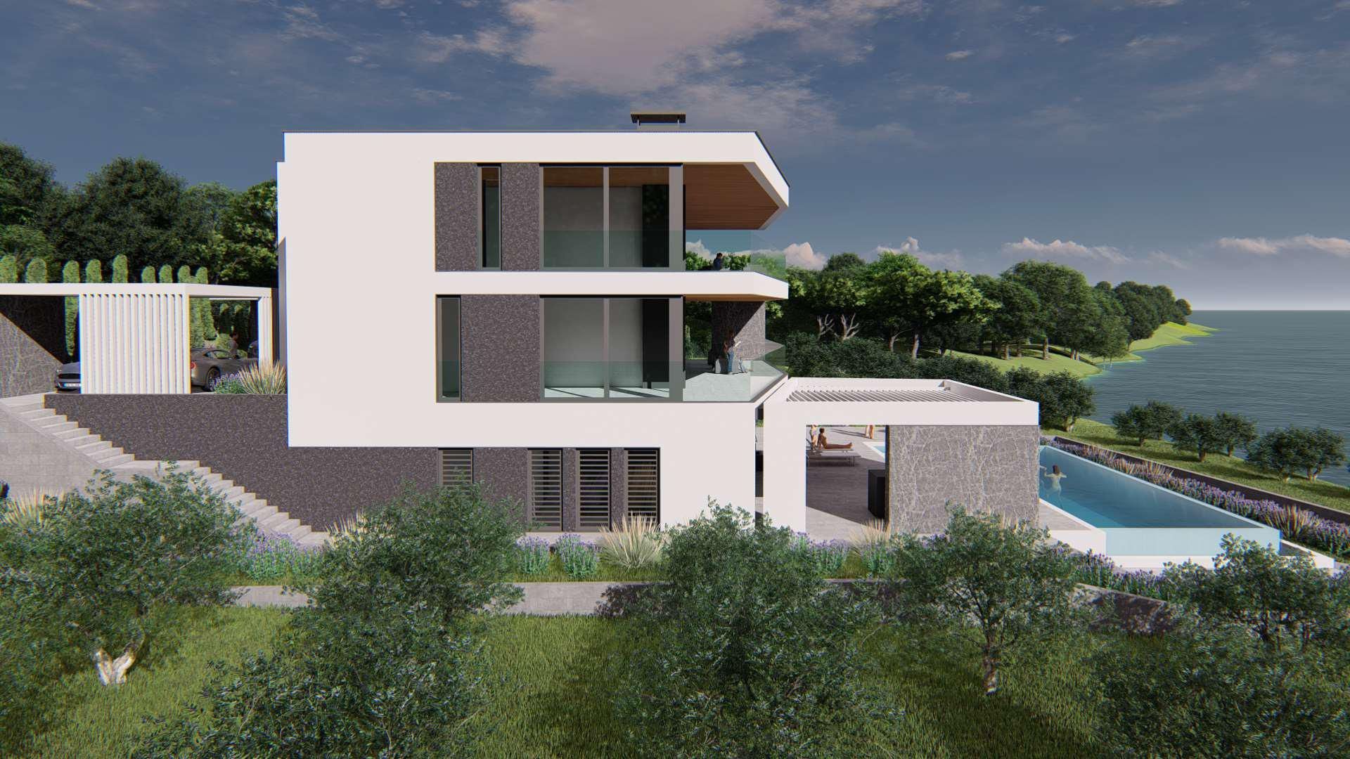 ISTRIE, MEDULIN - Stavební pozemek v 1. řadě k moři s vydaným a platným stavebním povolením na moderní vilu s bazénem a výtahem
