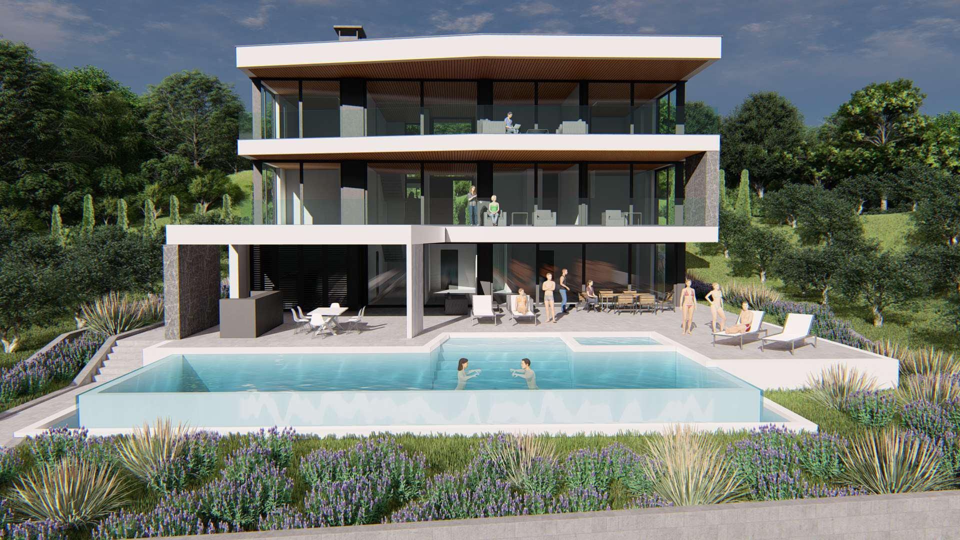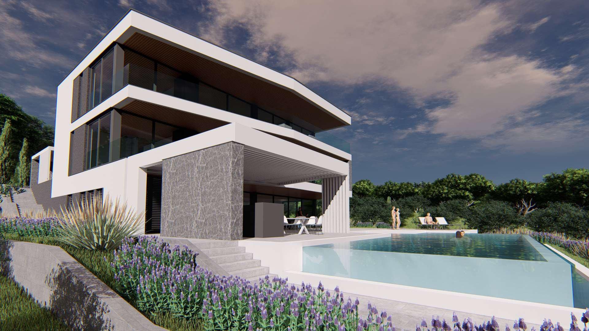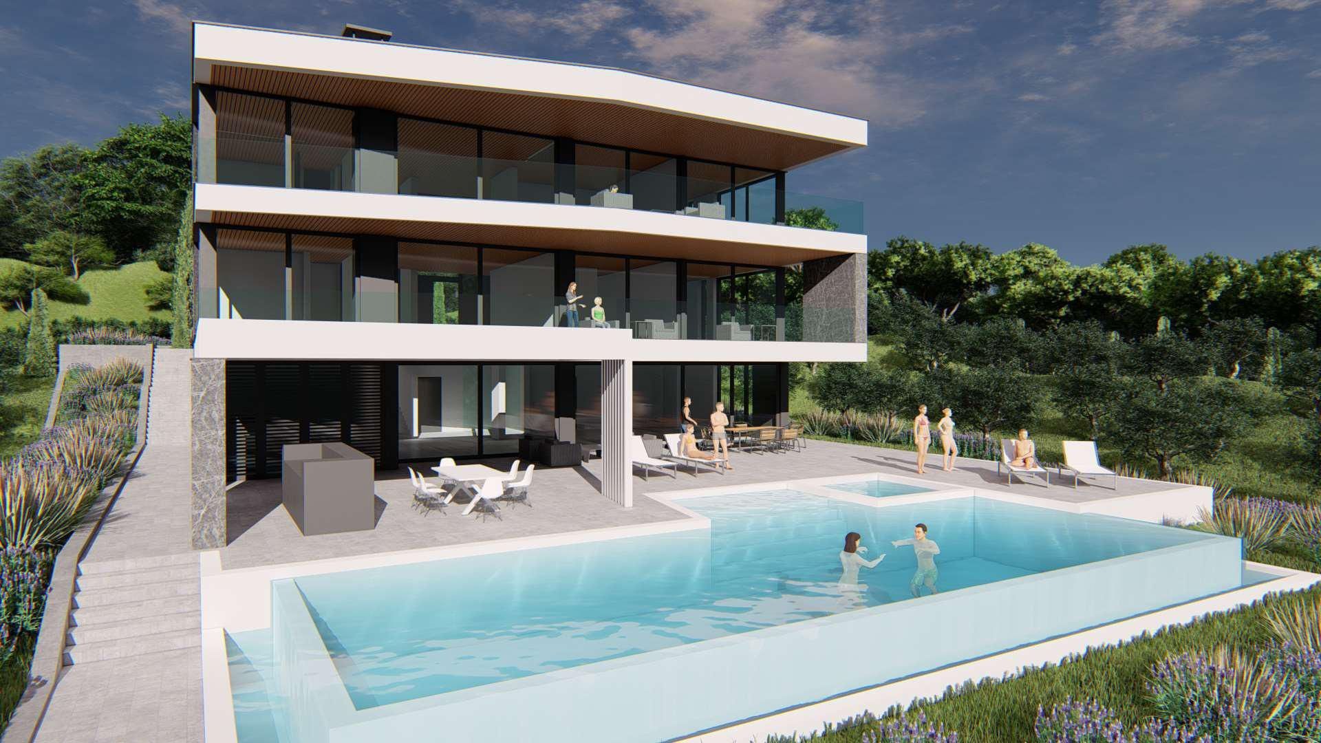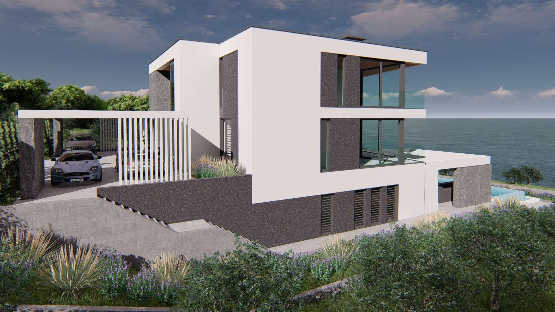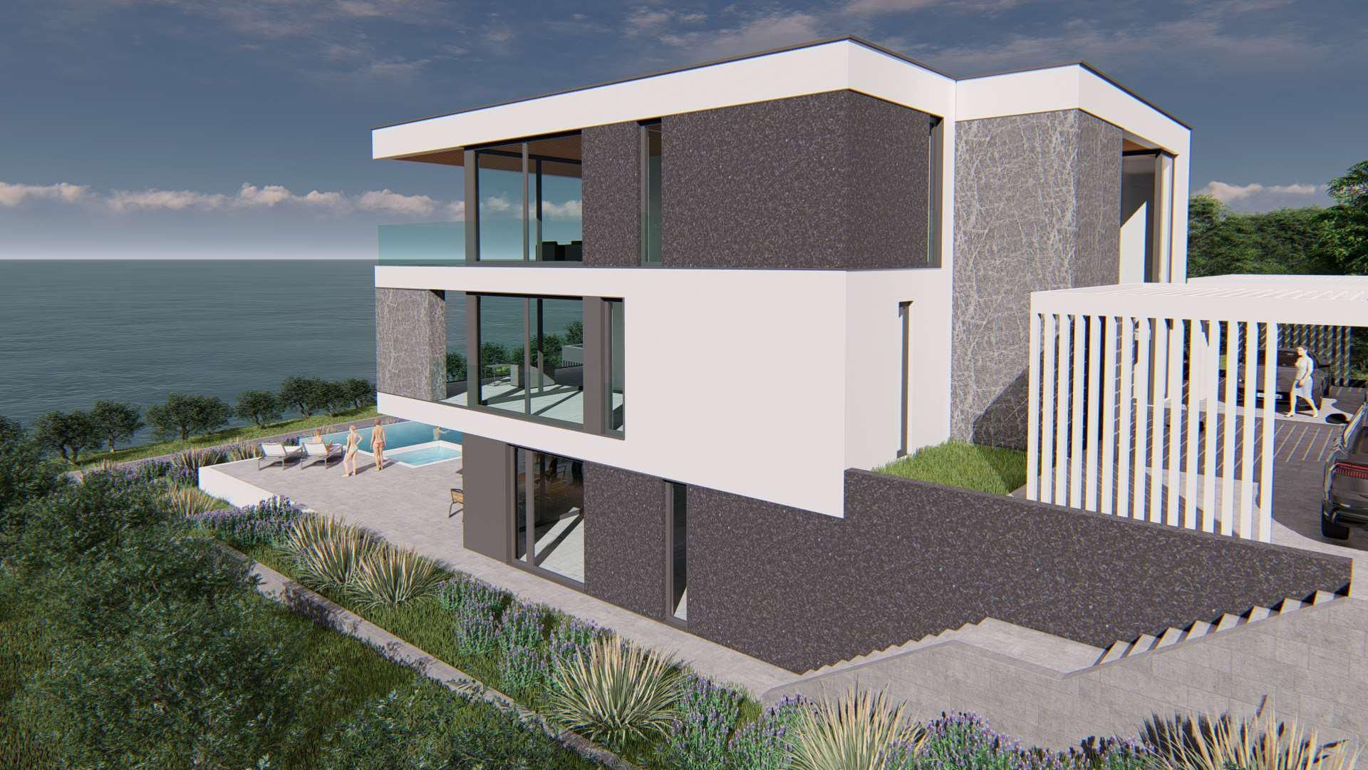 ISTRIE, MEDULIN - Stavební pozemek v 1. řadě k moři s vydaným a platným stavebním povolením na moderní vilu s bazénem a výtahem
