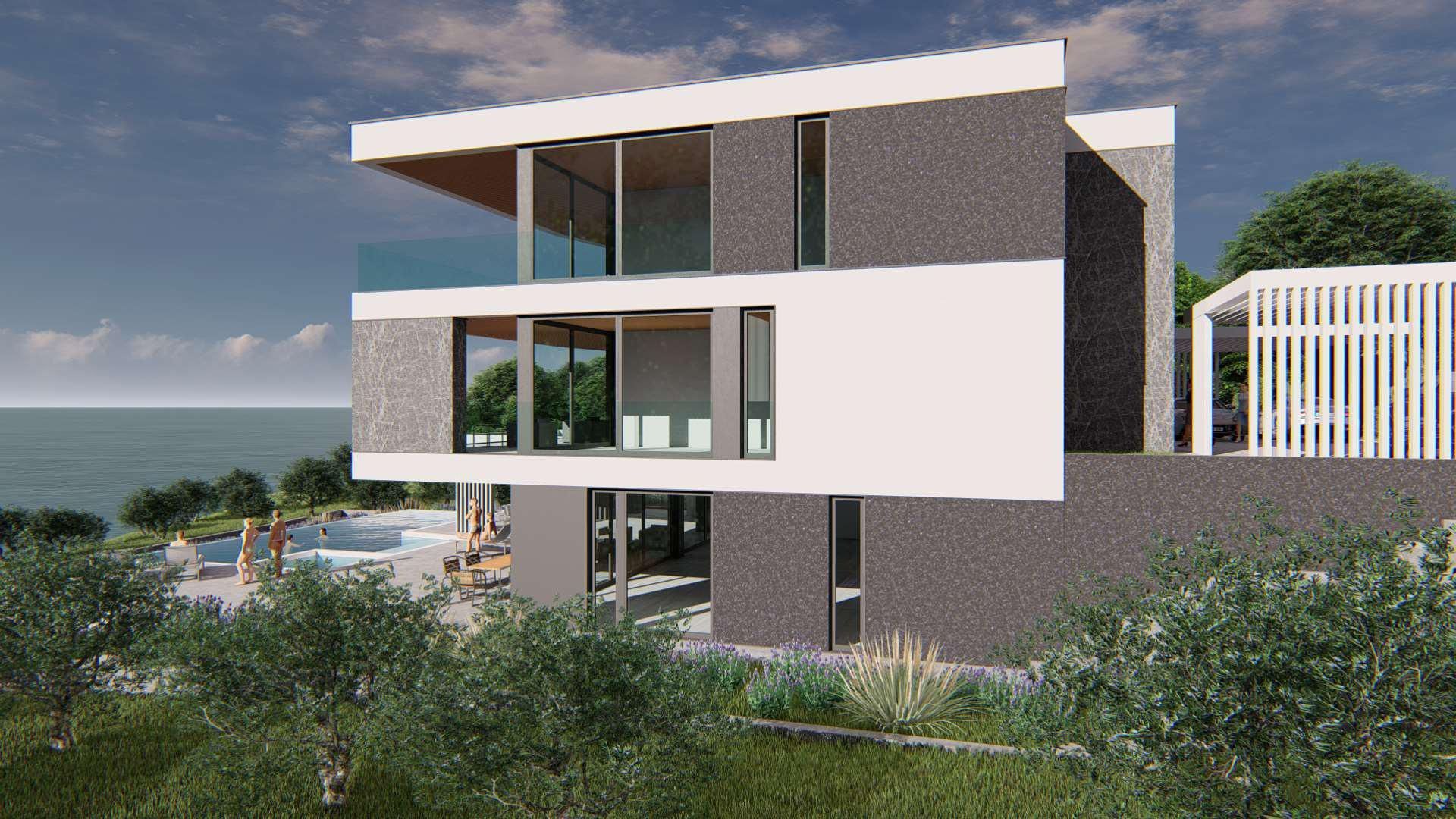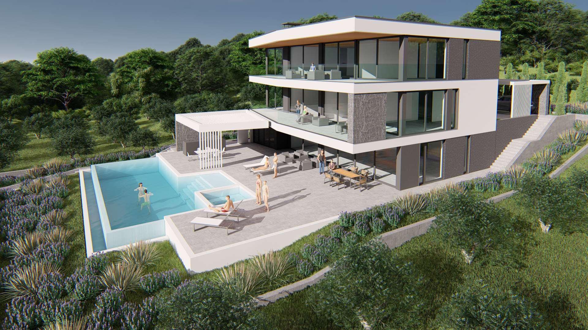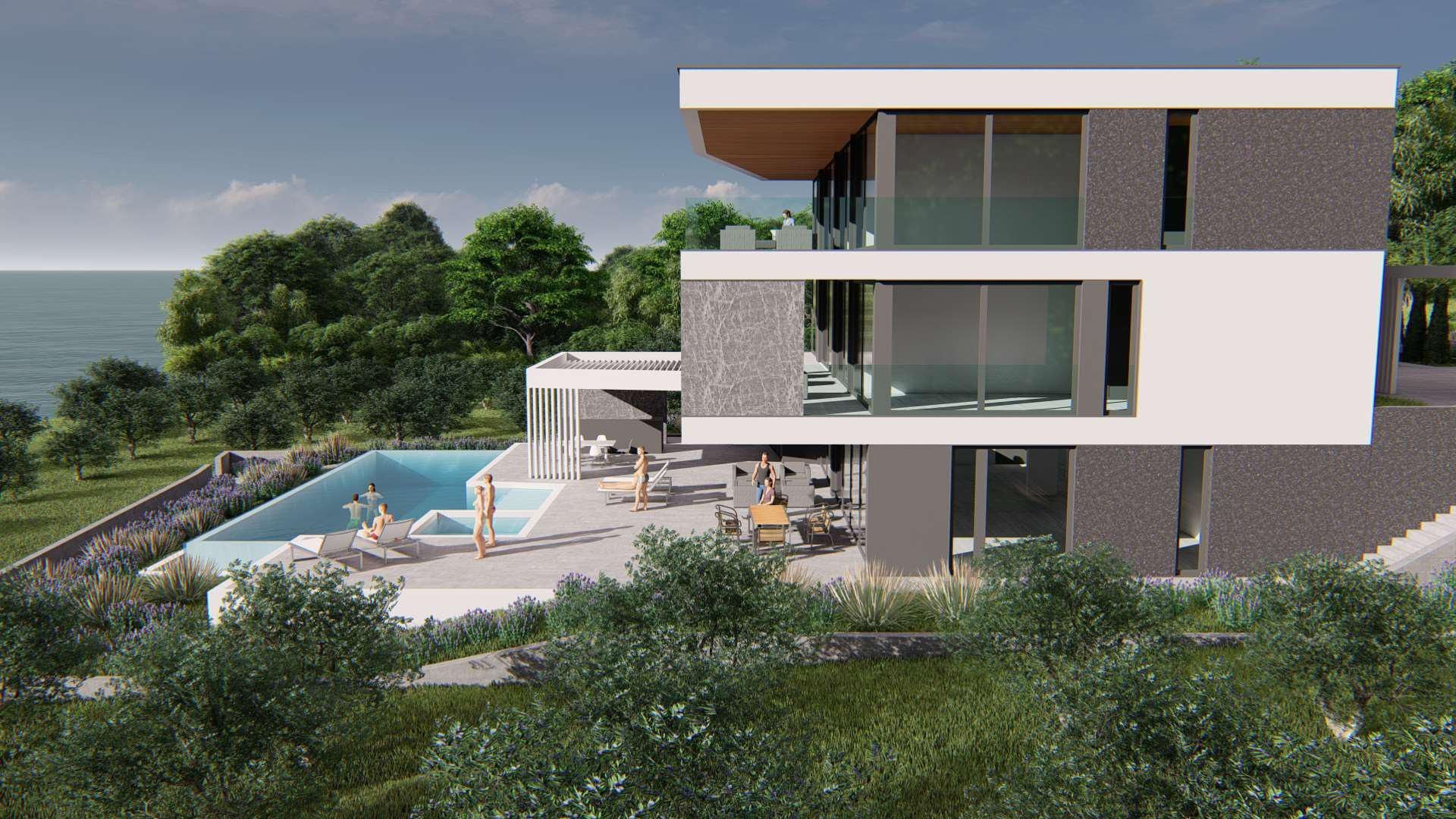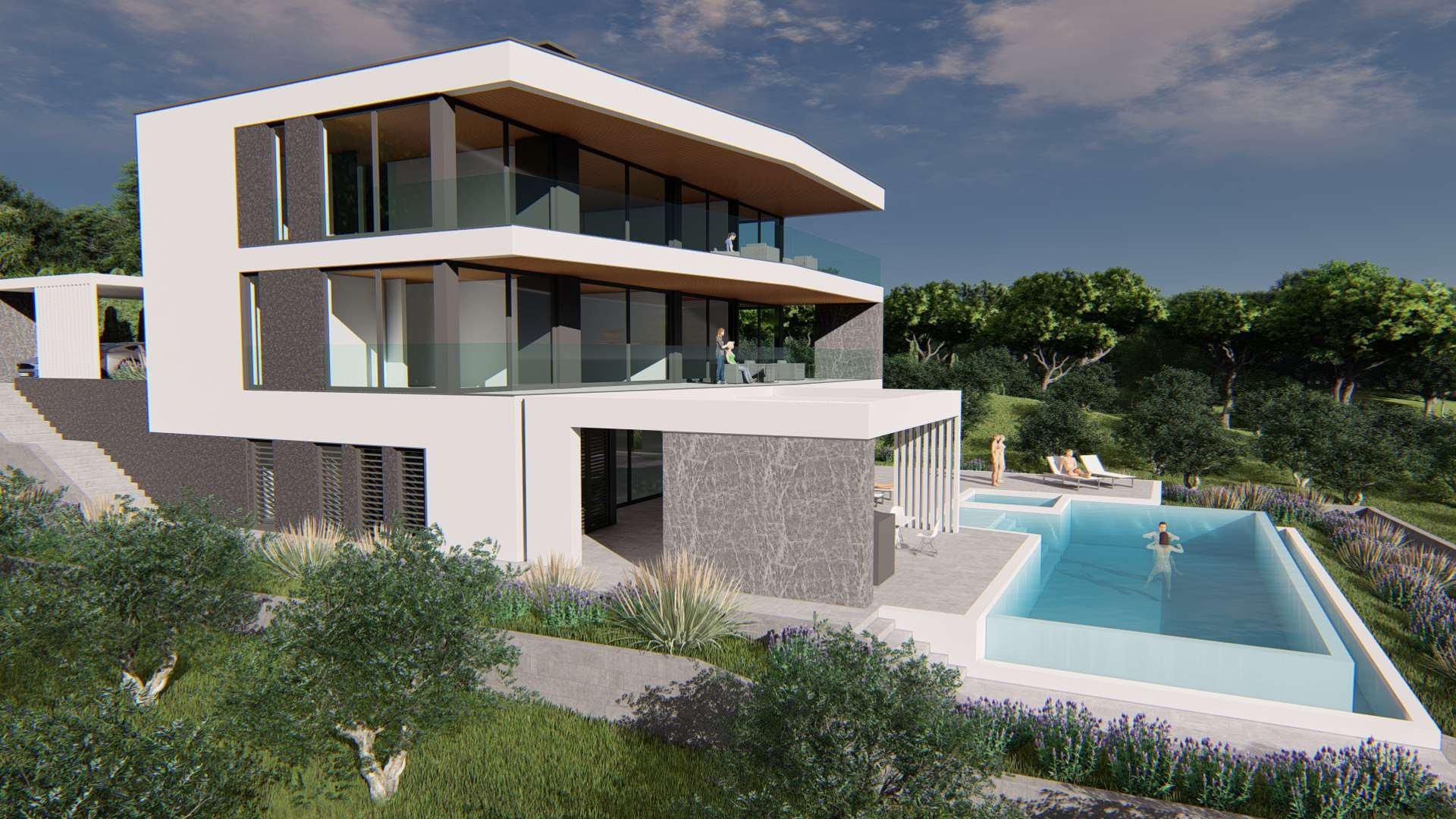 ISTRIE, MEDULIN - Stavební pozemek v 1. řadě k moři s vydaným a platným stavebním povolením na moderní vilu s bazénem a výtahem