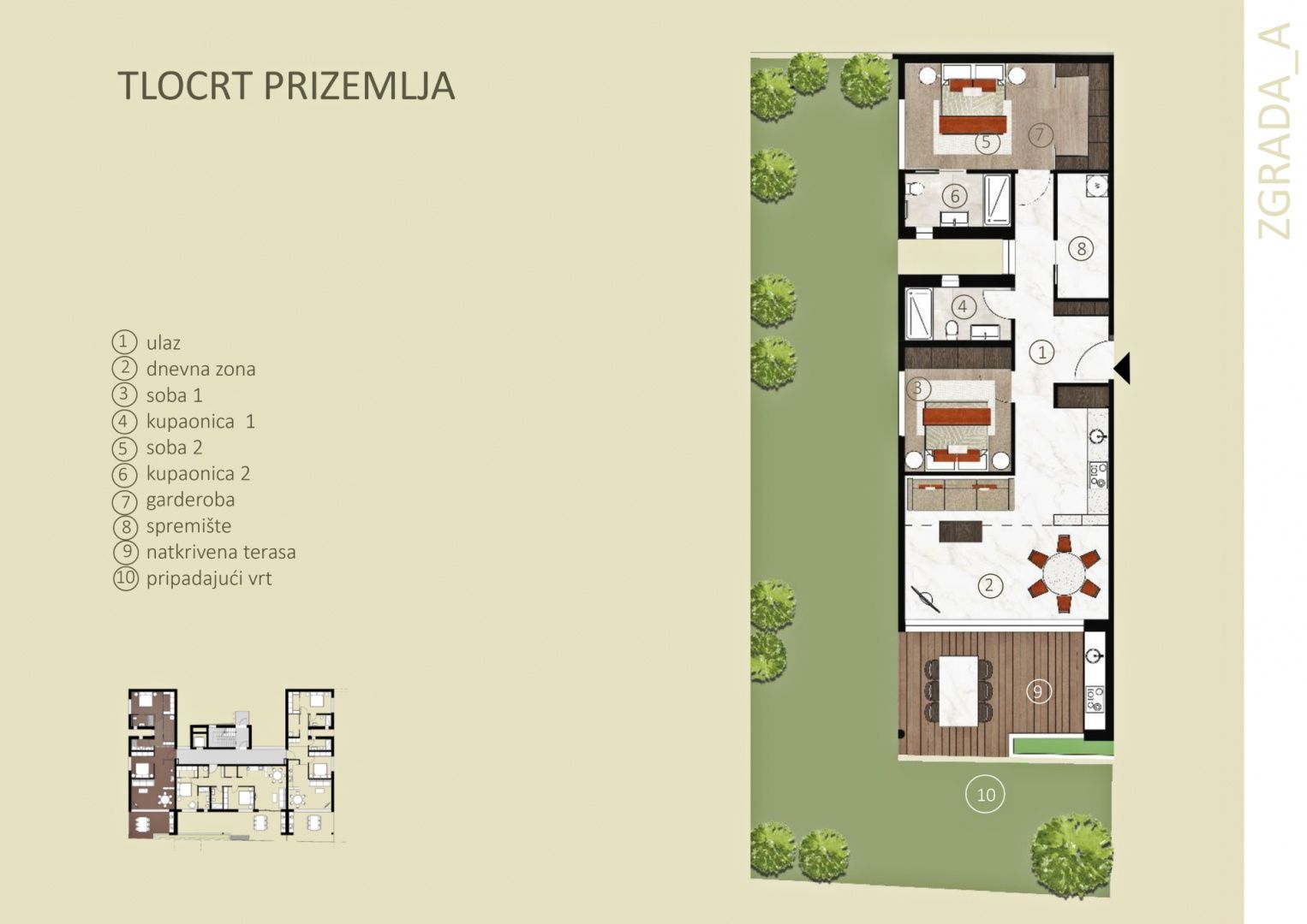 ISTRIE, NOVIGRAD - Apartmán se zahradou v moderní novostavbě Novigrad, kdysi klidná rybářská vesnice, se v průběhu let stal atraktivní destinací pro turisty z celé Evropy a světa, z nichž mnozí se pravidelně vracejí. Novigrad se stal jedním z nejžádanějších míst pro turistické pobyty a dovolenou a zachoval si své neodolatelné kouzlo klidného rybářského městečka, onu rozpoznatelnou, téměř intimní atmosféru, tak charakteristickou pro malá středomořská města. Novigrad, malé středomořské město, je architektonickou perlou plnou historických památek, bohatého kulturního dědictví, zachovalých přírodních krás, ale i špičkových gastronomických lahůdek a dalších atributů. Novigradská riviéra na západním pobřeží Istrie se táhne od Dajly až k ústí řeky Mirny a zdobí ji členité, nízké a přístupné pobřeží se skalnatými a oblázkovými plážemi. V rezidenční části Novigradu, v blízkosti moře a všech obchodních, kulturních, vzdělávacích a rekreačních zařízení, se nachází moderní designová budova, která se rozkládá suterénem, přízemím a dvěma patry a obsahuje celkem 8 bytových jednotek. Při stavbě byly použity odolné a spolehlivé materiály, které zaručují dlouhodobou spokojenost a bezpečnost bydlení. Plánování prostoru každého patra bylo provedeno do detailu, což vedlo ke kvalitnímu uspořádání místností. Spojení estetiky, funkčnosti a pohodlí je cílem, s nímž byly všechny byty navrženy. Současný styl je v souladu s nejnovějšími trendy v interiérovém designu s důrazem na decentní a nenápadné detaily, umocněné teplými odstíny přírodních barev. Kombinace tradičních materiálů a moderního designu zanechává dojem luxusu, který je zdůrazněn detaily, jako jsou dubové parkety I. třídy, velkoformátové keramické obklady I. třídy, vysoce kvalitní sanitární vybavení od renomovaných výrobců. Takový interiér v přírodní textuře a teplých odstínech nenápadně vyzařuje vřelost, zatímco vysoké stropy a čisté rovné linie s velkými prosklenými stěnami dále zdůrazňují prostornost. Předmětem prodeje je byt nacházející se v přízemí budovy. Byt se skládá ze dvou ložnic, dvou koupelen, chodby, úložného prostoru a otevřeného prostoru, který spojuje obývací pokoj, jídelnu a kuchyň s přístupem na terasu a zahradu o rozloze 147,80 m². K bytu patří úložný prostor v suterénu budovy o rozloze 4,95 m² a kryté parkovací místo o rozloze 14,00 m². Tato luxusní novostavba je ideální příležitostí pro pohodlné rodinné bydlení i pro investici za účelem turistického pronájmu. Uvedená cena nemovitosti se vztahuje k konečnému stupni dokončení bez nábytku, což umožňuje finální úpravu dle vlastního přání a preferencí. Prodejce dané nemovitosti je právnickou osobou a DPH je zahrnuta v uvedené ceně.