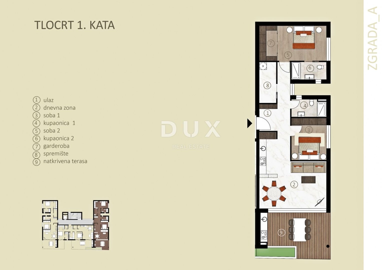 ISTRIE, NOVIGRAD - Komfortní apartmán v luxusní novostavbě Novigrad, kdysi klidná rybářská vesnice, se v průběhu let stal atraktivní destinací pro turisty z celé Evropy a světa, z nichž mnozí se pravidelně vracejí. Novigrad se stal jedním z nejžádanějších míst pro turistické pobyty a dovolenou a zachoval si své neodolatelné kouzlo klidného rybářského městečka, onu rozpoznatelnou, téměř intimní atmosféru, tak charakteristickou pro malá středomořská města. Novigrad, malé středomořské městečko, je architektonickou perlou plnou historických památek, bohatého kulturního dědictví, zachovalých přírodních krás, ale i špičkových gastronomických lahůdek a dalších atributů. Novigradská riviéra na západním pobřeží Istrie se táhne od Dajly až k ústí řeky Mirny a zdobí ji členité, nízké a přístupné pobřeží se skalnatými a oblázkovými plážemi. V rezidenční části Novigradu, v blízkosti moře a všech obchodních, kulturních, vzdělávacích a rekreačních zařízení, se nachází moderní designová budova, která se rozkládá suterénem, přízemím a dvěma patry a obsahuje celkem 8 bytových jednotek. Při stavbě byly použity odolné a spolehlivé materiály, které zaručují dlouhodobou spokojenost a bezpečnost bydlení. Plánování prostoru každého patra bylo provedeno do detailu, což vedlo ke kvalitnímu uspořádání místností. Spojení estetiky, funkčnosti a pohodlí je cílem, s nímž byly všechny byty navrženy. Současný styl je v souladu s nejnovějšími trendy v interiérovém designu s důrazem na decentní a nenápadné detaily, umocněné teplými odstíny přírodních barev. Kombinace tradičních materiálů a moderního designu zanechává dojem luxusu, který je zdůrazněn detaily, jako jsou dubové parkety I. třídy, velkoformátové keramické obklady I. třídy, vysoce kvalitní sanitární vybavení od renomovaných výrobců. Takový interiér v přírodní textuře a teplých odstínech nenápadně vyzařuje vřelost, zatímco vysoké stropy a čisté rovné linie s velkými prosklenými stěnami dále zdůrazňují prostornost. Předmětem prodeje je byt nacházející se v prvním patře budovy. Byt se skládá ze dvou ložnic, dvou koupelen, chodby, úložného prostoru a otevřeného prostoru, který spojuje obývací pokoj, jídelnu a kuchyň s přístupem na terasu. K bytu patří úložný prostor v suterénu budovy o rozloze 4,39 m² a kryté parkovací místo o rozloze 15,00 m². Tato luxusní novostavba je ideální příležitostí pro pohodlné rodinné bydlení i pro investici za účelem turistického pronájmu. Uvedená cena nemovitosti se vztahuje k konečnému stupni dokončení bez nábytku, což umožňuje finální uspořádání dle vlastních přání a preferencí. Prodejce předmětné nemovitosti je právnickou osobou a DPH je zahrnuta v uvedené ceně.