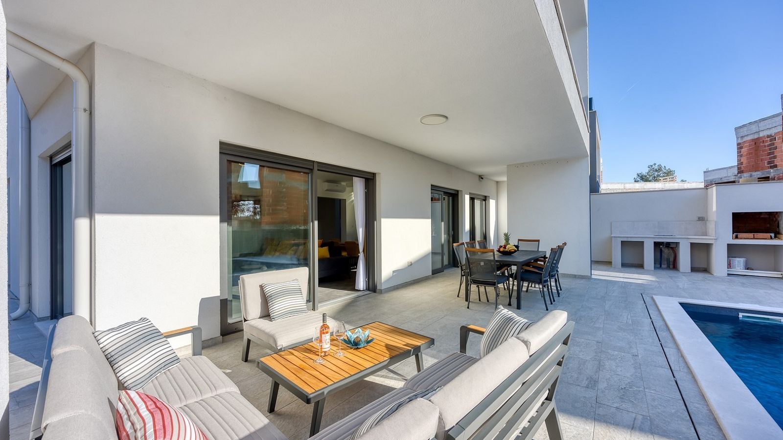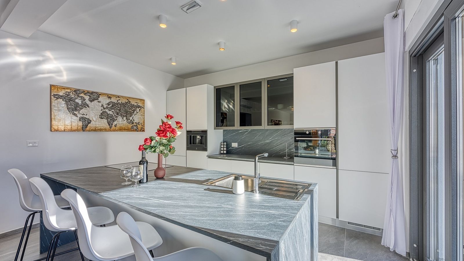 ISTRIE, POREČ - Luxusní dvojdomek s bazénem, saunou a vířivkou, 260 m2 V klidné rezidenční čtvrti nedaleko Poreče, pouhých 1300 metrů od moře, se nachází moderně navržený dvojdomek postavený v roce 2023. Kombinace současné architektury a funkčního uspořádání prostoru činí z této nemovitosti ideální volbu pro luxusní turistický pronájem, ale také jako soukromou oázu k úniku od každodenního života. Dům o celkové rozloze 260 m² se rozkládá na třech podlažích a nachází se na pozemku o rozloze 481 m². Na první pohled zaujme svým pečlivě uspořádaným exteriérem, soukromím a moderním designem, který vyzařuje eleganci. V přízemí se nachází prostorný obývací pokoj s otevřeným konceptem - kuchyň, jídelna a obývací pokoj jsou harmonicky propojeny do jednoho funkčního celku s přístupem na krytou terasu a do zahrady. V přízemí se dále nachází vstupní hala, toaleta pro hosty a technická místnost/úložný prostor. V prvním patře se nacházejí tři pohodlné ložnice, každá s vlastní koupelnou. Dva pokoje sdílejí krytou terasu s výhledem na zeleň a okolí. Druhé patro, navržené jako prostor pro relaxaci a rekreaci, dodává domu zvláštní hodnotu. Vířivka, sauna, fitness vybavení a luxusní koupelna s volně stojící vanou poskytují soukromý wellness zážitek. Kromě toho všeho je zde velká terasa o rozloze 52 m² - ideální pro opalování, večerní posezení nebo jen pro užívání si výhledu a ticha. Dům je klimatizován a vytápění je zajištěno podlahovým systémem připojeným k tepelnému čerpadlu. Byly provedeny také instalace pro vytápění bazénu, což umožňuje celoroční užívání. PVC truhlářství a moderní materiály dále přispívají ke kvalitě konstrukce a energetické účinnosti. Vzdálenost od centra města je pouhých 500 metrů a veškeré klíčové vybavení - obchody, restaurace, promenády a pláže - je snadno dostupné pěšky nebo na kole. Tato nemovitost představuje perfektní kombinaci moderního životního stylu a středomořské atmosféry. Ať už hledáte investiční příležitost s vysokým turistickým potenciálem nebo soukromé útočiště pro odpočinek a zábavu, tento dům nabízí vše - styl, pohodlí, vybavení a vynikající polohu. Vážení potenciální kupující, těší nás, že máte zájem o nemovitosti z naší nabídky. Pro více informací a pro sjednání prohlídky nemovitosti nás neváhejte kontaktovat. Prohlídka nemovitosti je možná pouze s podpisem realitní smlouvy.