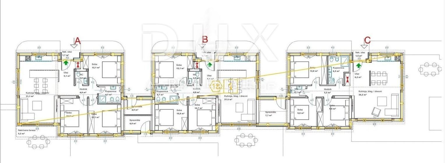 ISTRIE, POREČ - Novostavba, designový přízemní dům se soukromým bazénem Poreč je jedno z nejznámějších turistických měst na Istrii, které se nachází na západním pobřeží poloostrova. Je známé svou bohatou historií, udržovanými plážemi, vynikající gastronomickou nabídkou a živou středomořskou atmosférou. Město se pyšní Eufraziovou bazilikou, která je na seznamu chráněných památek UNESCO, okouzlujícím starým městem a četnými kulturními a sportovními zařízeními. Je to ideální místo k životu a relaxaci s vynikajícím dopravním spojením a rozvinutou infrastrukturou. V klidném a malebném Kašteliru, pouhých 13 kilometrů od Poreče a pobřeží Jaderského moře, se nachází moderní přízemní dům, který představuje ideální kombinaci současného designu, funkčnosti a pohodlí. Obklopen vinicemi, olivovými háji a charakteristickou červenou půdou, tato novostavba nabízí jedinečný pocit istrijské atmosféry v kombinaci s moderním životním standardem. Dům se rozkládá na jednom patře s celkovou obytnou plochou 91 m². Interiér zahrnuje vstupní halu, prostorný a světlý obývací pokoj propojený s kuchyní a jídelnou v otevřeném konceptu, tři pohodlné ložnice, jednu moderní koupelnu a další toaletu pro hosty. Z obývacího pokoje je vstup na terasu, ideální pro příjemné teplé istrijské večery. Vysoké stropy ve všech místnostech dále otevírají prostor. Zahrada o rozloze přibližně 300 m² je pečlivě upravená a oplocená a zahrnuje 30 m² soukromý bazén se sluneční terasou, udržovanou zahradu, soukromý vchod a parkovací místo vedle domu. Další parkovací místo je k dispozici také na sdíleném parkovišti pro hosty. U vchodu do budovy je k dispozici nabíjecí stanice pro elektromobily. Dům je také vybaven solárními panely, které přispívají k energetické účinnosti. Kvalita konstrukce a pečlivě vybrané materiály zajišťují vysoký standard bydlení. Jsou instalována plastová okna s trojsklem a hliníkové vstupní dveře (bílé z vnitřní strany a antracitové z vnější strany). Dům je vybaven elektrickým podlahovým vytápěním v kombinaci s klimatizačními jednotkami, které zajišťují vytápění i chlazení, a celý systém lze ovládat pomocí mobilní aplikace. Nemovitost má zabudovaný video dohled zepředu i zezadu pro větší bezpečnost. Částečný výhled na moře dále přispívá k pocitu klidu a luxusu. Dům se prodává na klíč a dokončení prací je plánováno do konce roku 2025. Je také možné domluvit koupi v současné fázi výstavby, což poskytuje možnost dalších úprav dle individuálních přání. Tato nemovitost představuje vynikající příležitost pro každého, kdo hledá moderní, funkční a esteticky atraktivní bydlení v jedné z nejvyhledávanějších lokalit na Istrii. Existuje také možnost koupě všech tří domů z projektu za celkovou cenu 1 245 000 EUR.
