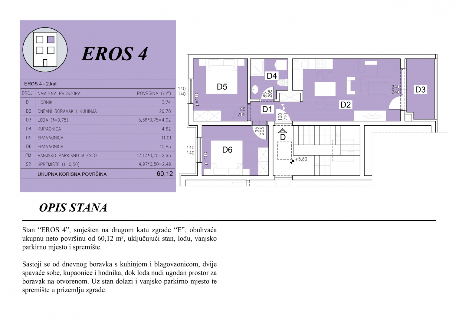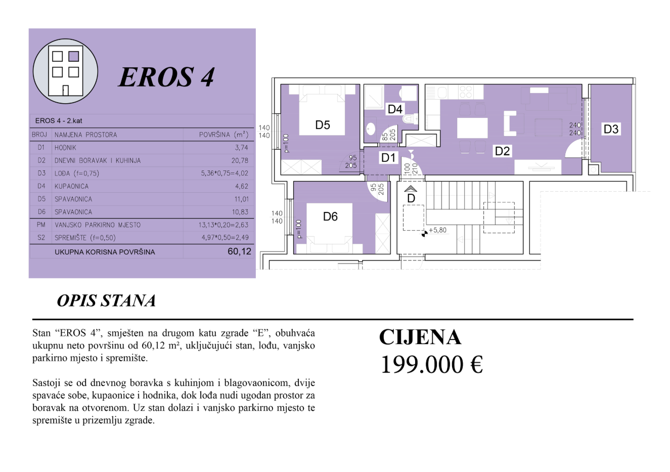 ISTRIE, PULA - Moderní novostavba v žádané lokalitě! V atraktivní lokalitě, u vjezdu do Puly, byl postaven nový projekt, který zahrnuje výstavbu moderního rezidenčního komplexu šesti budov s celkem 24 byty. Plánované dokončení výstavby je jaro 2027, se všemi potřebnými povoleními a energetickou certifikací. POPIS NEMOVITOSTI: Projekt počítá se čtyřmi byty v každé budově o rozloze od 60 m2 do 88 m2 - dva v prvním patře, dva ve druhém patře. Díky efektivnímu uspořádání bude mít každý byt dvě ložnice, prostornou kuchyň s obývacím pokojem, koupelnu a lodžii. Projekt zahrnuje také vlastní garáž nebo venkovní parkovací stání a úložný prostor pro každou bytovou jednotku v přízemí budovy. EXTERIÉR: Okolí budovy je plánováno tak, aby zahrnovalo zelené plochy s původními istrijskými rostlinami, trávník s automatickým zavlažováním, zpevněné chodníky a příjezdové cesty, živý plot pro soukromí, LED osvětlení s detekcí pohybu a udržitelný odvodňovací systém pomocí podzemních vpustí a absorpční studny. TECHNICKÉ ÚDAJE: Vnitřní design bytových domů bude splňovat vysoké standardy kvality (energetická třída A/A+): - Tepelně izolační fasáda (ETICS) a vysoce účinná tepelná izolace o tloušťce 10 cm (minerální vlna/EPS) - Vstupní dveře odolné proti vloupání, vnější truhlářské práce z PVC profilů s dvouvrstvým IZO sklem plněným argonem a rolety. - Ve všech místnostech bytů bude instalována vysoce kvalitní keramika moderního designu, pečlivě vybraná z hlediska odolnosti a estetiky. Na lodžiích bude použita protiskluzová keramika pro větší bezpečnost a pohodlí pobytu. - Vytápění a chlazení každé jednotky klimatizací a elektrické podlahové vytápění v koupelně, obývacím pokoji a kuchyni. V koupelnách jsou také elektrické radiátory (sušičky) s termostatem. LOKALITA: - blízkost hlavní městské silnice, rychlý přístup do centra Puly, autobusového nádraží a sjezdu na Istrijský Y. - jen pár minut chůze do obchodů Lidl, Plodin, Kaufland, Pevex, Bauhaus a dalších - ideální pro každodenní život. - vzdálenost do lesoparku Šijana je jen pár minut - ideální pro procházky, běh, cyklistiku a rodinné aktivity v přírodě. - v blízkosti se nacházejí mateřské školy, základní škola Šijana, sportovní zařízení a dětská hřiště. - osada má rezidenční charakter, je daleko od městského hluku, ale přesto velmi blízko veškeré základní občanské vybavenosti. Vynikající projekt ve vyhledávané lokalitě, který poskytuje vše, co potřebujete pro novou stránku svého života. Pro veškeré další informace a domluvení prohlídky nemovitosti volejte svého makléře!
