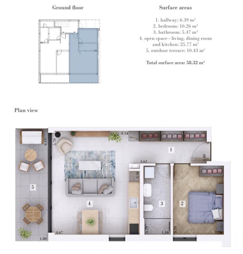 ISTRIE, ROVINJSKO SELO - 1BR+LR vysoce kvalitní byt v přízemí novostavby s vlastní zahradou a parkovacím stáním. S hrdostí představujeme tento vysoce kvalitní a luxusní nový stavební projekt, který se nachází jen 2 minuty jízdy od centra vesnice Rovinj. Jedná se o projekt nových menších bytových domů, které se nacházejí v klidné lokalitě, pouhé 2 minuty od veškeré potřebné občanské vybavenosti a zároveň jen 10 km od nevyhnutelného města Rovinj. V tomto projektu vám tedy s potěšením představujeme pohodlný, prostorný a slunný byt v přízemí budovy, který svým budoucím majitelům nabízí vše, co potřebují pro nezapomenutelný pobyt, maximální pohodlí a vysokou úroveň luxusu. POPIS BYTU: Byt se skládá z celkem 58,32 m2 obytné plochy, která navíc zahrnuje soukromý dvůr cca 40 m2 a jedno parkovací stání, vše zahrnuto ve viditelné ceně bytu. Po vstupu do bytu se nachází předsíň s vyhrazeným prostorem pro šatní skříň, ze které se následně dostaneme do obytné části bytu. Zde máte možnost trávit čas v prostoru „open space“, bez příček, kde je prostor pro moderní kuchyni, jídelnu i pohodlný obývací pokoj. To, co zdobí tuto část bytu, jsou velké posuvné prosklené stěny, kterými do bytu proniká bohaté množství přirozeného světla a které slouží i pro výstup na venkovní zastřešenou terasu o velikosti 10,43 m2. Terasa je ideální pro popíjení ranní kávy, dále pak pro relaxaci nebo zábavu během dne s rodinou a přáteli, stejně jako pro večerní sklenku oblíbeného vína. Zmíněná terasa má přímou komunikaci se soukromým dvorem bytu o velikosti cca 40m2 užitné plochy. K bytu dále náleží jedno hlídané parkovací stání. Na pozemku jsou plánovány tři nabíječky pro elektromobily, které budoucím majitelům poskytnou praktické a ekologicky udržitelné řešení nabíjení jejich vozů. DOPLŇUJÍCÍ INFORMACE K BYTU: * Uvedená cena je včetně DPH pro fyzické osoby, zatímco pro právnické osoby (firmy) bude cena snížena o 25% DPH. * Kvalitní vybavení a materiály * Vytápění a chlazení: Systém vytápění a chlazení Multi-Split. Podlahové vytápění v koupelně a kuchyni je na přání kupujícího možné instalovat v celém bytě. * Podlahy: italská dlažba v celém bytě kromě ložnice, kde jsou dřevěné podlahy. * Tesařství: Velké skleněné portály jsou vyrobeny z bílého PVC truhlářství s hliníkovým vnějším opláštěním v antracitové barvě. Trojsklo a hliníkové rolety s elektrickými zdvihy. Balkonové dveře jsou zdvižně posuvné. * Detaily interiéru: Snížená část stropu u skleněného portálu skrývá římsu a přispívá k elegantnímu vzhledu prostoru. * Kotel: Invertor třídy A pro sanitární teplou vodu v koupelně a kuchyni. * Vodovodní baterie: Hans Grohe nebo Grohe – špičková kvalita a moderní design. * Sanitární keramika: Vestavěná splachovací nádržka, záchod a umyvadlo od Grohe, Geberit nebo ekvivalentní kvality. DOPLŇUJÍCÍ INFORMACE O STAVBĚ: * Kvalitní provedení a moderní styl fasády s kamenným obkladem * Fasáda budovy je 10 cm silná demit, s dekorativními kamennými prvky dle vyobrazených vizualizací. * Společné prostory: Na chodbě budovy je žulový kámen, zatímco zábradlí bude kované s dřevěným zábradlím, což mu dodává zvláštní luxusní vzhled. POPIS POLOHY: Byt se nachází v klidné obci s veškerou potřebnou občanskou vybaveností v okolí, jako jsou: * Škola - 1,7 km * Supermarket - 2,4 km * Mateřská škola - 1,7 km * MHD - 150 m * Restaurace - 100 m * Skvělé spojení: Dálnice 5 km, Rovinj 7 km. PLÁNOVANÉ TERMÍNY: *Zahájení stavby*: 15.03.2025. *Plánovaný termín dokončení*: 01.04.2026. V případě jakýchkoliv dalších dotazů, potřebných informací nebo v případě, že byste si chtěli naplánovat prohlídku lokality nebo si domluvit schůzku s investory, nás neváhejte kdykoli kontaktovat.