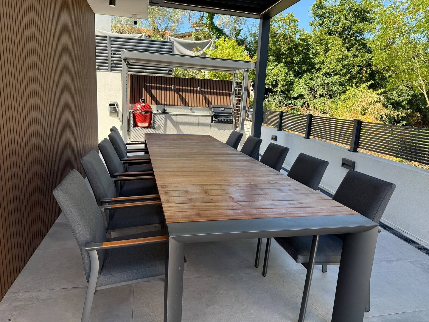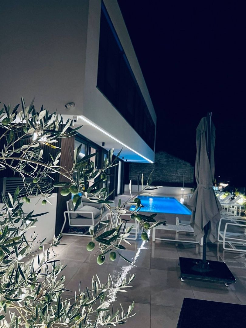 ISTRIE, ROVINJSKÁ VESNICE Kouzelná vila s bazénem u moře V klidném istrijském prostředí, jen pár minut jízdy od kouzelného Rovinje, se nachází tato jedinečná a luxusně zařízená vila, která nabízí ideální útočiště pro odpočinek, relaxaci a společenské setkání. Dům se nachází v malé vesnici s restaurací, barem a obchodem v docházkové vzdálenosti a kombinuje naprostý klid s blízkostí veškeré občanské vybavenosti a krásného pobřeží. Prostorná a slunná vila se rozkládá na dvou podlažích a nabízí čtyři velké, pohodlné ložnice, každá s vlastní koupelnou, klimatizací a TV, což poskytuje naprosté soukromí a pohodlí. Otevřený obývací pokoj s velkými prosklenými stěnami se otevírá na venkovní terasu a k vyhřívanému bazénu, čímž vytváří ideální kombinaci vnitřního a venkovního prostoru. Interiér domu je zařízen luxusním italským nábytkem a kuchyň je vybavena špičkovými domácími spotřebiči Miele, včetně kávovaru Miele. Velká jídelna je propojena s venkovním prostorem, který zahrnuje terasu s posezením, letní kuchyň s plynovým grilem a keramickým grilem na dřevěné uhlí Kamado Joe, ideálním pro večeře s přáteli nebo rodinou. Prostorná terasa s jídelním stolem pro deset osob je chráněna bioklimatickou pergolou, která v letních dnech vytváří příjemný stín. Vedle velkého vyhřívaného bazénu se nachází sluneční terasa se šesti lehátky a dalším venkovním nábytkem pro relaxaci. Venkovní prostor nabízí naprosté soukromí a okolní příroda vás vybízí k procházkám a turistice. Pouhých 6 kilometrů dělí tuto nemovitost od Rovinje - jednoho z nejkrásnějších měst na Jadranu, známého svou bohatou kulturní nabídkou, špičkovými restauracemi a nezapomenutelnou atmosférou. Tento dům nabízí vše, co potřebujete pro skutečně luxusní dovolenou v srdci Istrie.