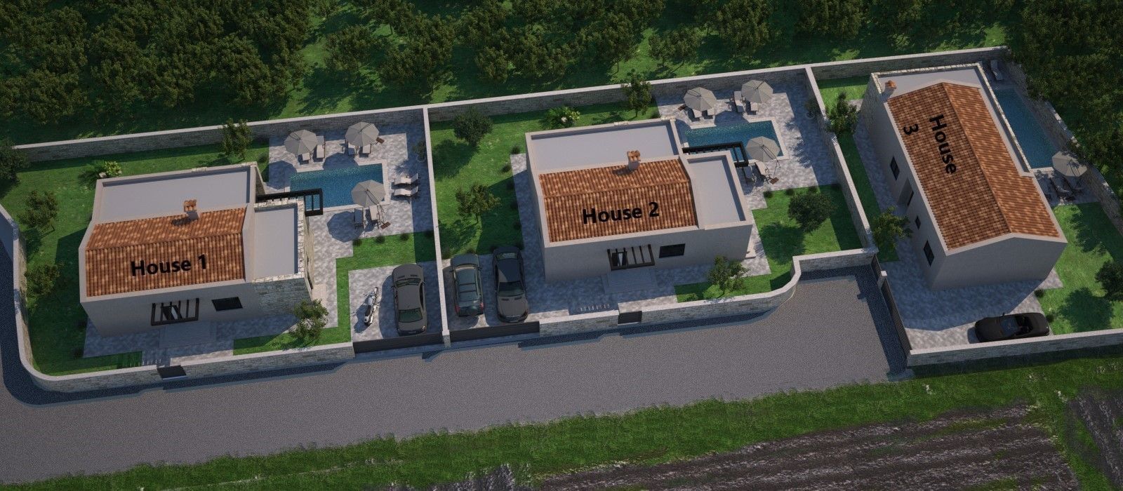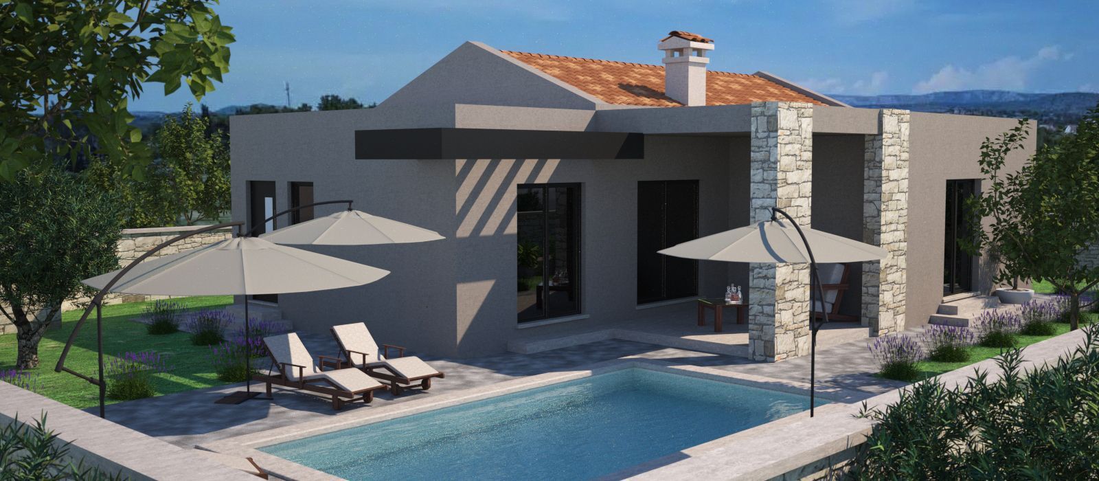 ISTRIE, SVETVINČENAT - Moderní jednopatrový dům s bazénem Renesanční město Svetvinčenat je jedním z klenotů Istrie s bohatou turistickou nabídkou a řadou akcí pořádaných v atraktivních prostorách tohoto města. Svetvinčentu zdobí renesanční náměstí se zámkem, který je symbolem samotného místa. Toto zvláštní město s bohatou tradicí se zajímavými a rozmanitými programy, z nichž nejvýznamnější jsou Středověký festival, Sýrový festival a Festival tance a neverbálního divadla, přitahuje každoročně četné návštěvníky. Tento moderní jednopatrový dům s bazénem je na prodej jen pár minut jízdy od Svetvinčentu. Jeho rozloha je 95,32 m2 a nachází se na pozemku o velikosti 515 m2. Dům se skládá ze vstupní chodby, kuchyně s jídelnou, obývacího pokoje se vstupem na terasu a zahradu s bazénem 28m2 a 2 ložnic, každá s vlastní koupelnou a WC. V domě bude instalována příprava na podlahové vytápění, v každé místnosti klimatizace. V celém domě bude instalována keramika a PVC truhlářství (z vnější strany antracit, zevnitř bílá). Okolí bude zdobit keře levandule a olivovníky. Plánovaný začátek stavby je 1.5.2024.