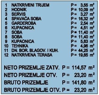ISTRIE, SVETVINČENAT - Moderní přízemní dům s bazénem v klidném prostředí Svetvinčenat je autentická istrijská vesnice známá svou bohatou historií, kulturou a klidným životním stylem, obklopená zelení a pouhých 20 minut od pobřeží a turistických center, jako jsou Rovinj, Fažana a Pula. V srdci idylické Istrie, v malebném městečku Svetvinčenat, se nachází tento moderní přízemní dům, který nabízí dokonalou kombinaci pohodlí, funkčnosti a klidného prostředí. Tento elegantní dům se nachází v nové osadě celkem 6 moderních přízemních domů, což zaručuje exkluzivitu, bezpečí a ticho. Dům s perfektním půdorysem má čistou plochu 114,57 m² uzavřeného prostoru a disponuje: - 3 prostornými a světlými ložnicemi - 2 moderními koupelnami - Otevřeným prostorem obývacího pokoje, jídelny a kuchyně - vzdušným a světlým prostorem ideálním pro rodinu a společenské akce - Letní kuchyní - ideální pro vychutnávání istrijských lahůdek pod širým nebem - Krytou terasou o rozloze 19,65 m² - vytvořenou pro relaxaci během horkých letních dnů - Soukromým bazénem o rozloze 23,46 m² - s prostornou opalovací plochou a naprostým soukromím - Technickou místností, šatnou a servisní místností Celková hrubá plocha přízemí je 141,80 m² a to vše se rozkládá na prostorné zahradě o rozloze 633 m², obehnané zdí a zdobené zelení. Technické vlastnosti: - Podlahové vytápění - zajišťuje teplo a pohodlí po celý rok - Klimatizace - pro optimální teplotu v každém koutě domu - Kvalitní konstrukce, špičková izolace a pečlivě vybrané materiály - Soukromé parkování pro vaše vozidla Dům je momentálně ve výstavbě, což kupujícímu umožňuje vybrat si detaily dokončení dle svého přání Tato moderní vila s charakterem je ideální jak pro rodinný život, tak pro investici do turistického pronájmu. Kombinace moderní architektury, klidné lokality a praktického uspořádání místností činí tuto nemovitost mimořádně atraktivní. Nenechte si ujít příležitost stát se majitelem tohoto jedinečného přízemního domu v klidné a zelené části Istrie!