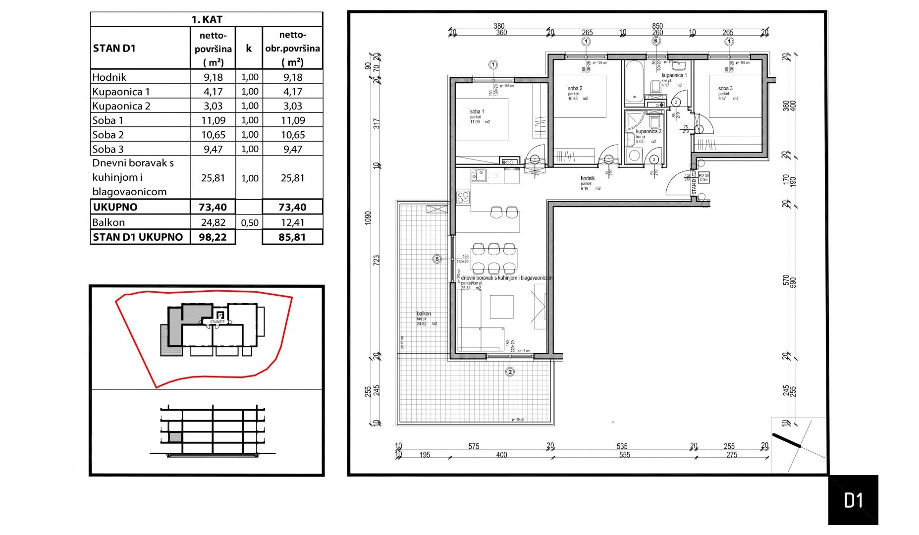 ISTRIE, TAR – Exkluzivní byt 3+kk v 1. patře kvalitní novostavby pouhých 350 m od moře V klidné vesničce Tara, pouhých 350 m od moře a deset minut chůze od udržovaných pláží, se nachází moderní, vysoce kvalitní novostavba s celkem 13 byty. Tento unikátní byt se nachází v úplně prvním patře budovy, která se rozkládá na 85,81 m² obytné plochy a představuje kombinaci luxusu, pohodlí a nádherného výhledu. POPIS BYTU Byt D1 se rozkládá na čisté ploše 85,81 m². Dispozice místností je navržena s ohledem na maximalizaci prostornosti a přirozeného světla: * Vstupní hala s vyhrazenou částí pro šatní skříň * Otevřený prostor obývacího pokoje – moderně navržený prostor, který spojuje obývací pokoj, kuchyň a jídelnu v jeden celek. * Prostorná terasa – která se rozkládá vedle kuchyně a jídelny, ideální pro setkávání a relaxaci s přáteli a rodinou. * Dále jsou zde tři pohodlné ložnice a dvě koupelny. TECHNICKÉ CHARAKTERISTIKA BUDOVY - Budova byla navržena a postavena dle nejvyšších stavebních a energetických standardů: * Antiseismická konstrukce * Třívrstvé PVC truhlářství * Tiché kanalizační instalace * Elektrické podlahové vytápění ve všech místnostech bytu * Klimatizace v každé místnosti * Vysoce kvalitní 10cm fasádní izolace (styropor a vlna) * Výtah v budově * Bezpečnostní dveře v bytech * Špičkový vodovod (německé TC trubky) NAVÍC * K bytu náleží dvě soukromá parkovací místa, která jsou zahrnuta v ceně bytu. * Úložné prostory jsou k dispozici za příplatek * Plánované dokončení výstavby a nastěhování: 12/2025. PROČ SI VYBRAT TENTO BYT? Tento byt je ideální volbou pro rodinný život, klidnou dovolenou na Istrii, ale také jako bezpečná investice vzhledem k atraktivní lokalitě a kvalitní výstavbě. Pro jakékoli další informace nebo pro domluvení prohlídky nás neváhejte s důvěrou kontaktovat.