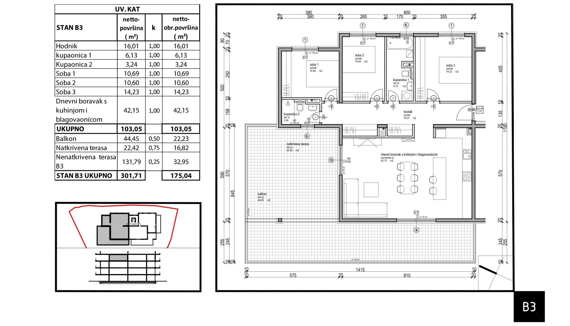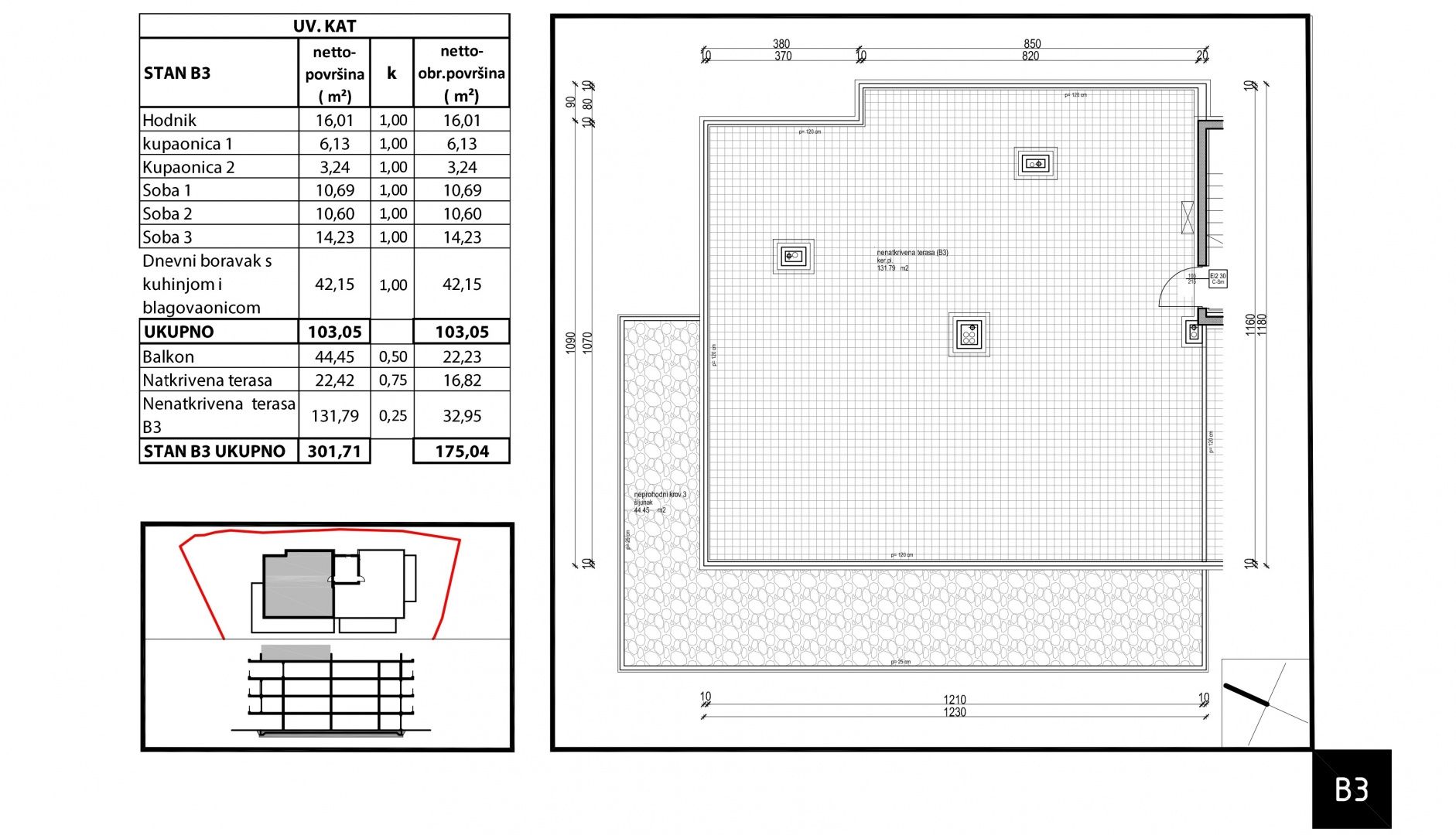 ISTRIE, TAR – Exkluzivní dvoupatrový byt 3+kk se střešní terasou a panoramatickým výhledem na moře V klidné osadě Tara, pouhých 350 m od moře a deset minut chůze od udržovaných pláží, se nachází moderní novostavba špičkové kvality s celkem 13 byty. V úplně třetím patře budovy se nachází tento unikátní dvoupatrový penthouse, který se rozkládá na 175,04 m² obytné plochy a představuje kombinaci luxusu, pohodlí a nádherného výhledu. POPIS BYTU - B3 První patro: * prostorná vstupní hala s vyhrazenou šatnou * velký otevřený prostor o rozloze až 42,15 m² s obývacím pokojem, kuchyní a jídelnou, odkud je také přístup na prostornou, částečně krytou terasu, která se táhne po celé šířce bytu. * tři prostorné ložnice. * dále dvě moderní a pohodlné koupelny. Druhé patro: Vnitřní schodiště vede na střešní terasu o rozloze 131,79 m², která nabízí panoramatický a ničím nerušený výhled na moře a istrijskou krajinu. Tento prostor nabízí neomezené možnosti přizpůsobení - budoucí majitelé si mohou vytvořit vlastní oázu s vířivkou, letním barem, odpočinkovou zónou nebo prostorem pro setkávání a zábavu s rodinou a přáteli. DALŠÍ INFORMACE - Budova je postavena podle nejvyšších stavebních standardů a byt je vybaven: * konstrukcí odolnou vůči zemětřesení * třívrstvými PVC truhlářskými výrobky s roletami a moskytiérami * elektrickým podlahovým vytápěním ve všech místnostech * klimatizací v každé místnosti * 10 cm vysoce kvalitní fasádní izolace (styropor a vlna) * bezpečnostními dveřmi * výtahem spojujícím všechna patra budovy * byt má vlastní dvě parkovací místa zahrnutá v ceně bytu, přičemž úložné prostory jsou k dispozici za příplatek. DALŠÍ: * Plánované dokončení výstavby a nastěhování: 12/2025. let * Vlastnictví v pořádku, fyzická osoba (1/1) Ideální příležitost pro luxusní rodinný dům, rekreační byt nebo investici s vysokou návratností prostřednictvím turistického pronájmu. Tento byt není jen nemovitostí - je to skutečná volba životního stylu pro ty, kteří si chtějí užít luxus, pohodlí a nádherný výhled na moře.