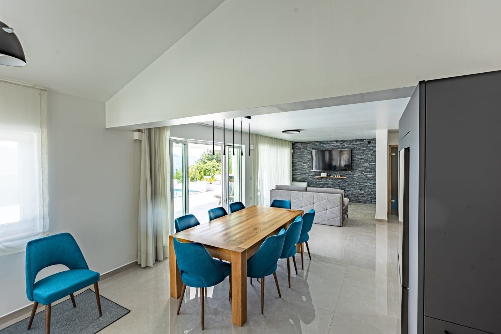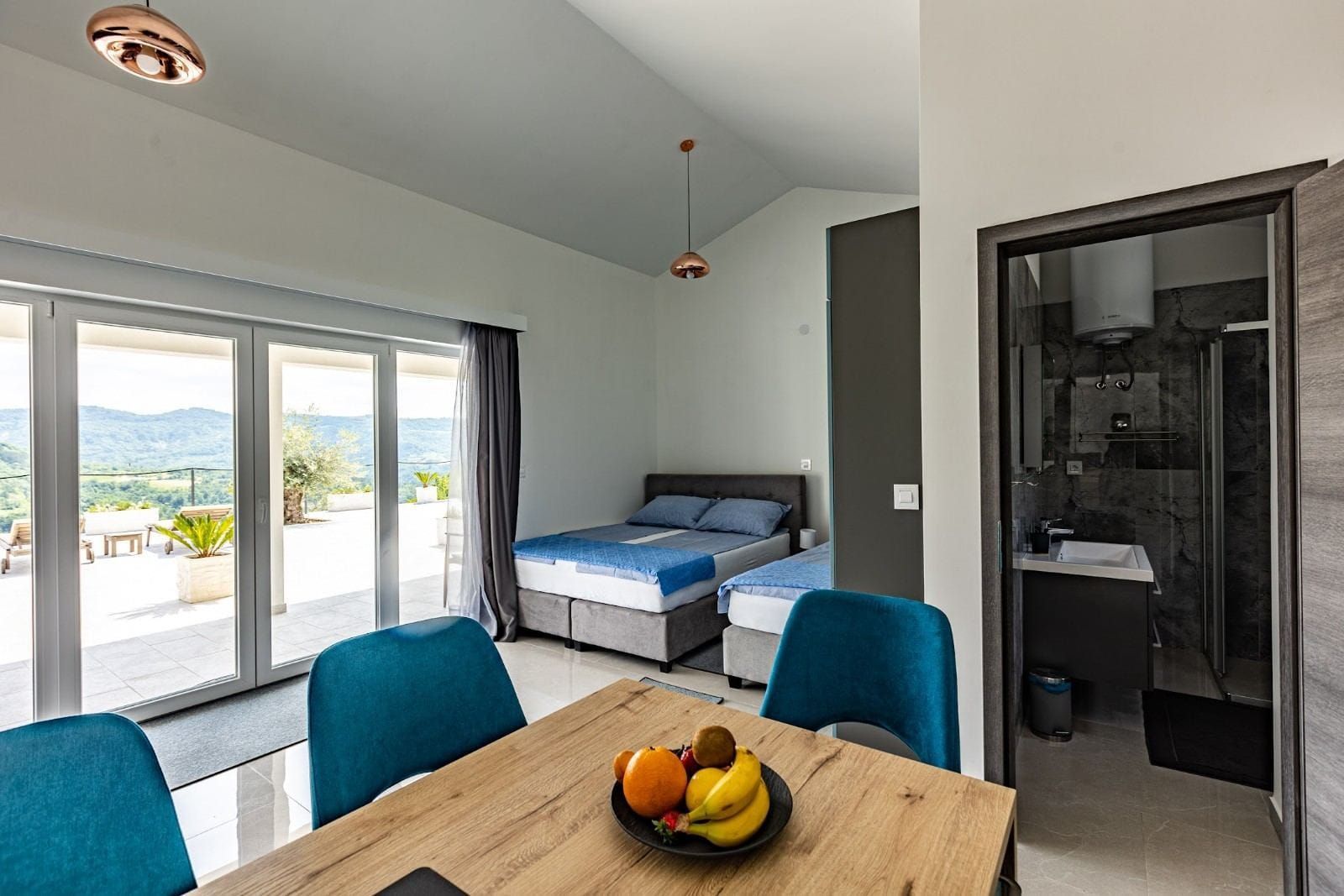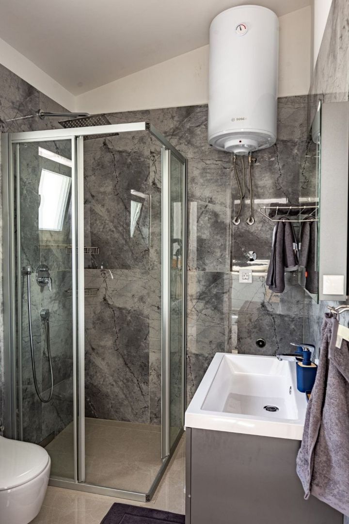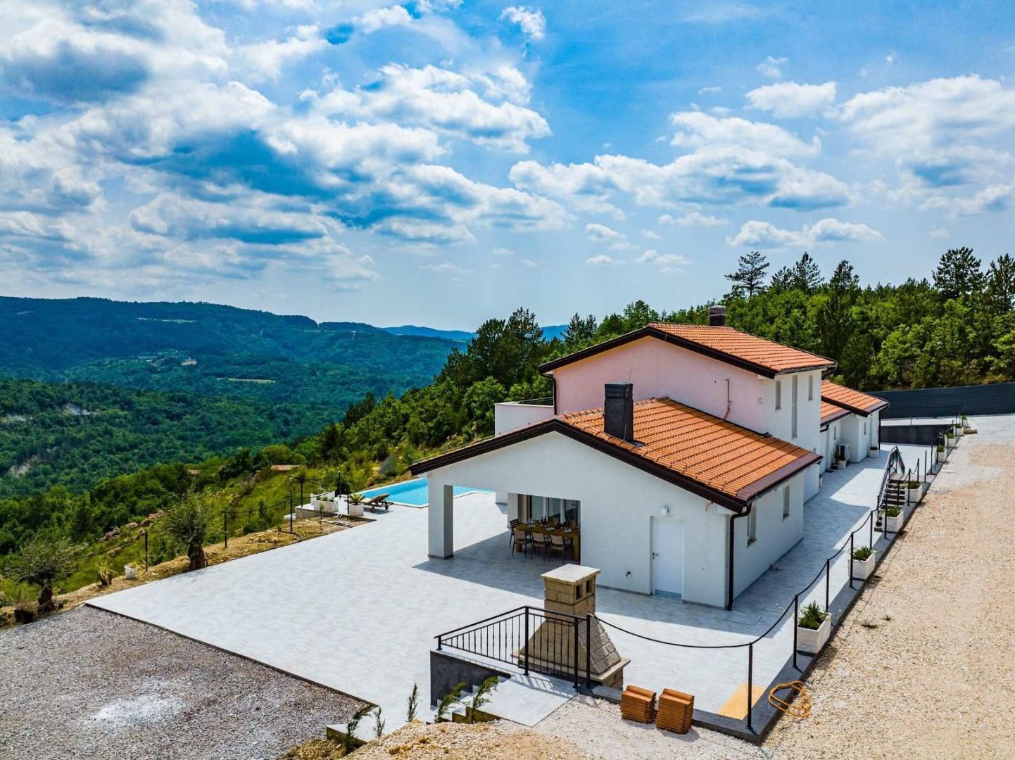 ISTRIE, UNIKÁTNÍ HACIENDA NA TRHU! V místě naprostého ticha a čisté přírody jsou na prodej nemovitosti typu hacienda. Jedná se o samostatně stojící vilu, která se koncepčně skládá z několika bytových jednotek. Celková obytná plocha objektu je 386,56 m2. Vila se skládá ze dvou podlaží: přízemí a první patro 299,56 m2 + vedlejší budova 87 m2. Při stavbě této unikátní stavby bylo dbáno na technické detaily a dlouhodobou kvalitu. Přízemí vily tvoří obývací pokoj a open space kuchyně, 2x WC, komora a menší místnost, která může být v budoucnu solnou místností nebo saunou, dle preferencí budoucího majitele. Z obývacího pokoje vycházíme na krytou terasu, která nabízí vzácný výhled do přírody. Schody vedou do prvního patra, kde jsou dvě hlavní ložnice, každá s vlastní koupelnou. Vedle vily v přízemí jsou tři byty v řadě (dva 33 m2 a 18 m2). Byty jsou navrženy podle systému SMART, to znamená, že každý kout prostoru byl maximálně využit pro funkční a pohodlný pobyt. Za vilou se nachází pomocná budova o velikosti 87 m2, která je rozdělena na dvě zóny, kde jedna zóna má sloužit jako byt a druhá jako rekreační zóna. Tato hacienda se nachází na velkém pozemku o rozloze 20 010 m2 a je ze všech stran obklopena přírodou a nabízí vzácný a jedinečný výhled. Na zahradě se nachází mimořádně kvalitní bazén se speciálními dlaždicemi (APPIANI TILES), které zajistily, že barva bazénu vypadá božsky. V rámci prostoru kolem bazénu bylo myšleno na každý detail, takže je zde prostor na opalování, gril a venkovní jídelní kout. Vila je vybavena kvalitním zakázkovým nábytkem a tak se i prodává. Nechybí ani video dohled s možností ovládání přes chytrý telefon připojený k zabezpečovacímu systému a automatické otevírání vjezdové brány. Důraz je kladen na pečlivý výběr materiálů a technik při výstavbě, jehož výsledkem je mimořádně kvalitní a na trhu jedinečná nemovitost! Vila je orientována na jižní stranu a je zalita sluncem v létě i v zimě a pomocí speciální techniky při výstavbě bylo zajištěno, že vila má vždy slunce, ale ne příliš horko během pobytu ve vile.