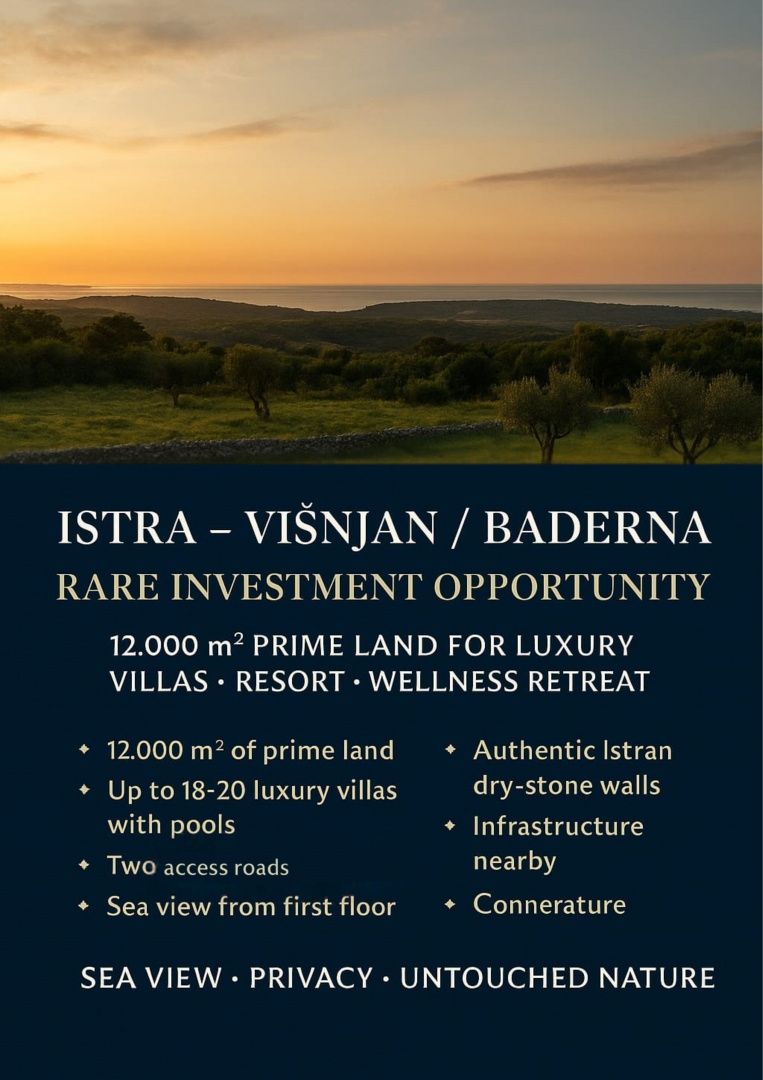 ISTRIE, VIŠNJAN - SKVĚLÁ INVESTIČNÍ PŘÍLEŽITOST!!! Představujeme vám výjimečný stavební pozemek o rozloze 12 000 m², který se nachází v jedné z nejžádanějších částí střední Istrie – oblasti mezi Višnjanem a Badernou, známé svými krásnými panoramaty, nedotčenou přírodou a rostoucí poptávkou po luxusních vilách a turistických resortech. Tento prostorný, rovinatý pozemek představuje jednu z nejatraktivnějších lokalit pro rozvoj prestižního turistického projektu: luxusní vily s bazény, butikový resort, glamping nebo karavany, sportovně-rekreační komplex nebo dokonce malé golfové hřiště. Výhled na moře z prvního patra dále zdůrazňuje exkluzivitu této nabídky. HLAVNÍ VLASTNOSTI 12 000 m² stavebního pozemku Možnost parcelace pro 18–20 vil s bazénem Rovný terén – jednoduchá a cenově výhodná výstavba Otevřený výhled na moře z prvního patra budoucích budov Dvě přístupové cesty po obou stranách pozemku (bez ztráty rozlohy) Infrastruktura v bezprostřední blízkosti Klidná a přírodní lokalita bez turistického hluku Velká část pozemku je ohraničena autentickými istrijskými suchými kamennými zdmi Vlastnictví 1/1, bez věcných břemen a záznamů Povolení k vyřízení lokality v přípravě – urychluje zahájení investice Ideální pro vytvoření exkluzivního turistického konceptu VÝHODY LOKALITY Tato mikrolokace je jedním ze skrytých klenotů Istrie – oblasti, která stále více přitahuje kupující a investory díky: *Autentické atmosféře a středomořské kráse Kopce, vinice, olivové háje, borové lesy a panoramatický horizont vytvářejí ideální prostředí pro luxusní turistické projekty. *Slavné istrijské atrakce v bezprostřední blízkosti Višnjan – světoznámá observatoř, vinné stezky, olivové háje Limský kanál – 10 km Poreč – 14 km Motovun, Grožnjan, Tar – kousek autem Čisté pláže západního pobřeží Istrie Špičkové taverny, olejárny a vinařství s vynikající pověstí *Vynikající dopravní spojení Pouze 5 km od sjezdu z Istrijského Y – Baderna Rychlý přístup do celé Istrie, Slovinska a Rijeky Poloha vhodná pro hosty, kteří hledají soukromí, ale také blízkost moře *Středomořské klima Mírné zimy a teplá léta činí z lokality ideální místo pro celoroční provoz vil a turistických zařízení. INVESTIČNÍ PŘÍLEŽITOSTI Rozlehlá plocha, rovinatý terén a dvě příjezdové cesty otevírají širokou škálu možností: Luxusní vily s bazény (18–20 nemovitostí) Butikový resort nebo wellness centrum Prémiový glamping / karavany Sportovní komplex, rekreační oblast nebo menší golfová hřiště Luxusní projekt pro vyšší segment trhu Tento pozemek umožňuje investorovi vytvořit komplex, který kombinuje soukromí, přírodu, klid a výhled na moře – jedna z nejvyhledávanějších kombinací na dnešním trhu. ZÁVĚR – VZÁCNĚ DOSTUPNÁ PŘÍLEŽITOST Jedná se o výjimečnou a vzácnou nabídku v oblasti Višnjanu a střední Istrie. Velká rozloha, konfigurace terénu, výhled na moře, blízkost infrastruktury a silný rozvoj luxusního cestovního ruchu činí z této lokality ideální investici pro ty, kteří chtějí: jistý výnos dlouhodobou hodnotu rozvoj prestižního projektu s vysokým tržním potenciálem