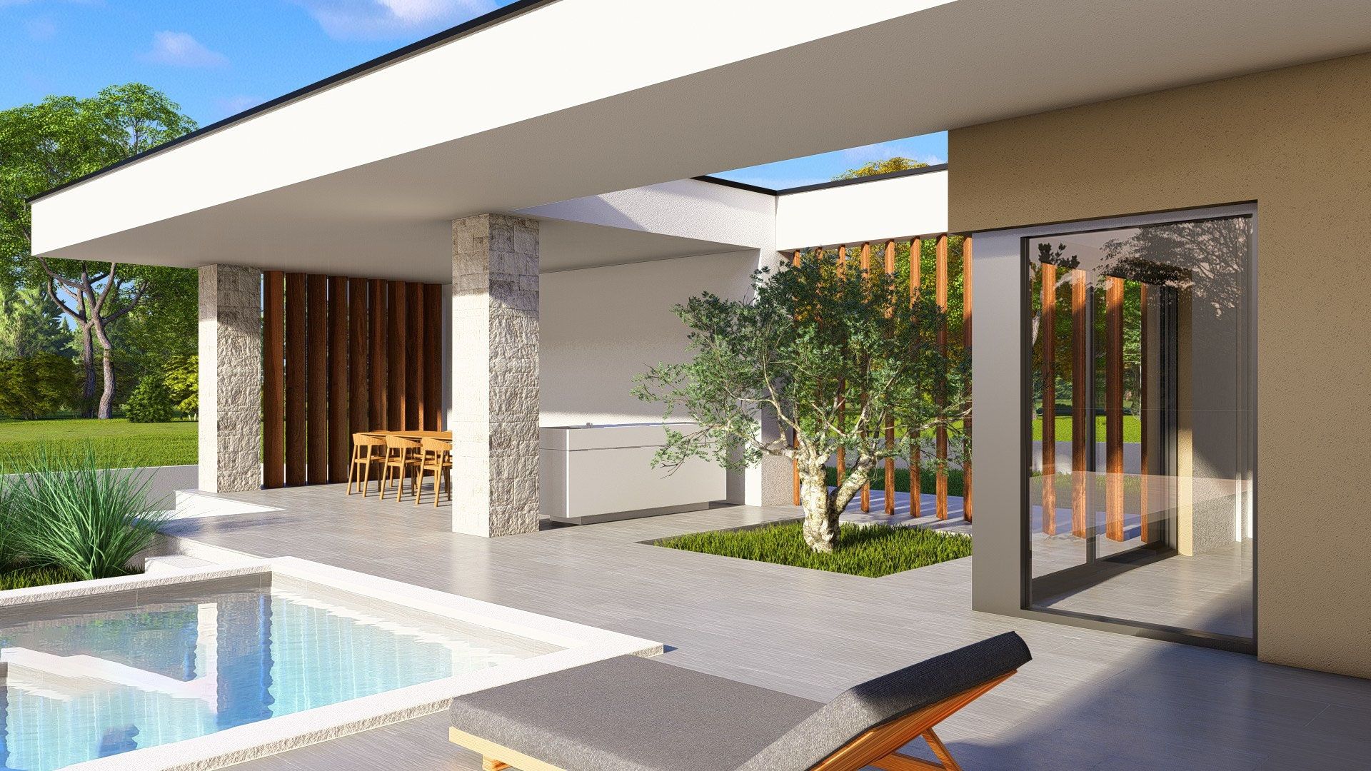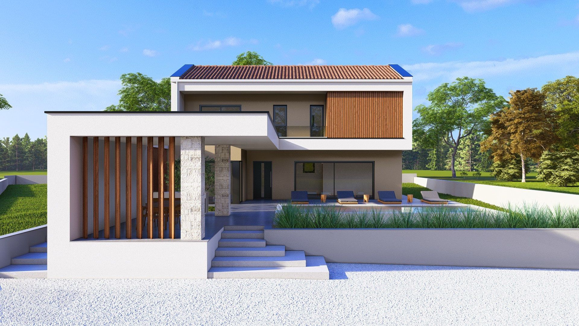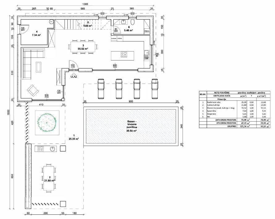 ISTRIE, ŽMINJ – Moderní luxusní vila s bazénem, solární elektrárnou a špičkovým vybavením Žminj je okouzlující istrijské městečko ležící v samém srdci poloostrova, známé svou autentickou atmosférou, tradiční architekturou a vynikajícím dopravním spojením do Puly, Rovinje a Pazinu. Díky své centrální poloze a rostoucí poptávce po kvalitních nemovitostech ve vnitrozemí Istrie je ideální volbou pro klidný rodinný život nebo investici do cestovního ruchu. Nedaleko centra Žminje, v klidném a soukromém prostředí, se na pozemku o rozloze 932 m² prodává moderní vila špičkové konstrukce s celkovou čistou plochou 161,5 m² a bazénem o rozloze 30,6 m². INTERIÉR – FUNKČNOST A ELEGANCE Vila byla pečlivě navržena tak, aby poskytovala maximální pohodlí a prostornost. Interiér o rozloze 161,5 m² zahrnuje: • prostorný obývací pokoj • kuchyň s jídelnou • 3 ložnice • 2 koupelny • 1 toaletu pro hosty • technickou/strojovnu Prostor je klimatizován (split systémy LG v každé ložnici a obývacím pokoji) a v celém domě je zavedeno podlahové vytápění. Teplá voda je připravována v 200litrovém bojleru, napojeném na tepelné čerpadlo LG. Koupelny jsou vybaveny špičkovým vybavením: • černé baterie HansGrohe a skryté sprchy • sprchové kouty s bezpečnostním sklem • toaletní mísy Villeroy & Boch s tichým dovíráním sedátek Podlahy a obklady stěn jsou z keramiky 1. třídy (Keraterm/Feroterm 60x60 nebo 60x120 cm). Stěny jsou strojně omítnuté, dvakrát hlazené a natřené na bílo. Truhlářské práce jsou Rehau ALU/PVC s třívrstvým nízkoemisním sklem (6-16-6, plyn, Ug=0,8 W/m²K), panoramatické ALU stěny, bezpečnostní sklo, elektrické hliníkové rolety ovládané chytrým telefonem. Vstupní dveře jsou hliníkové s 3bodovým bezpečnostním zámkem, přídavným bezpečnostním zámkem, moderní interiérové dveře s černým magnetickým zámkem a skrytými panty. TECHNICKÉ CHARAKTERISTIKA A KONSTRUKCE Konstrukce: • železobetonové základní pásy a desky • nosné stěny z cihel Wienerberger 25 cm • příčky 10 cm (Wienerberger) • železobetonové sloupy a nosníky Izolace a fasáda: • hydroizolace s dehtovými fóliemi • EPS 10 cm + fasádní systém Baumit • ozdobný kámen 2 cm • střecha: 15 cm XPS izolace + hydroizolace Plech: hliníkový a pozinkovaný lakovaný plech. Odvodnění: biologicky rozložitelná jímka. Na střeše je instalována solární elektrárna o výkonu 10 kW s panely typu N. Zabezpečení: • video dohled (monitorování přes mobilní telefon) • zámek proti krádeži • připojení k internetu přes mobilní síť Další: • nabíječka elektromobilů Schneider Electric 11 kW (typ 2, kabel 5 m) ZAHRADA – 932 m² SOUKROMÍ A POHODLÍ Pozemek o rozloze 932 m² je kompletně obehnán zdí a zeleným plotem, s vavřínem, třešní a tújí pro maximální soukromí. Upravená zahrada nabízí: • Bazén o rozloze 30,6 m² (hloubka 1,3 m) skimmerový systém elektrolýza (Salt & Swim 2.0) automatická filtrace tepelné čerpadlo pro ohřev a chlazení vody LED osvětlení mikrocementový modrý obklad Duraston • příprava pro venkovní sprchu • osázený trávník • 3 olivovníky s nočním osvětlením • kapkový závlahový systém s programátorem • elektrická hliníková vstupní brána s dálkovým ovládáním • venkovní parkovací místo • nástěnná nabíječka pro elektromobily Venkovní terasy jsou pokryty keramikou 1. třídy 60x60 cm. Plánované dokončení je 10/2026 Tato vila představuje perfektní kombinaci moderních technologií, energetické účinnosti (solární elektrárna 10 kW), luxusního vybavení a soukromí na výborném místě v srdci Istrie. Je ideální jako rodinný dům, luxusní rekreační rezidence nebo investice do luxusního turistického pronájmu. Koupí této nemovitosti získáte dlouhodobou hodnotu, bezpečnou výstavbu od osvědčeného dodavatele a dům, který je připraven splňovat nejvyšší standardy moderního života.