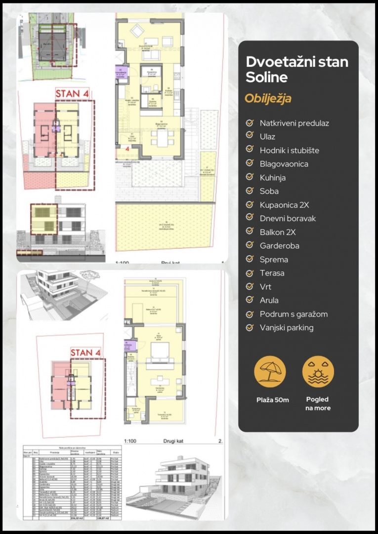 KORČULA, LUMBARDA - mezonetový apartmán, 138,87 m²! V jedné z nejžádanějších lokalit na ostrově, v okouzlující a středomořské Lumbardě, pouhých 50 metrů od křišťálově čistého moře a ve druhé řadě od pobřeží, se nachází tento elegantní mezonetový apartmán o rozloze 138,87 m² - nemovitost, která kombinuje soukromí, pohodlí a autentickou dalmatskou atmosféru. Apartmán se nachází v komorním rezidenčním domě s pouhými šesti apartmány, což zajišťuje klid, diskrétnost a příjemnou atmosféru po celý rok. Spodní patro je navrženo jako prostorný open-space koncept, který kombinuje obývací pokoj, kuchyň a jídelnu spolu s prostornou koupelnou. Velké prosklené plochy naplňují prostor přirozeným světlem a otevírají jej na terasu s podmanivým výhledem. Horní patro nabízí komornější část domu - dvě pohodlné ložnice, šatnu a elegantní koupelnu. Dva balkony dále zdůrazňují pocit vzdušnosti a spojení s přírodou. Nemovitost je vybavena centrálním solárním podlahovým vytápěním, nejmodernějším systémem, který zajišťuje rovnoměrné a příjemné teplo ve všech místnostech. Díky využití solární energie se výrazně snížily náklady na vytápění a zároveň se zvýšila energetická účinnost. Terasa, dva balkony a přilehlá část zahrady vytvářejí perfektní kulisu pro dlouhé letní večery s vůní borovic a šuměním moře. Dalšími vymoženostmi nemovitosti je přilehlý suterén s garáží a venkovním parkovacím místem. Úchvatná lokalita Lumbarda je známá svými vinicemi, písečnými zátokami a souostrovím malých ostrovů, které jí dodávají zvláštní, téměř exkluzivní charakter. Do města Korčula vede malebná silnice přes olivové háje a borové lesy, která poskytuje dokonalou rovnováhu mezi soukromím a dostupností veškerého vybavení. Tato nemovitost je ideální volbou pro luxusní přímořskou rezidenci, exkluzivní letní oázu nebo investici s vysokou hodnotou v jedné z nejatraktivnějších lokalit na jižním Jadranu.