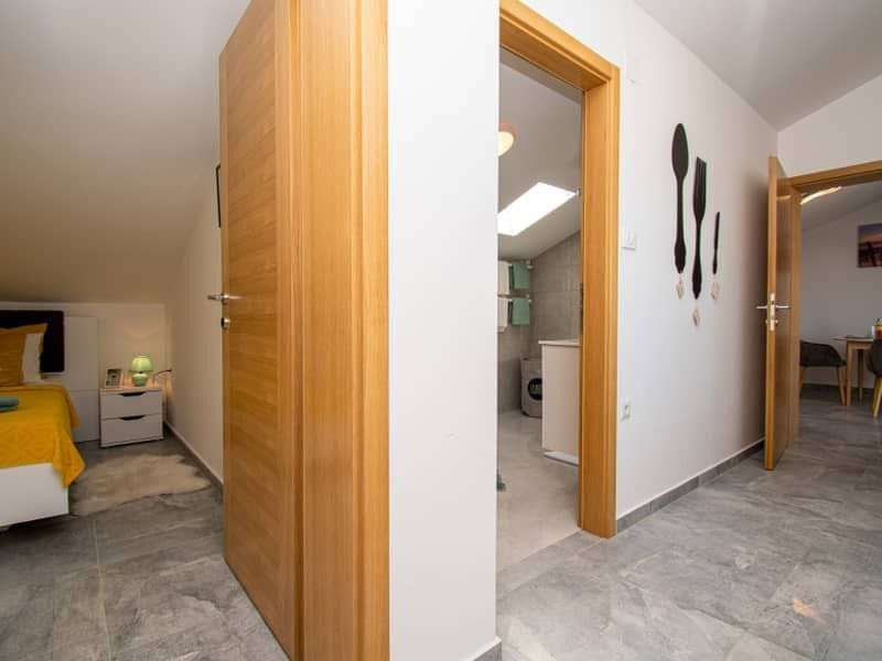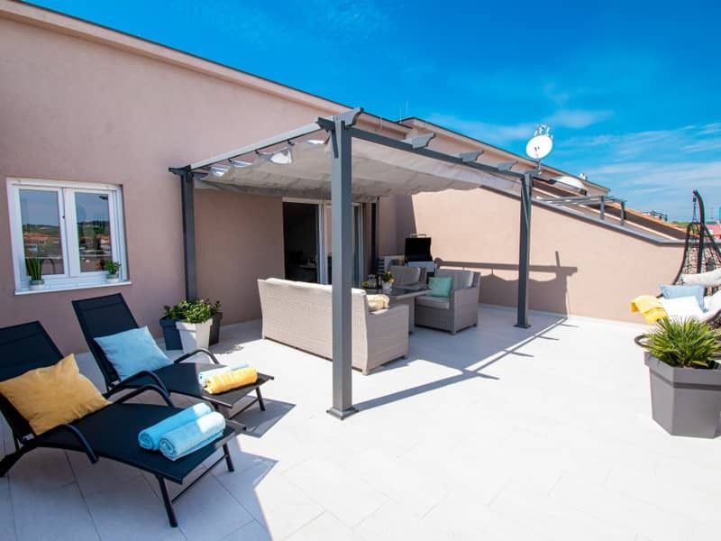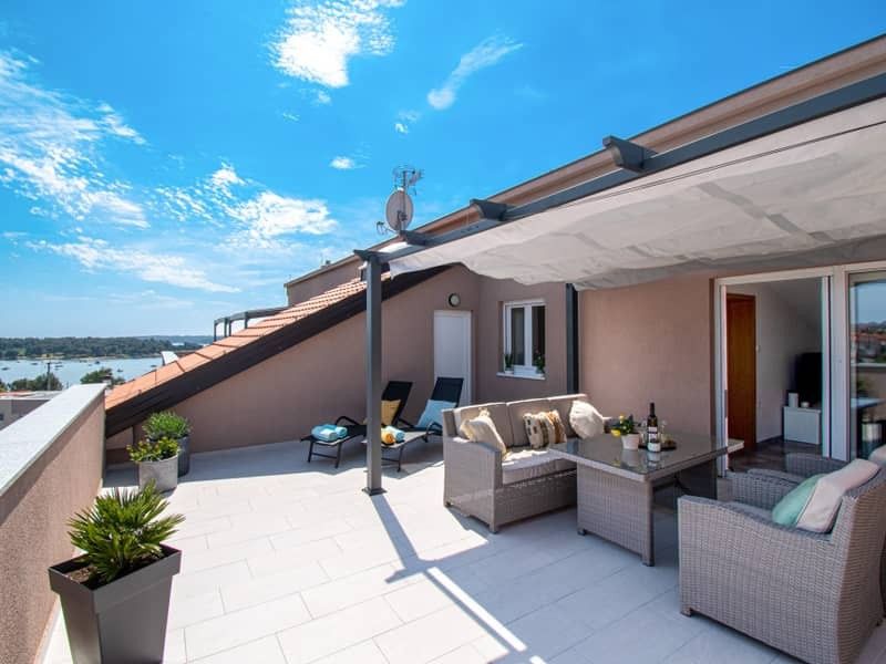 Medulin. Mukalba. Moderní apartmán s velkou terasou a výhledem na moře.