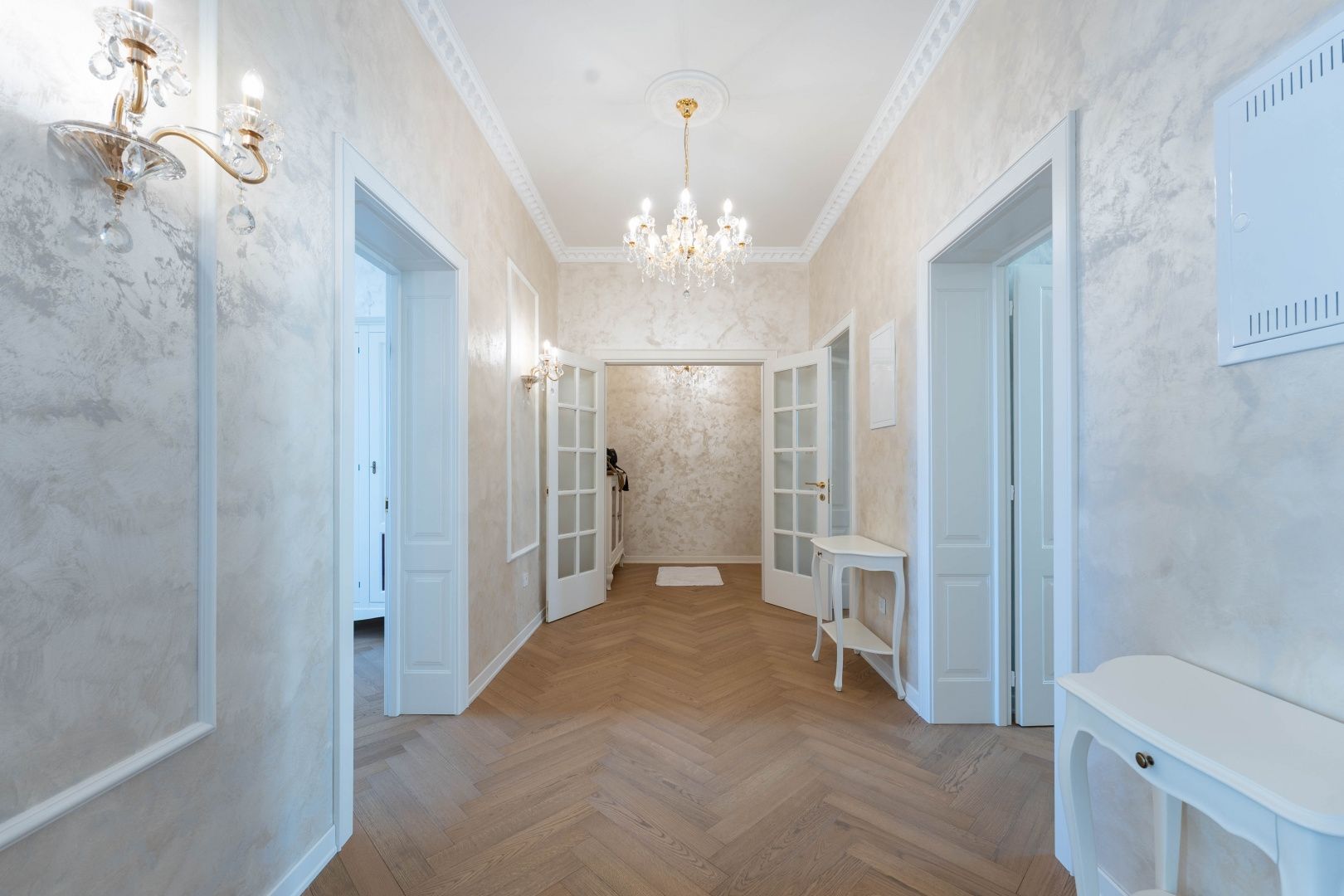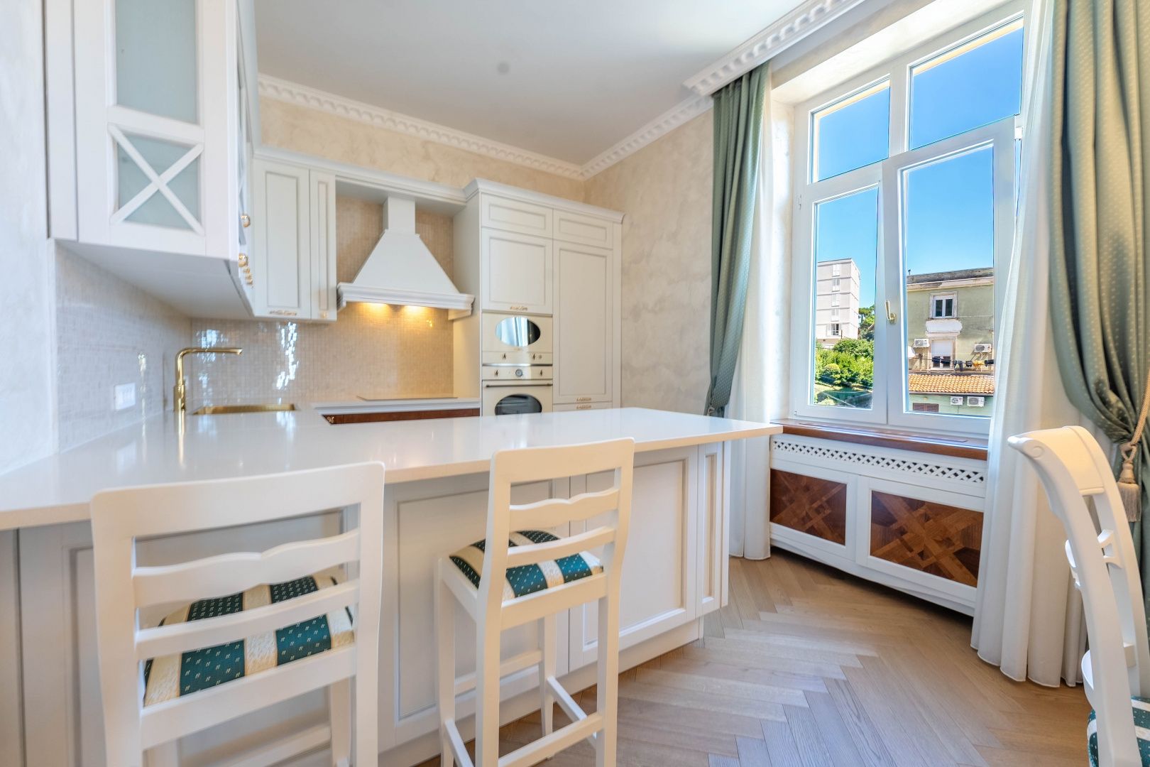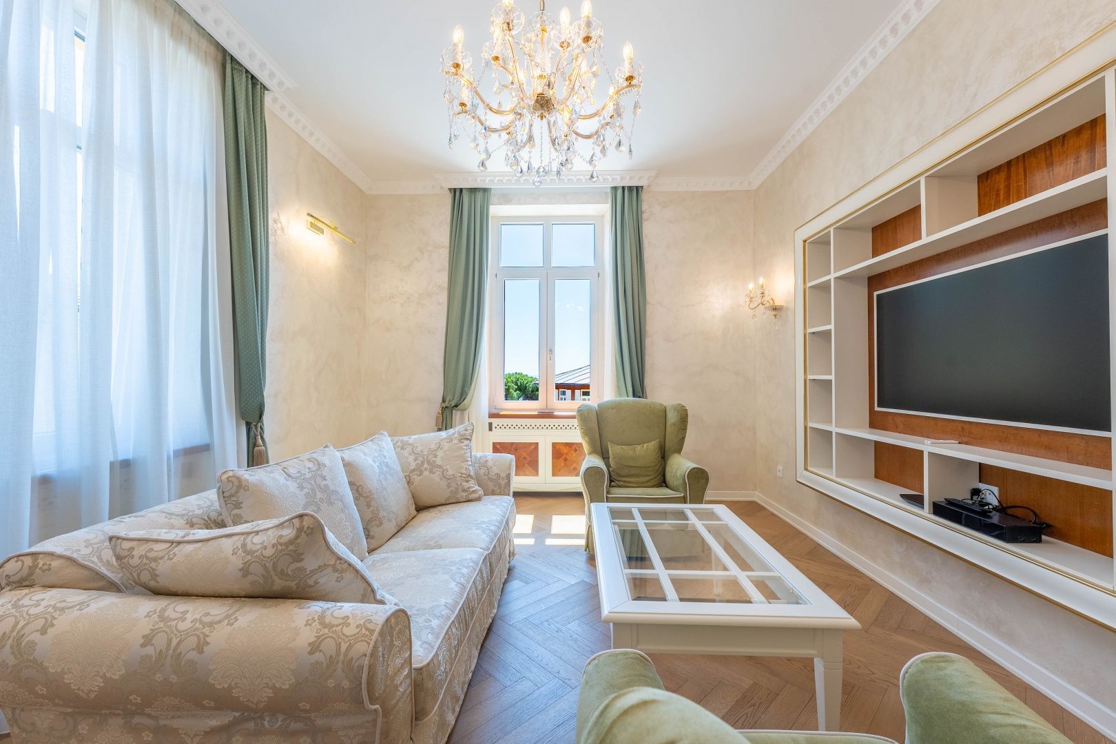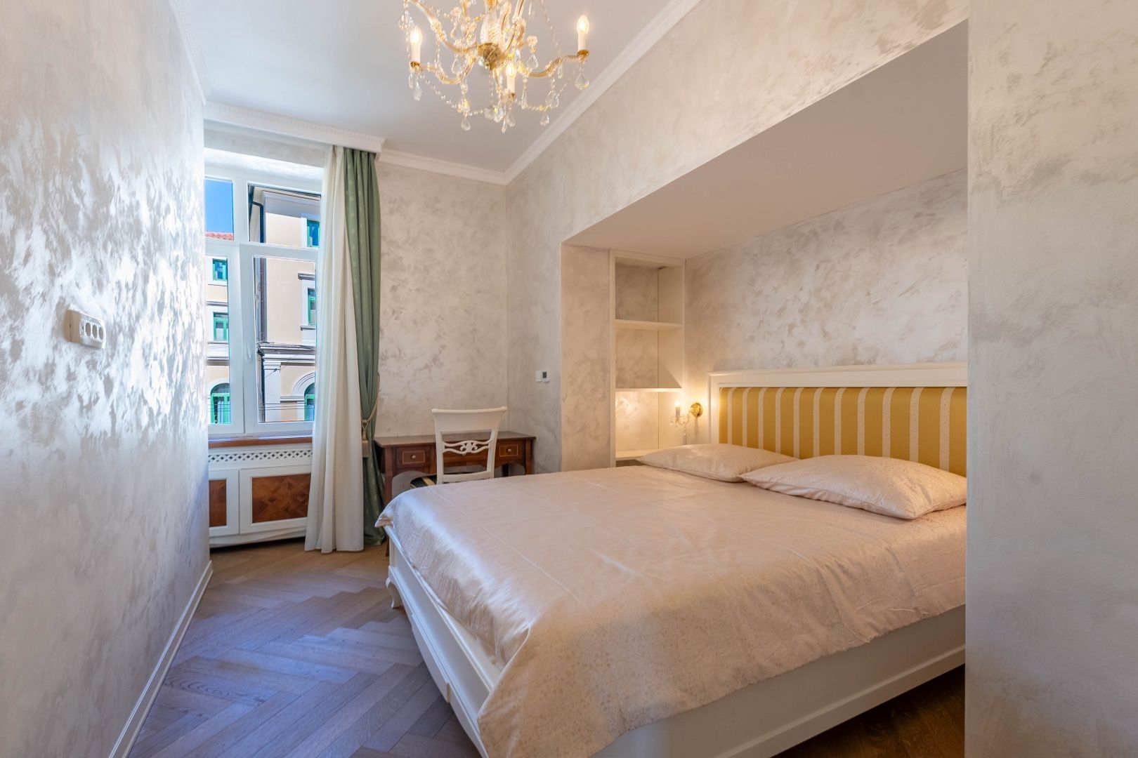 OPATIJA, CENTRUM - kombinace luxusu a autenticity, byt v zrekonstruované historické vile v centru Opatije s výhledem Představujeme vám jedinečnou příležitost bydlet v srdci Opatije - byt nacházející se ve 130 let staré historické vile, která vyzařuje kouzlo a autenticitu. Tento mimořádně dobře zrekonstruovaný byt se rozkládá na čisté ploše přibližně 96 m², s podílem na okolním pozemku a zahrnuje právo užívání parkovacího místa (v současné době není ve vlastnictví). Byt byl kompletně zrekonstruován se zvláštním důrazem na detail a špičkovou funkčnost. Každý pokoj je vybaven tepelným čerpadlem Mitsubishi, které umožňuje podlahové vytápění a chlazení pomocí podlahových klimatizací, což poskytuje vynikající komfort po celý rok. Nábytek je ručně vyrobený v renomované truhlářské dílně ve Veroně a křišťálové lustry dále zdůrazňují luxusní atmosféru prostoru. Každý detail byl pečlivě promyšlen a navržen tak, aby se z tohoto bytu stala dokonalá oáza elegance a pohodlí. Poloha apartmánu je ideální – nachází se v samém centru města, pouhých 130 metrů od moře. Do Voloska se dostanete pěšky po slavné promenádě Lungomare nebo autem za 3 minuty, zatímco Ičići je vzdálené pouhých 7 minut jízdy. Pro domluvení prohlídky nemovitosti volejte důvěryhodného makléře – konzultace v němčině je možná.