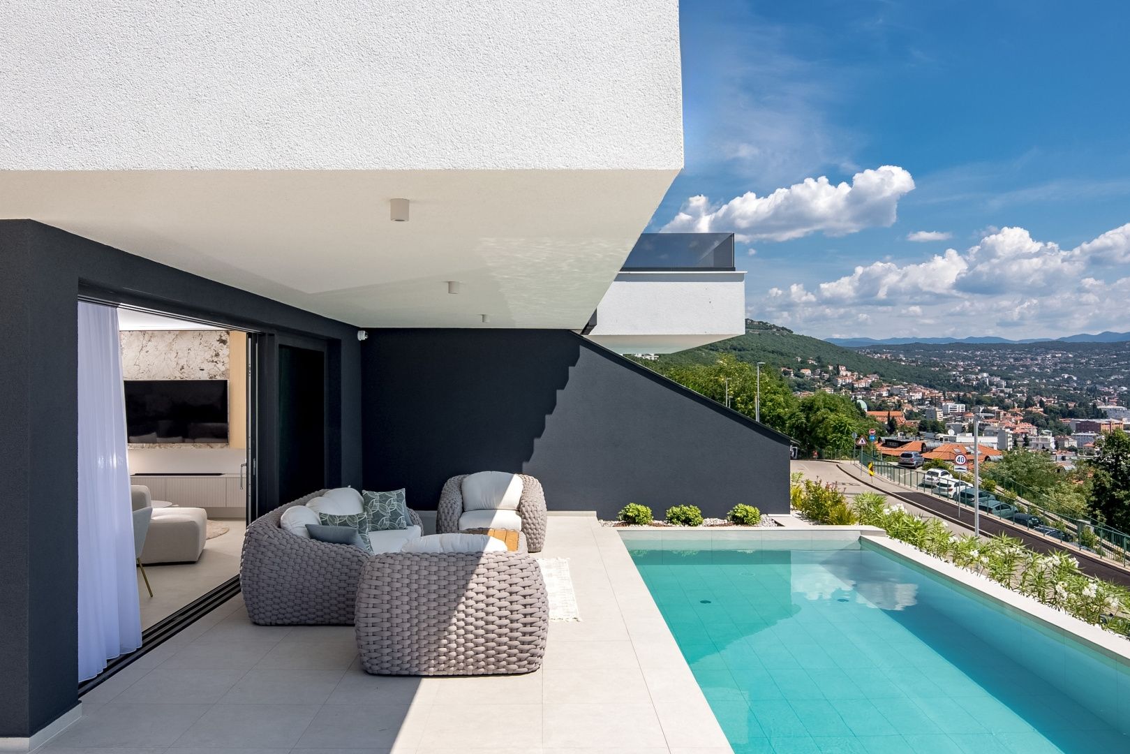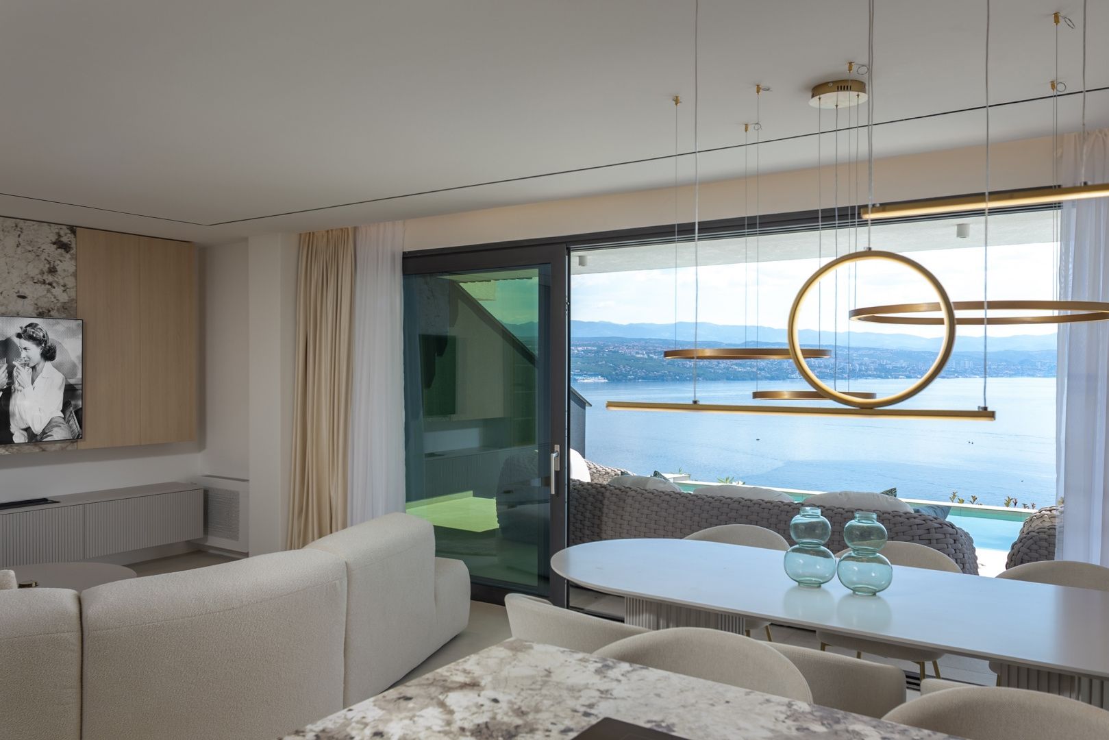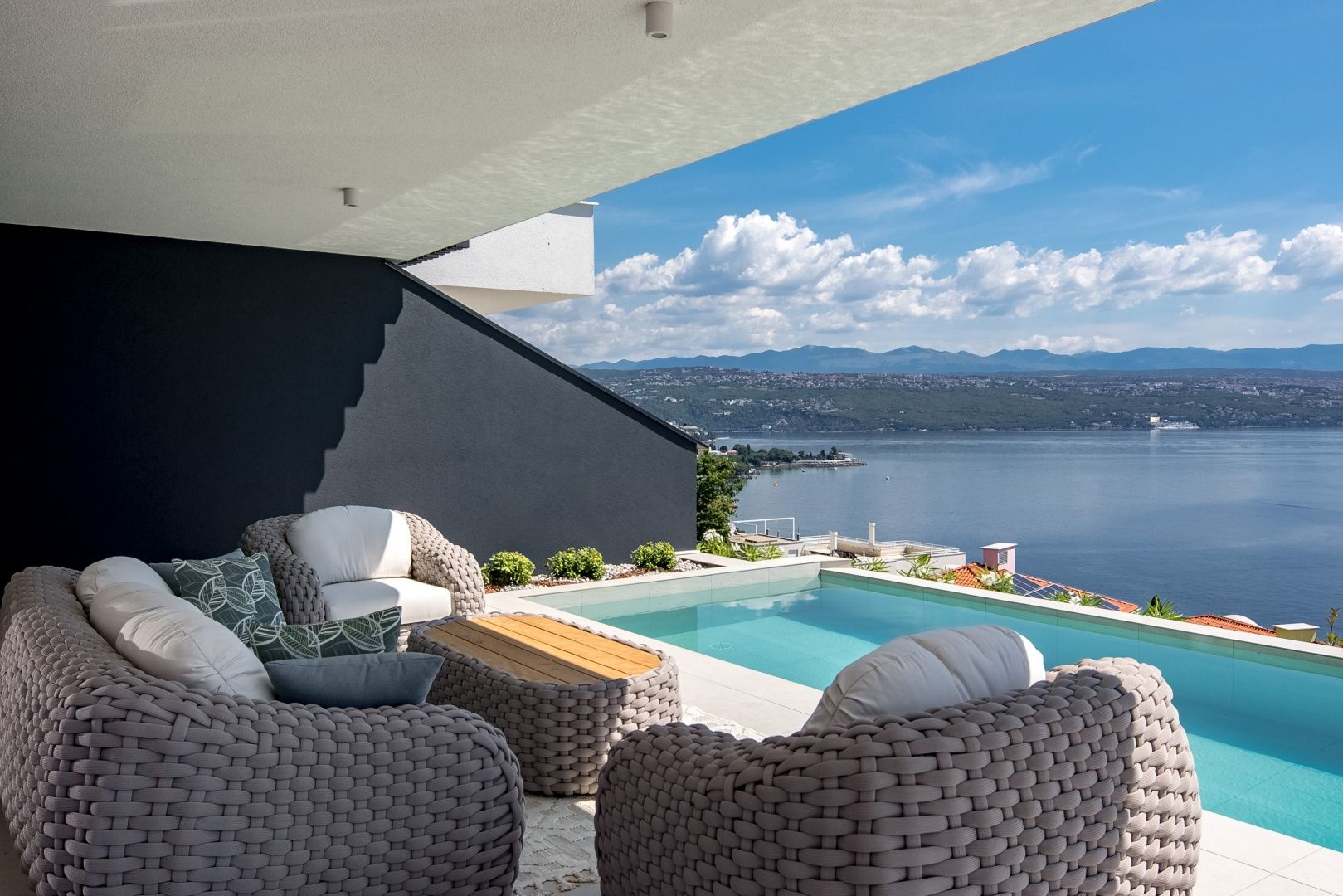OPATIJA, CENTRUM - luxusní rezidence k dlouhodobému pronájmu se soukromým bazénem a garáží Exkluzivní novostavba v bezprostřední blízkosti centra Opatije se nachází v kvalitní ulici pouhých 250 metrů od moře. Díky své poloze si tato ulice zachovává soukromí a klid s panoramatickým výhledem na moře. Jedná se o budovu zvláštní kvality, která se vyznačuje způsobem a typem výstavby na Riviéře. Materiály použité pro interiér budovy je důležité zdůraznit v popisu s dodatkem, že budova bude kompletním chytrým domovem. Apartmán A2 ve velkém přízemí se soukromým přelivovým bazénem o hrubé velikosti 272,37 m2. Čistá obytná plocha apartmánu je 164 m2 a dispozice je následující: Apartmán se skládá ze vstupní haly, koupelny a technické místnosti, velkého otevřeného obývacího pokoje s kuchyní a jídelnou (40 m2), 3 ložnic, z nichž jedna má koupelnu. Garáž v objektu zaručuje bezpečnost a soukromí se dvěma parkovacími místy a nabízí výhodu výtahu vedoucího přímo k ubytování. Jižní ložnice a velký obývací pokoj jsou dále propojeny s prostornou terasou, která zahrnuje soukromý bazén. Tato nemovitost má kromě dalších 40 m2 exotických rostlin také tyto unikátní vlastnosti: - luxusní designově zařízený byt - přímý výtah z garáže - video dohled a alarm - přepadový nekonečný bazén (s přípravou na vytápění, 2,65 m2) - tepelné čerpadlo DAIKIN - integrované, samostatné chlazení DAIKIN ve všech místnostech - podlahové vytápění v celé budově - špičková sanitární keramika ALICE - bezpečnostní dveře KOLNOA zajišťující vynikající tepelnou a zvukovou izolaci - všechny interiérové dveře renomované značky FILOMURO - vysoce kvalitní vícevrstvé dubové parkety v ložnicích (ve stylu Chevron) - vnitřní a venkovní keramické obklady rozpoznatelné značky FLORIM Tato budova se nachází v soukromé, kvalitní ulici, pouhých 250 m vzdušnou čarou od moře. K moři je to 5 minut chůze, zatímco cesta autem do centra Opatije trvá pouhé 2 minuty. Tato luxusní nemovitost na záviděníhodném místě se vyznačuje vysoce kvalitními materiály a exkluzivním doprovodným vybavením. Nabízí tak dokonalou kombinaci moderního stylu, elegance a funkčnosti moderních domácích technologií a je vnímána jako fantastická příležitost k investici do pohádkové Opatije.