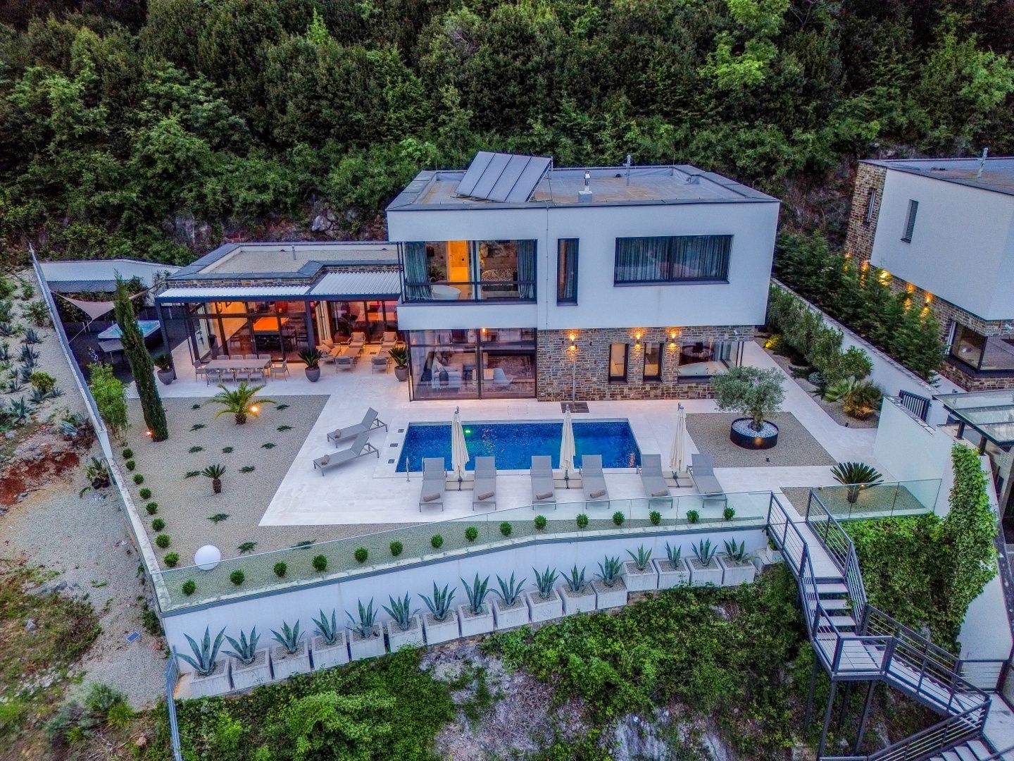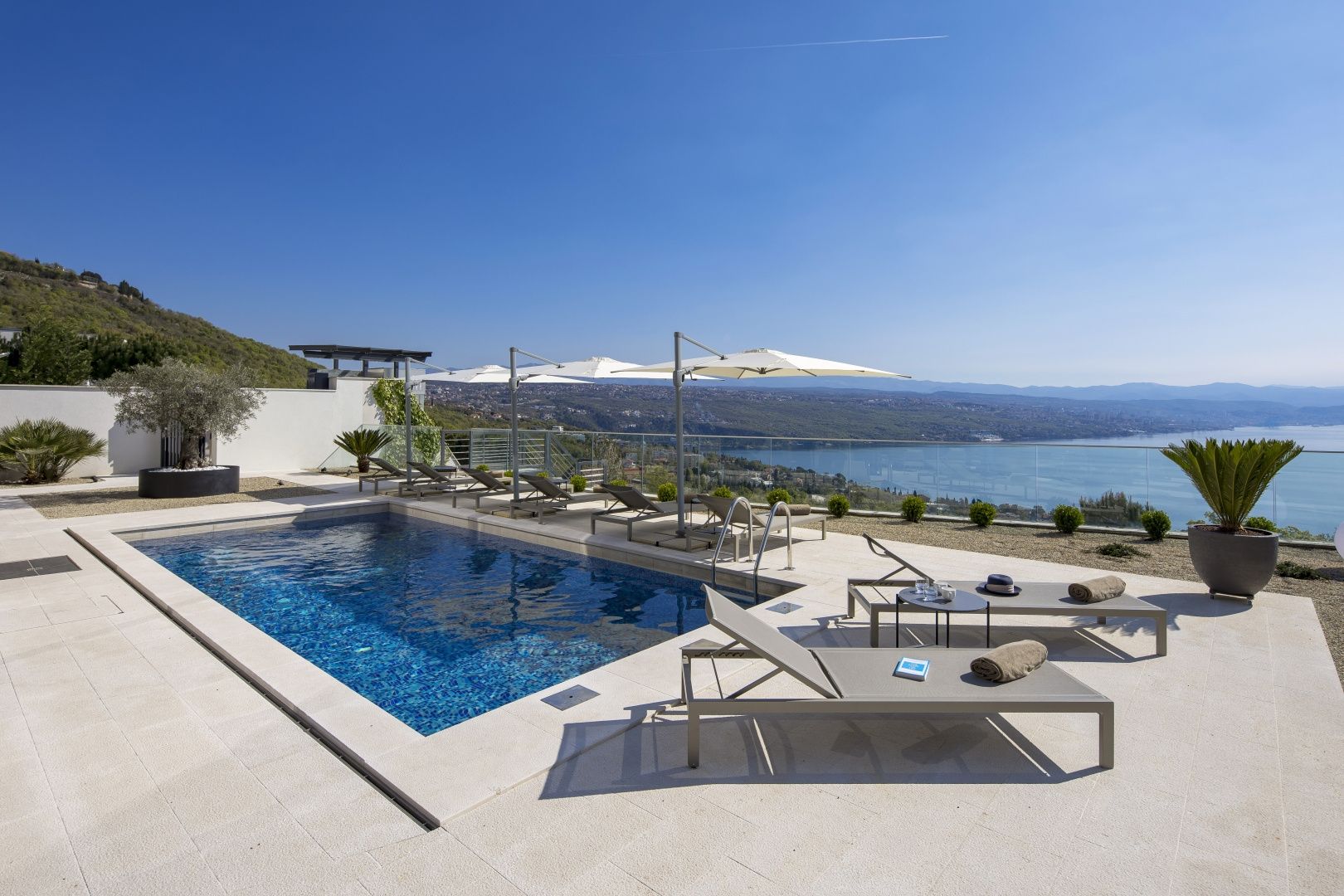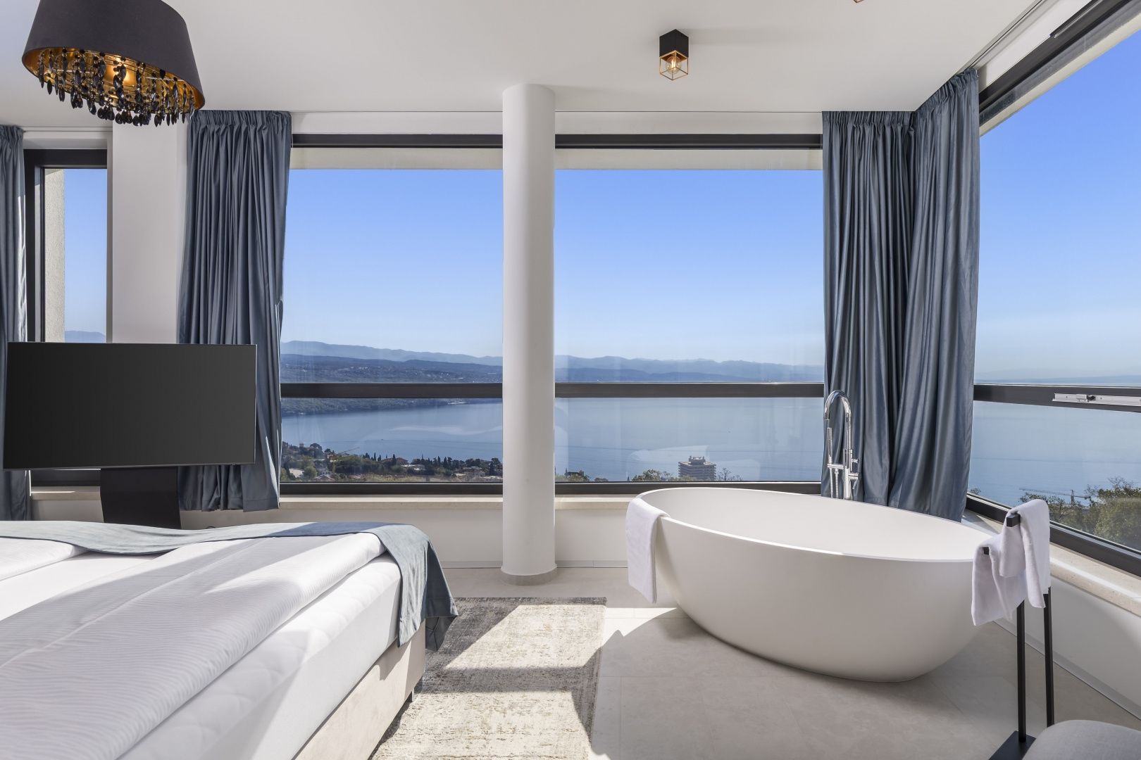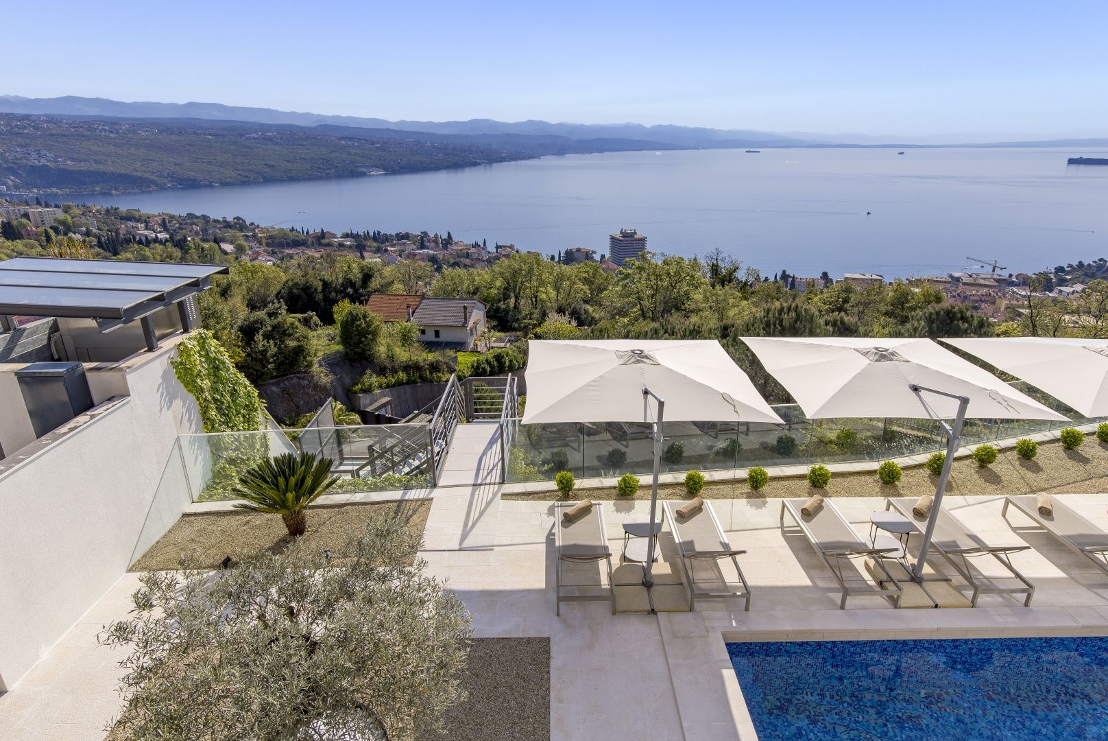 OPATIJA, CENTRUM – zimní pronájem v luxusní vile nad centrem Opatije, v klidné rezidenční čtvrti Nad centrem Opatije, v klidném a prestižním rezidenčním prostředí, se nachází exkluzivní moderní pětihvězdičková vila, která nabízí dokonalou kombinaci luxusu, soukromí a úžasného panoramatického výhledu na moře. V přízemí vily se nachází chodba vedoucí do jedné ložnice s vlastní koupelnou a prostorného obývacího pokoje, který je propojen s jídelnou a velkou kuchyní. Jižní část celého patra je od podlahy až ke stropu pokryta prosklenými stěnami, které poskytují pokojům dostatek přirozeného světla a přímý přístup na velkou terasu a k bazénu. V přízemí se nachází také prádelna a další toaleta. Venkovní prostor je obohacen o vyhřívanou vířivku, gril a terasu na opalování a moře se rozprostírá jako na dlani ze všech stran. V prvním patře se nacházejí zbývající čtyři ložnice, každá s vlastní elegantně zařízenou koupelnou, což zaručuje naprosté pohodlí a soukromí. Do vily se dostanete soukromým výtahem, který poskytuje zvláštní zážitek exkluzivity při příjezdu. Interiér vyzařuje sofistikovanost – vysoce kvalitní designový nábytek, moderní kuchyň a obývací pokoj s příjemnou atmosférou jsou ideální volbou pro zimní měsíce. Na oploceném pozemku je k dispozici soukromé kryté parkování. Vila je ze severní a východní strany obklopena lesními pozemky, zatímco poloha na jižní straně zaručuje naprosté soukromí a působivý výhled na Kvarnerský záliv. Cesta do centra Opatije trvá pouhé dvě minuty a do centra nebo na promenádu Lungomare se dostanete pěšky za 15 minut. Tato vila je k dispozici k zimnímu pronájmu od 1. října do 1. června, ideální pro ty, kteří hledají klid, pohodlí a prestiž v každém detailu. Měsíční nájemné: 8 000 € + poplatky. Pro sjednání prohlídky nemovitosti volejte s důvěrou makléře