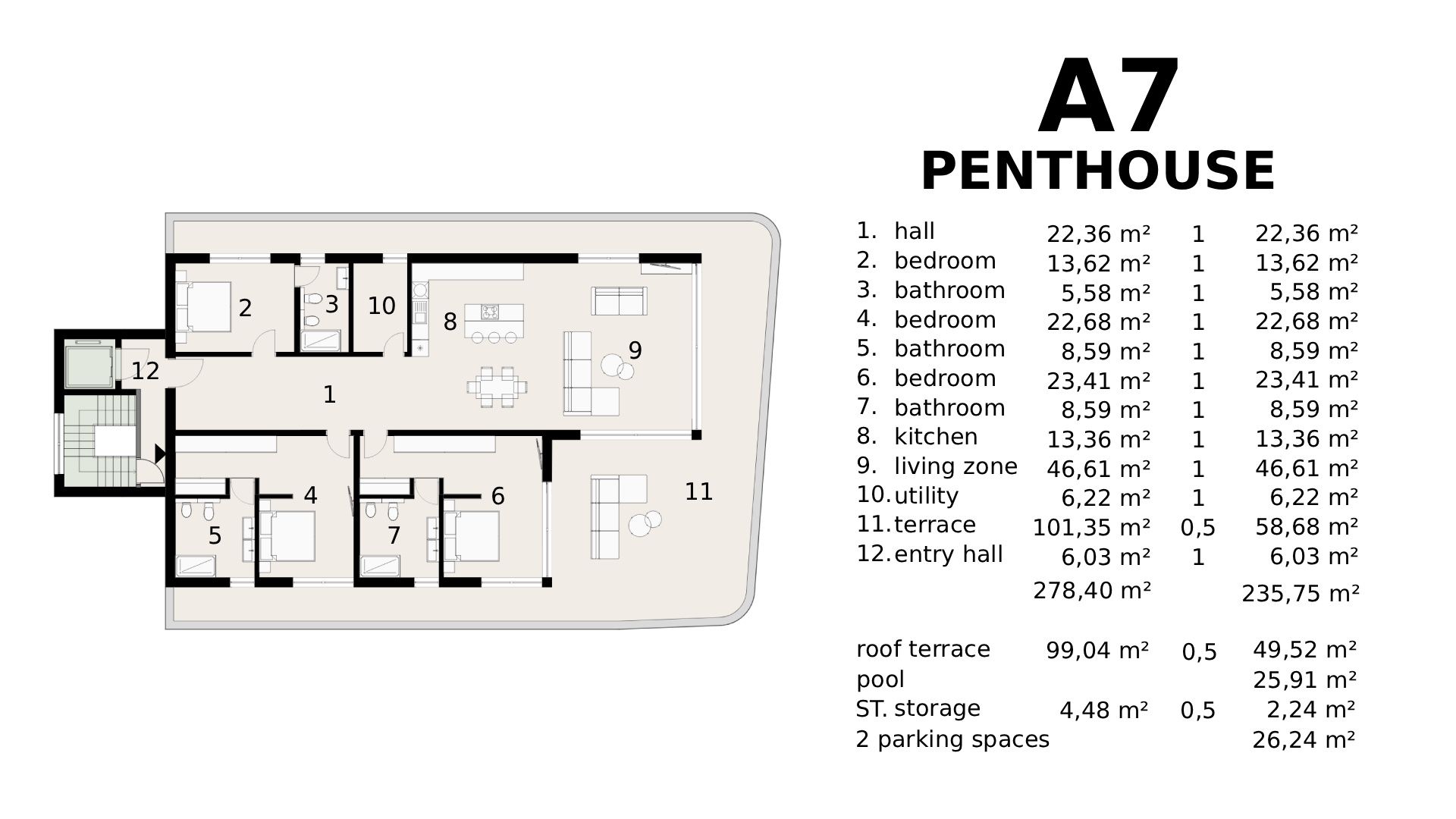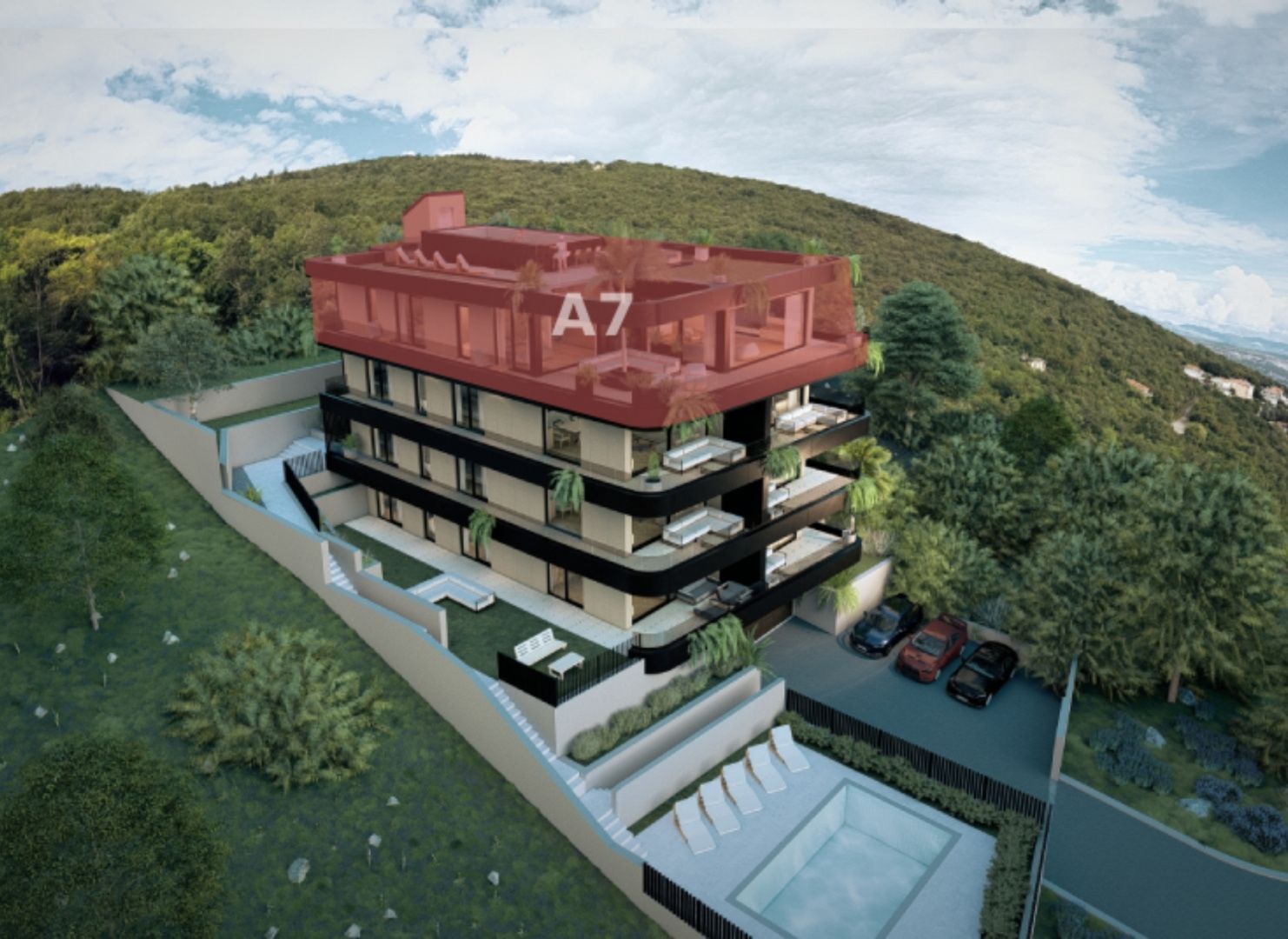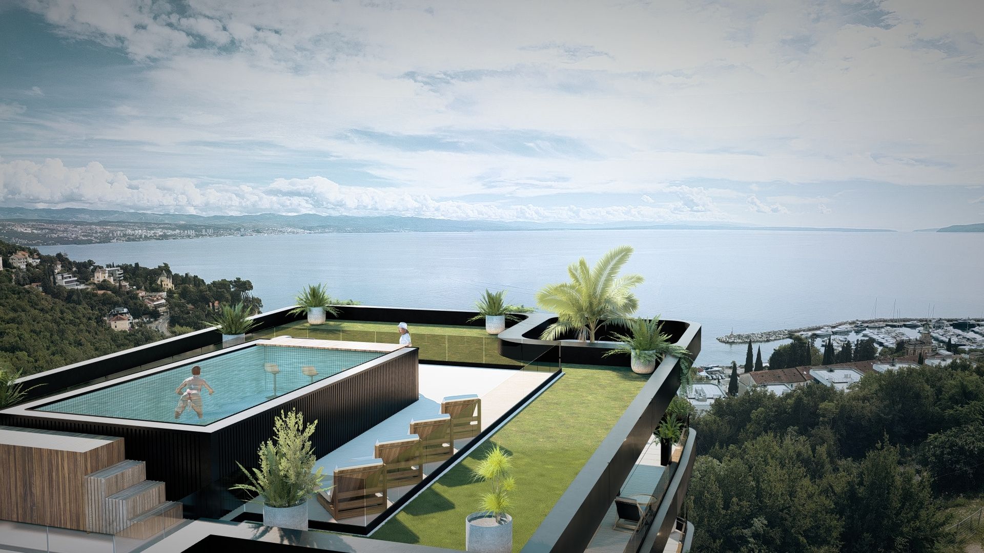 OPATIJA, IČIĆI - Penthouse se střešní terasou a soukromým bazénem Na prodej je exkluzivní penthouse 3S+DB s luxusní střešní terasou, soukromým bazénem a okouzlujícím panoramatickým výhledem na moře, přístav ACI a celý Kvarner. Tento penthouse, který se nachází v luxusní novostavbě se společným bazénem a podzemní garáží, nabízí soukromí, pohodlí a prestiž, jen pár minut chůze od moře a pláží Opatijské riviéry. Komplex sedmi prémiových apartmánů vyzařuje moderní design, minimalistickou eleganci a nejkvalitnější materiály, které zaručují dlouhou životnost, bezchybnou kvalitu a životní styl na úrovni luxusu. Apartmán se nachází v klidné části obce a kombinuje soukromí a klid, přičemž je vše na dosah ruky - pláže, přístav a prestižní zařízení. BYT A7 – PENTHOUSE • patro: penthouse • 3 ložnice, 3 koupelny • celková čistá plocha bytu (s koeficienty): 287,51 m² • vnitřní plocha bytu: 177,07 m² • terasa: 101,35 m² (58,68 m² s koeficienty) • střešní terasa: 99,04 m² (49,52 m² s koeficienty) • úložný prostor: 4,48 m² (2,24 m² s koeficienty) • soukromý bazén: 25,91 m² • 2 garážová parkovací místa: 26,24 m² Tento penthouse je navržen pro maximální pohodlí a luxusní životní styl. K dispozici je prostorná vstupní hala, úložný prostor, tři ložnice s vlastními koupelnami, prostorný obývací pokoj s kuchyní a jídelním koutem, který pokračuje na luxusní terasu - ideální místo pro setkávání a vychutnávání si nádherného výhledu na moře. Skutečnou hvězdou penthousu je střešní terasa se soukromým bazénem, která nabízí nezapomenutelný panoramatický výhled na Kvarner a okolí - ideální oázu pro relaxaci a užívání si slunce a západů slunce. Střešní terasa má soukromý přístup výtahem z bytu, což dále zvyšuje exkluzivitu a soukromí. Součástí bytu jsou také dvě parkovací místa v garáži a úložný prostor, který zajišťuje maximální pohodlí a komfort. VYBAVENÍ A TECHNOLOGIE • Odvětrávaná fasáda kombinuje moderní efektivitu a nadčasovou eleganci • Vnější hliníková okna Wicona s integrovaným alarmem • Systém vytápění a ohřevu teplé vody na tepelné čerpadlo pro maximální energetickou účinnost • Podlahové vytápění pro rovnoměrné vytápění • Diskrétně integrované klimatizační jednotky • Prvotřídní dřevěné podlahy a vysoce kvalitní dlažba • Bezpečnostní dveře a alarm • Garážová stání s možností nabíjení elektromobilů • Výtah z podzemní garáže s přímým přístupem na střešní terasu LOKALITA Soukromí, klid a exkluzivita jen pár minut chůze od pláží a přístavu, s rychlým spojením do centra Opatije. Ideální pro prestižní život u moře, luxusní dovolenou nebo investici do špičkového turistického ubytování. CENA Kompletně dokončený penthouse „na klíč“, bez nábytku. Cena je uvedena včetně DPH, kupující je osvobozen od daně z nemovitosti. Nákup prostřednictvím registrované společnosti v Chorvatsku umožňuje plné vrácení DPH. Tento projekt představuje středomořský životní styl definovaný luxusem, světlem a přírodou – domov pro ty, kteří hledají více než jen nemovitosti. OPATIJA: Opatija, známá jako „Královna Jadranu“, těší svou bohatou historií, luxusní architekturou Belle Epoque a velkolepou promenádou Lungomare. Její mírné klima, kombinace moře a hor a prvotřídní gastronomie z ní činí oblíbenou destinaci po celý rok. Opatija je perfektní volbou pro ty, kteří hledají sofistikovaný středomořský životní styl.