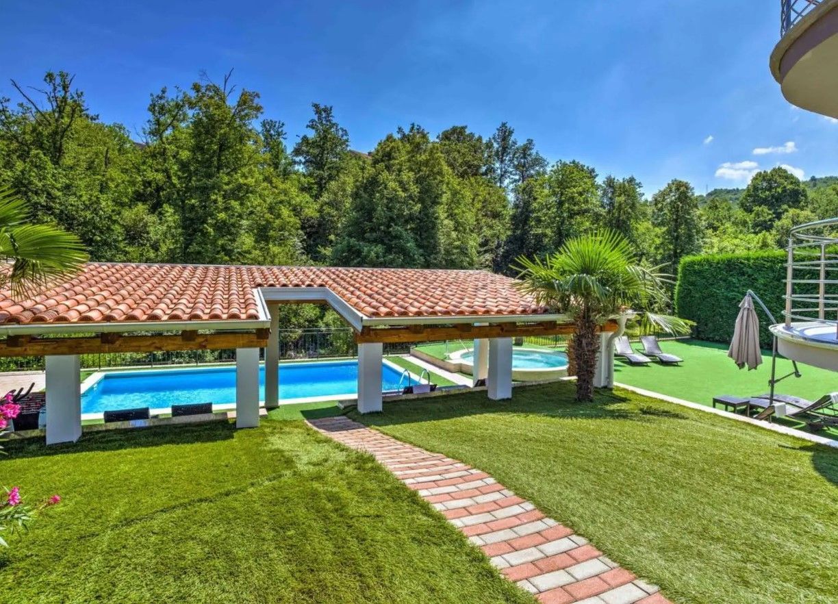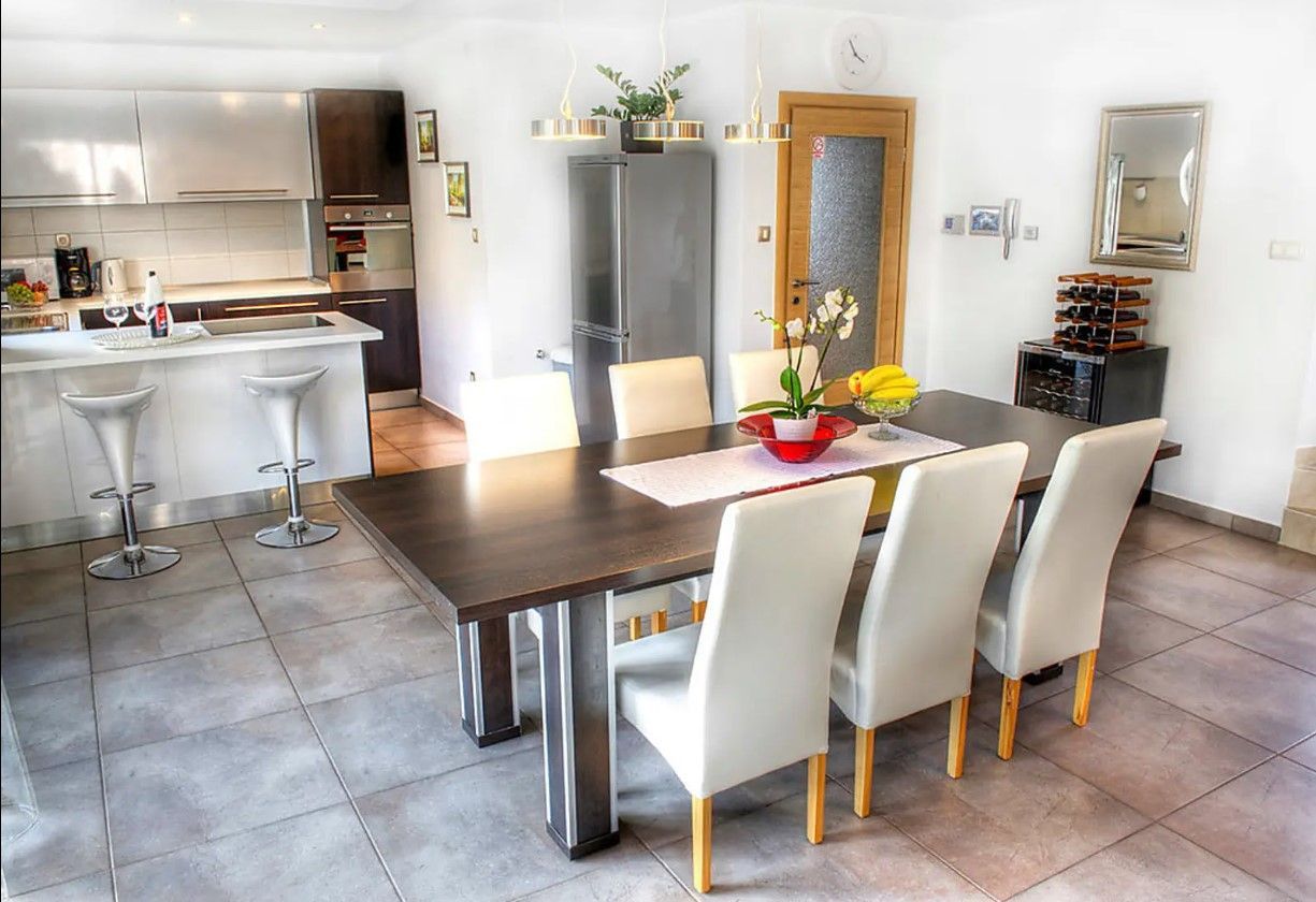 OPATIJA, POBRI – soukromý dům s bazénem a garáží v klidné vesnici nedaleko Opatije DUX reality nabízí moderní a prostorný dvojdomek o rozloze 210 m² s bazénem, garáží, terasou a zahradou. Dům se rozkládá na třech podlažích a nabízí krásný výhled na západ. Je vkusně zařízený a vybavený pro naprosté pohodlí. Prostorný obývací pokoj a jídelna (70 m²) zahrnují TV se satelitním přijímačem, DVD přehrávač, kamna na dřevo, klimatizaci a přístup do zahrady, na balkon a k bazénu. Otevřená kuchyň je plně vybavena troubou, myčkou nádobí, sklokeramickou varnou deskou, mikrovlnnou troubou, mrazákem a kávovarem. V přízemí se nachází další obývací pokoj s jídelnou (35 m²), TV a přístupem do prostorné zahrady a na terasu. Ložnice jsou vybaveny pohodlnými manželskými postelemi a jeden z pokojů má dvě samostatná lůžka. Všechny pokoje mají přístup na balkony s krásným výhledem na bazén a zeleň. Dům nabízí čtyři koupelny se sprchou nebo vanou a prostor je klimatizovaný a pro větší pohodlí vybaven podlahovým vytápěním. Venkovní prostory zahrnují tři prostorné balkony (35 m², 52 m²) a terasu (22 m²) s nábytkem a lehátky. K dispozici je bezplatné Wi-Fi a pračka. Garáž pro dvě auta poskytuje zabezpečené parkování. Tento krásný dům se nachází v naprosto soukromé lokalitě, bez sousedů, obklopen vysokými stromy a přírodou, a poskytuje tak naprostý klid a soukromí. Ideální prostředí pro relaxaci a užívání si přírody, ideální pro rodiny hledající luxus s výhledem na bazén a les. Cesta do Opatije trvá pouhé čtyři minuty. Pro sjednání prohlídky nemovitosti volejte s důvěrou makléři - konzultace v němčině je možná.