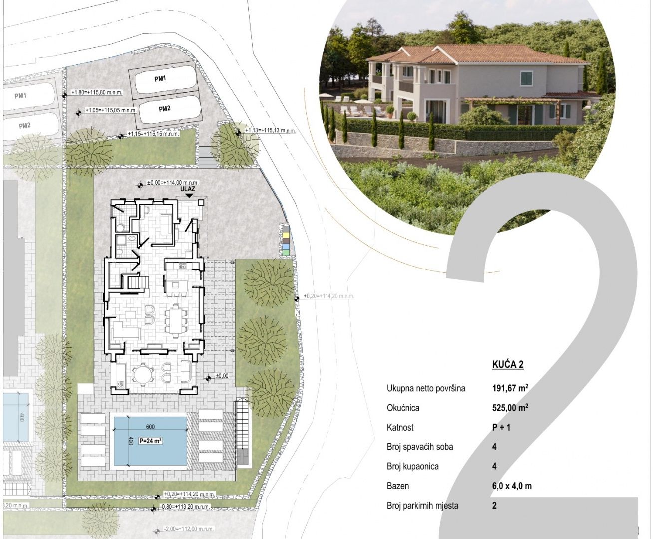 OSTROV KRK, DOBRINJ - Exkluzivní autentická nemovitost s moderním designem Představujeme vám exkluzivní příležitost na ostrově Krk! Moderní samostatně stojící vila se nachází v klidné vesnici nedaleko Šila, v luxusním komplexu šesti vil. Je určena pro kupující, kteří hledají dokonalou kombinaci středomořské tradice, moderního designu a naprostého soukromí. Vila je navržena jako moderní dvoupatrový dům s maximálním využitím prostoru, orientovaný na jih, plný přirozeného světla díky velkým proskleným stěnám. Rozložení místností je funkčně řešeno a pokrývá plochu 191,67 m2: - vstupní prostor: krytý venkovní vchod, vstupní hala, pracovna, koupelna, úložný prostor - obývací pokoj: prostorný obývací pokoj s jídelnou a kuchyní a vstupem na krytou terasu - spací prostor v prvním patře: tři ložnice, každá s vlastní koupelnou "en-suite" a vstupem na krytou terasu s úžasným výhledem na moře a okolní zeleň. - další venkovní úložný prostor / technická místnost Zahrada. 525 m2. Je zařízena v autentickém středomořském stylu s kamennými detaily a pečlivě plánovaným osvětlením. Ústřední místo zaujímá soukromý bazén o rozloze 24 m2, ideální pro letní osvěžení. Kromě grilu a upravených zelených ploch vila nabízí také dvě soukromá parkovací místa. Kámen a dřevo dominují exteriéru, které poskytují přirozenou izolaci a domorodé kouzlo. Masivní dřevěné trámy na terasách vytvářejí přirozený stín a rozpoznatelnou středomořskou atmosféru. Špičkový standard vybavení. - vytápění a chlazení: podlahové vytápění v celém domě, klimatizace ve všech místnostech. - zabezpečení: alarm, video dohled a bezpečnostní dveře. - materiály: vysoce kvalitní PVC truhlářské výrobky, vysoce kvalitní keramika a sanitární keramika od renomovaných výrobců. Vila se prodává na klíč (plánované dokončení v roce 2027). Výhody lokality a investice. Vila se nachází 2700 metrů vzdušnou čarou od moře, nabízí klid bez turistického hluku a zároveň je vynikající příležitostí pro investici do turistického pronájmu. Vzhledem k tomu, že cena zahrnuje DPH, je kupující osvobozen od placení daně z nemovitosti. Architektura, která představuje tradiční stavitelství v moderním hávu. Žádný kompromis mezi tradicí a moderním luxusem. Jste jen krok od svého nového domova, kde byl každý detail pečlivě vybrán, aby vám poskytl tu nejlepší atmosféru a pobyt v tomto jedinečném příběhu. S důvěrou nás kontaktujte a domluvte si soukromou schůzku. ***
