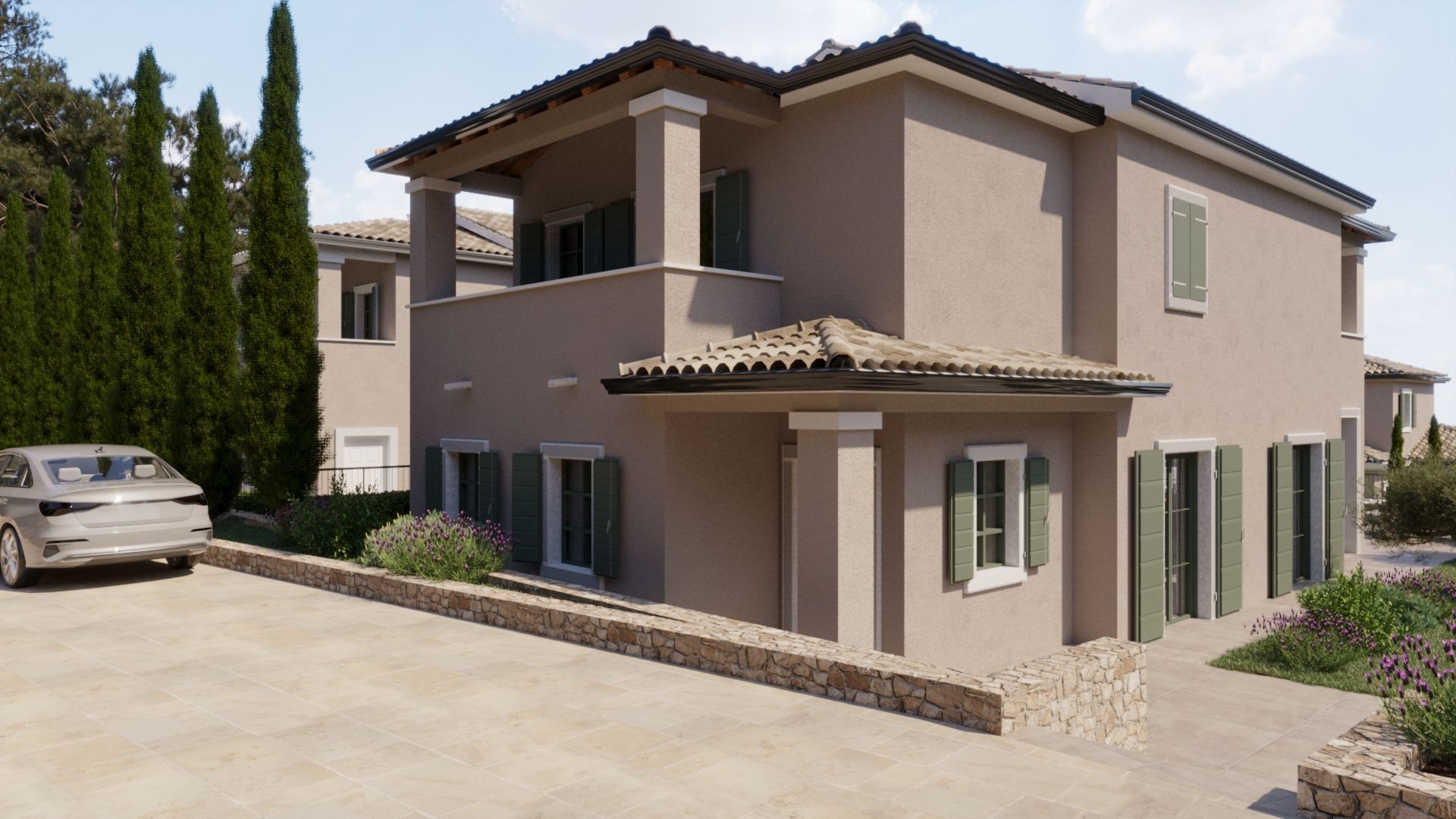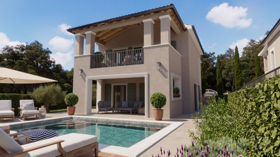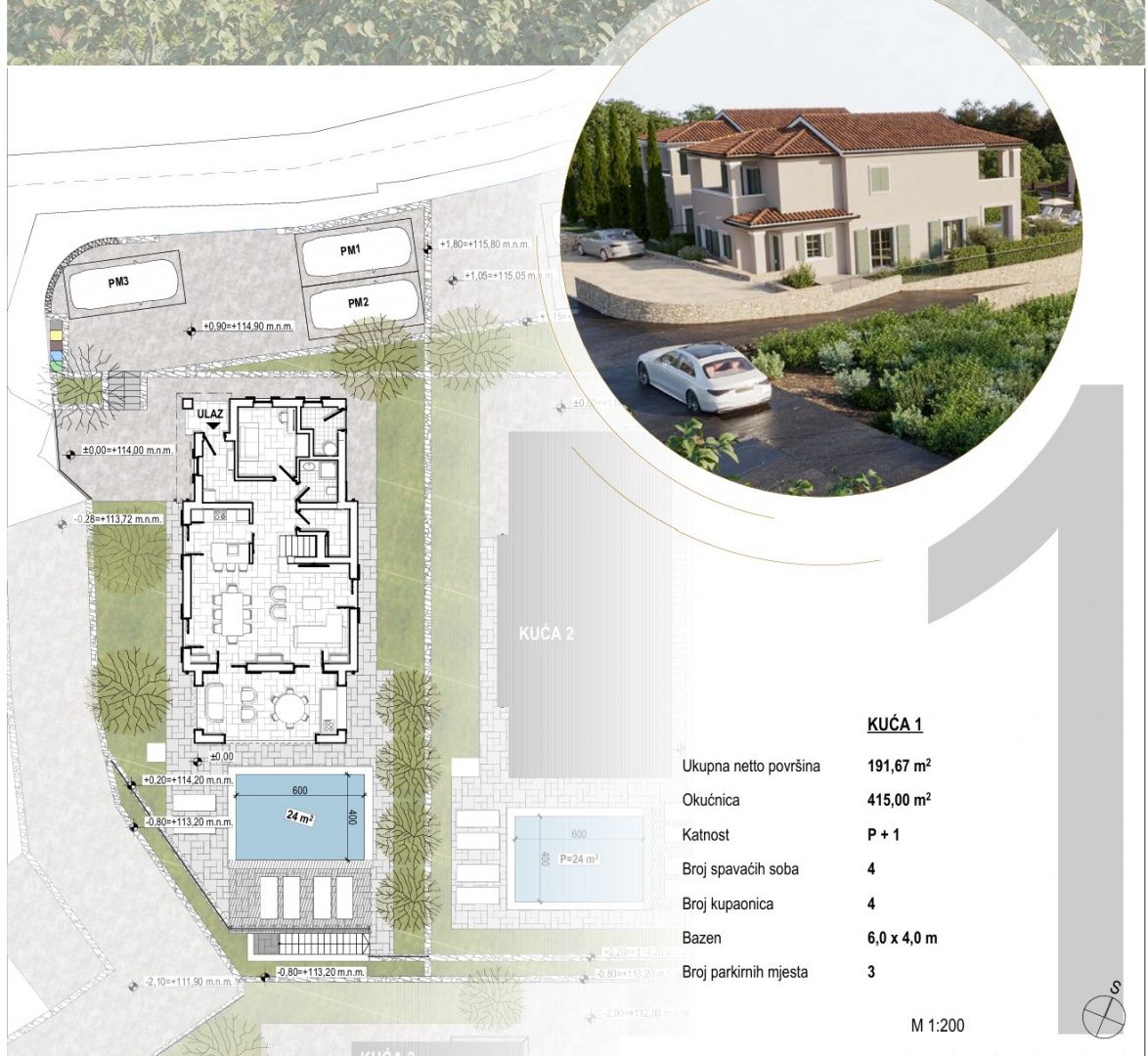 OSTROV KRK, DOBRINJ - Fantastická středomořská vila s bazénem Představujeme vám exkluzivní příležitost na ostrově Krk! Moderní samostatně stojící vila se nachází v klidné vesnici nedaleko Šila, v luxusním komplexu šesti vil. Je určena pro kupující, kteří hledají dokonalou kombinaci středomořské tradice, moderního designu a naprostého soukromí. Vila je navržena jako moderní dvoupatrový dům s maximálním využitím prostoru, orientovaný na jih, plný přirozeného světla díky velkým proskleným stěnám. Rozložení místností je funkčně řešeno a pokrývá plochu 191,67 m2: - vstupní prostor: krytý venkovní vchod, vstupní hala, pracovna, koupelna, úložný prostor - obývací pokoj: prostorný obývací pokoj s jídelnou a kuchyní a vstupem na krytou terasu - spací prostor v prvním patře: tři ložnice, každá s vlastní koupelnou "en-suite" a vstupem na krytou terasu s úžasným výhledem na moře a okolní zeleň. - další venkovní úložný prostor / technická místnost Zahrada. 415 m2. Je zařízena v autentickém středomořském stylu s kamennými detaily a pečlivě plánovaným osvětlením. Ústřední místo zaujímá soukromý bazén o rozloze 24 m2, ideální pro letní osvěžení. Kromě grilu a upravených zelených ploch vila nabízí také tři soukromá parkovací místa. Kámen a dřevo dominují exteriéru, které poskytují přirozenou izolaci a domorodé kouzlo. Masivní dřevěné trámy na terasách vytvářejí přirozený stín a rozpoznatelnou středomořskou atmosféru. Špičkový standard vybavení. - vytápění a chlazení: podlahové vytápění v celém domě, klimatizace ve všech místnostech. - zabezpečení: alarm, video dohled a bezpečnostní dveře. - materiály: vysoce kvalitní PVC truhlářské výrobky, vysoce kvalitní keramika a sanitární keramika od renomovaných výrobců. Vila se prodává na klíč (plánované dokončení v roce 2027). Výhody lokality a investice. Vila se nachází 2700 metrů vzdušnou čarou od moře, nabízí klid bez turistického hluku a zároveň je vynikající příležitostí pro investici do turistického pronájmu. Vzhledem k tomu, že cena zahrnuje DPH, je kupující osvobozen od placení daně z nemovitosti. Architektura, která představuje tradiční stavitelství v moderním hávu. Žádný kompromis mezi tradicí a moderním luxusem. Jste jen krok od svého nového domova, kde byl každý detail pečlivě vybrán, aby vám poskytl tu nejlepší atmosféru a pobyt v tomto jedinečném příběhu. S důvěrou nás kontaktujte a domluvte si soukromou schůzku. ***