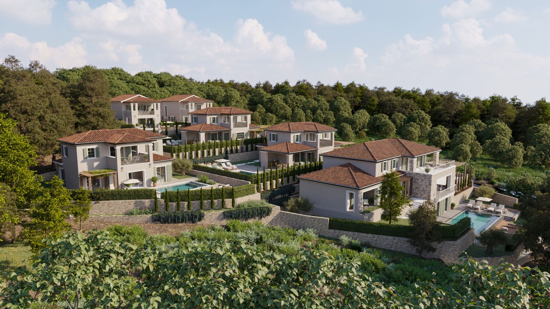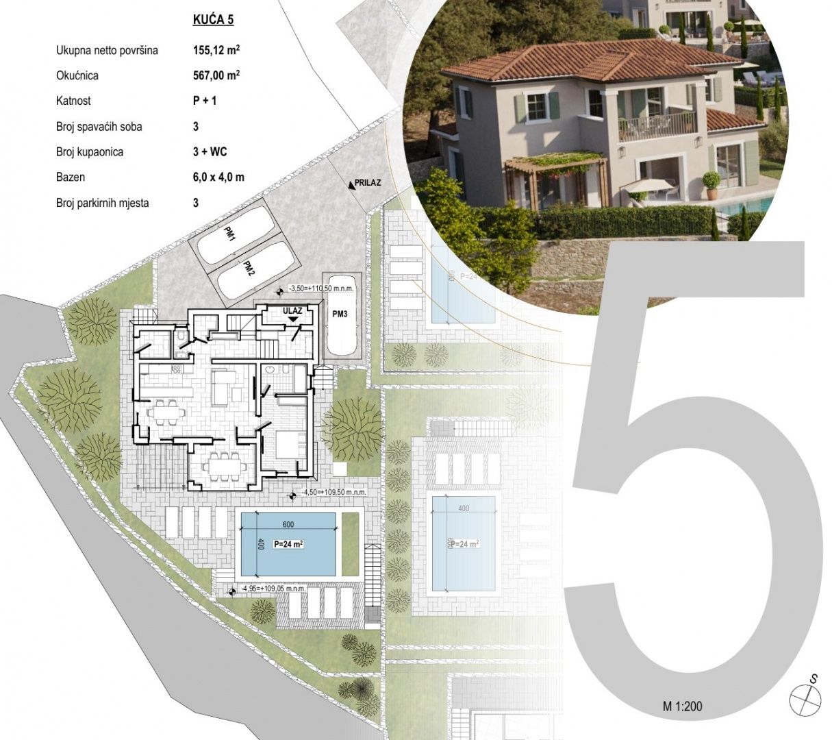 OSTROV KRK, DOBRINJ - Luxusní středomořská vila s bazénem. Autentické detaily! Představujeme vám exkluzivní příležitost na ostrově Krk! Moderní samostatně stojící vila se nachází v klidné vesnici nedaleko Šila, v luxusním komplexu šesti vil. Je určena pro kupující, kteří hledají dokonalou kombinaci středomořské tradice, moderního designu a naprostého soukromí. Vila je navržena jako moderní dvoupatrový dům s maximálním využitím prostoru, orientovaný na jih, plný přirozeného světla díky velkým proskleným stěnám. Dispozice místností je funkčně řešena a pokrývá plochu 155,12 m2: - vstupní prostor: krytý venkovní vchod, vstupní hala, úložný prostor, toaleta pro hosty - obývací pokoj: prostorný obývací pokoj s jídelnou a kuchyní a vstupem na krytou terasu, ložnice s vlastní koupelnou - spací prostor v prvním patře: dvě ložnice, každá s vlastní koupelnou "en-suite" a vstupem na krytou terasu, prádelna; Jeden pokoj má další místnost, kterou lze využít jako pracovnu nebo šatnu - další venkovní úložný prostor / technická místnost Zahrada. 567 m2. Je zařízena v autentickém středomořském stylu s kamennými detaily a pečlivě plánovaným osvětlením. Centrální místo zaujímá soukromý bazén o rozloze 24 m2, ideální pro letní osvěžení. Kromě grilu a upravených zelených ploch vila nabízí také tři soukromá parkovací místa. Kámen a dřevo dominují exteriéru, které poskytují přirozenou izolaci a domorodé kouzlo. Masivní dřevěné trámy na terasách vytvářejí přirozený stín a rozpoznatelnou středomořskou atmosféru. Špičkový standard vybavení. - vytápění a chlazení: podlahové vytápění v celém domě, klimatizace ve všech místnostech. - zabezpečení: alarm, video dohled a bezpečnostní dveře. - materiály: vysoce kvalitní PVC truhlářství, vysoce kvalitní keramika a sanitární keramika od renomovaných výrobců. Vila se prodává na klíč (plánované dokončení v roce 2027). Výhody lokality a investice. Vila, která se nachází 2700 metrů od moře, nabízí klid bez turistického hluku a zároveň je vynikající příležitostí k investici do turistického pronájmu. Vzhledem k tomu, že DPH je zahrnuta v ceně, je kupující osvobozen od placení daně z nemovitosti. Architektura, která představuje tradiční stavbu v moderním hávu. Žádný kompromis mezi tradicí a moderním luxusem. Jste jen krok od svého nového domova, kde byl každý detail pečlivě vybrán, aby vám poskytl tu nejlepší atmosféru a pobyt v tomto jedinečném příběhu. Kontaktujte nás s důvěrou a domluvte si soukromou schůzku. ***