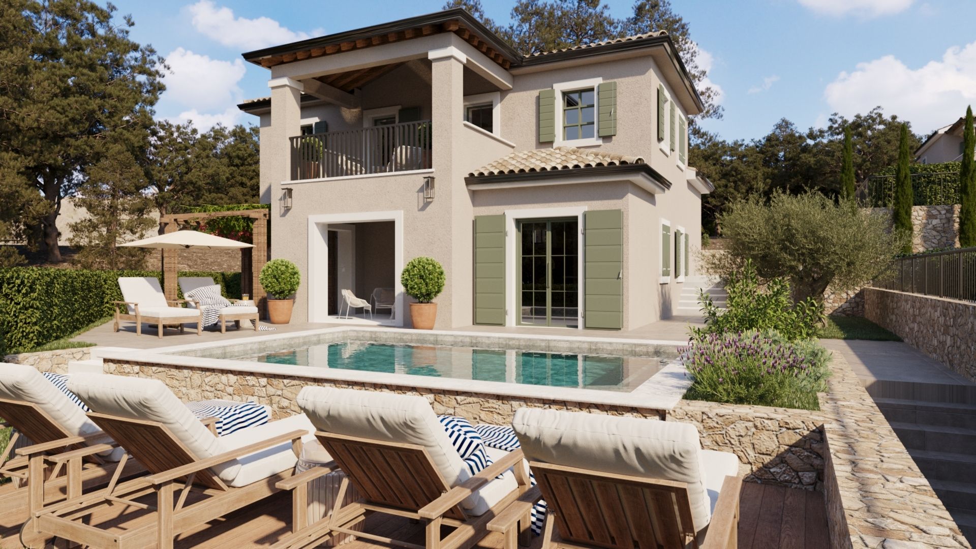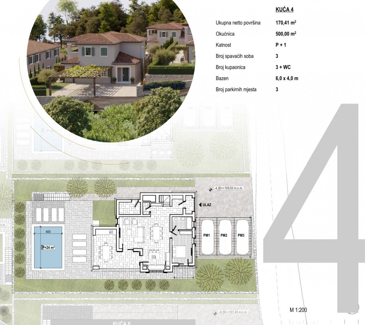 OSTROV KRK, DOBRINJ - Nová vila s bazénem, dřevěnými pergolami a středomořskou zahradou Představujeme vám exkluzivní příležitost na ostrově Krk! Moderní samostatně stojící vila se nachází v klidné vesnici nedaleko Šila, v luxusním komplexu šesti vil. Je určena pro kupující, kteří hledají dokonalou kombinaci středomořské tradice, moderního designu a naprostého soukromí. Vila je navržena jako moderní dvoupatrový dům s maximálním využitím prostoru, orientovaný na jih, plný přirozeného světla díky velkým proskleným stěnám. Rozložení místností je funkčně řešeno a pokrývá plochu 170,41 m2: - vstupní prostor: krytý venkovní vchod, vstupní hala, ložnice s koupelnou, toaleta pro hosty - obývací pokoj: prostorný obývací pokoj s jídelním koutem a kuchyní a vstupem na krytou terasu - spací prostor v prvním patře: dvě ložnice, každá s vlastní koupelnou "en-suite" a vstupem na krytou terasu, prádelna; Jeden pokoj má další místnost, kterou lze využít jako pracovnu nebo šatnu - další venkovní úložný prostor / technická místnost Zahrada. 500 m2. Je zařízena v autentickém středomořském stylu s kamennými detaily a pečlivě plánovaným osvětlením. Centrální místo zaujímá soukromý bazén o rozloze 24 m2, ideální pro letní osvěžení. Kromě grilu a upravených zelených ploch vila nabízí také tři soukromá parkovací místa. Kámen a dřevo dominují exteriéru, které poskytují přirozenou izolaci a domorodé kouzlo. Masivní dřevěné trámy na terasách vytvářejí přirozený stín a rozpoznatelnou středomořskou atmosféru. Špičkový standard vybavení. - vytápění a chlazení: podlahové vytápění v celém domě, klimatizace ve všech místnostech. - zabezpečení: alarm, video dohled a bezpečnostní dveře. - materiály: vysoce kvalitní PVC truhlářství, špičková keramika a sanitární keramika od renomovaných výrobců. Vila se prodává na klíč (plánované dokončení v roce 2027). Výhody lokality a investice. Vila, která se nachází 2700 metrů od moře, nabízí klid bez turistického hluku a zároveň je vynikající příležitostí k investici do turistického pronájmu. Vzhledem k tomu, že DPH je zahrnuta v ceně, je kupující osvobozen od placení daně z nemovitosti. Architektura, která představuje tradiční stavbu v moderním hávu. Žádný kompromis mezi tradicí a moderním luxusem. Jste jen krok od svého nového domova, kde byl každý detail pečlivě vybrán, aby vám poskytl tu nejlepší atmosféru a pobyt v tomto jedinečném příběhu. Kontaktujte nás s důvěrou a domluvte si soukromou schůzku. ***